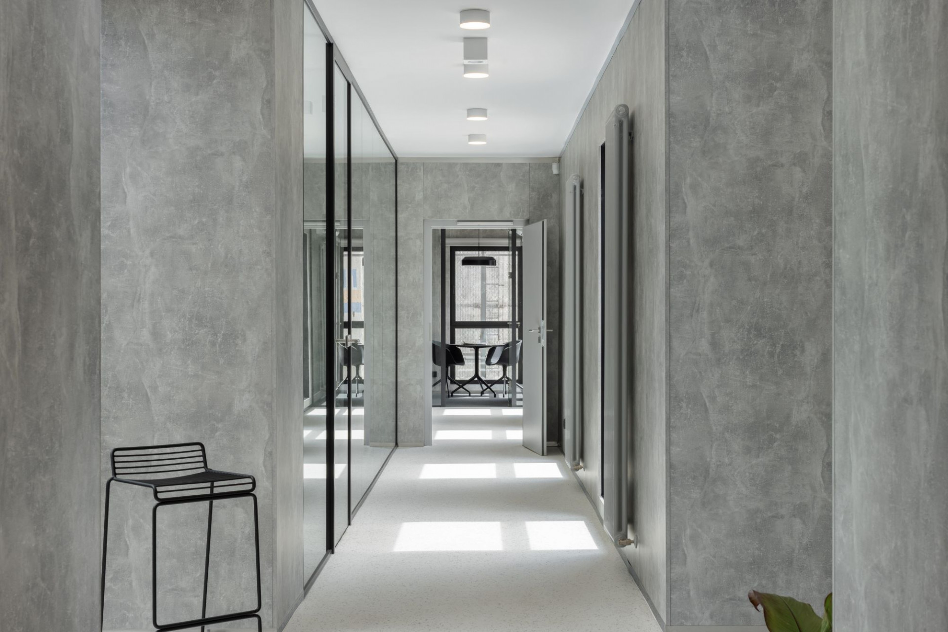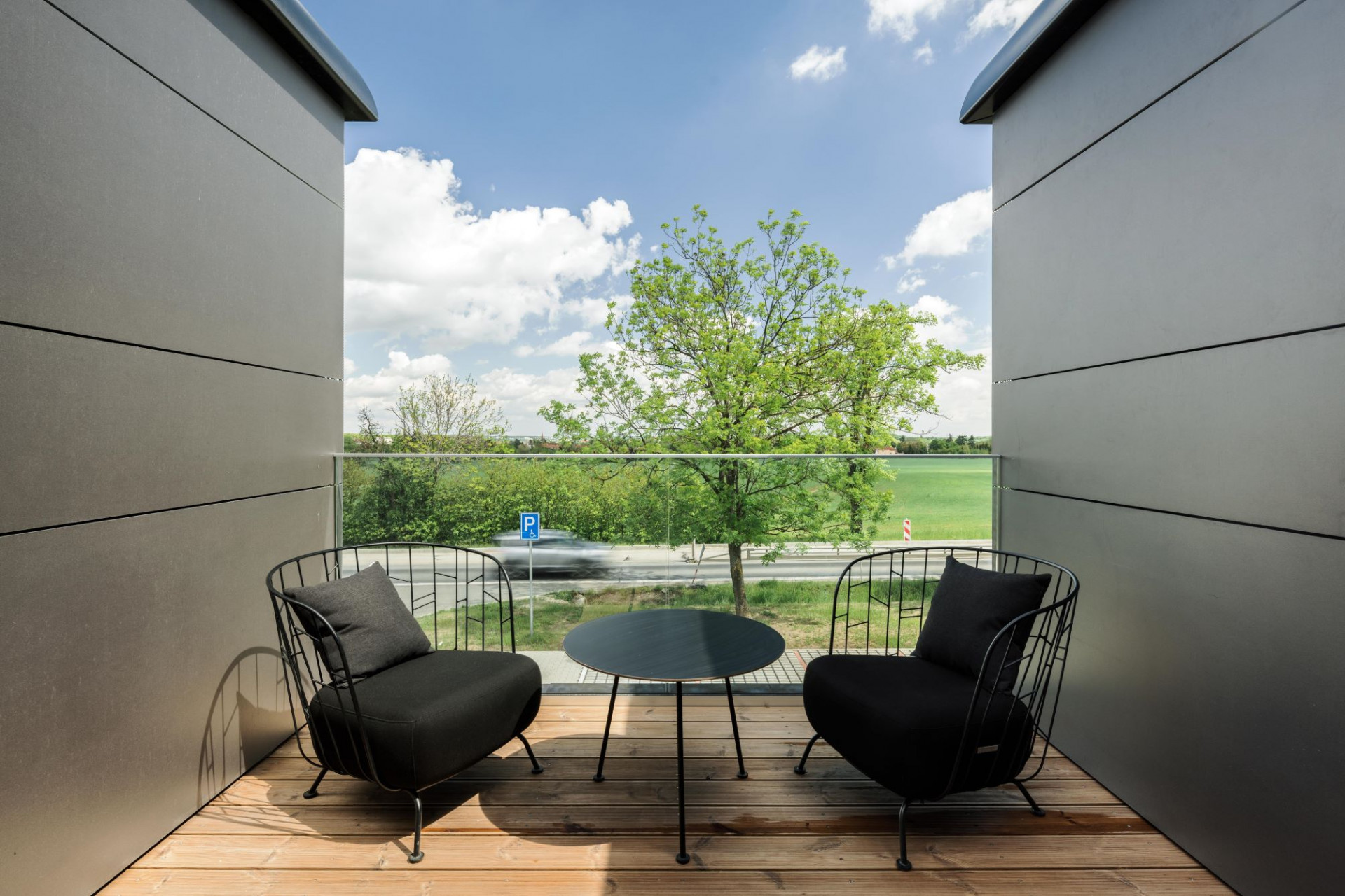 V interiérech budovy převládají plochy industriálního dekoru betonu a kovu doplněné o obklad z masivního dřeva, který naopak dodává prostorům hřejivost a útulnost. Prosklené vnitřní příčky podporují vzdušnost interiéru. Dobrým světelným podmínkám vnitřních prostor napomáhají i velká okna v masivních černých rámech se sníženým parapetem. Vnější vzhled budovy odpovídá tvarosloví řady Fashion Line s typickými zaoblenými liniemi. Fasádu tvoří zvlněný děrovaný plech. Odkaz na prvky industriální architektury tak nalezneme uvnitř i vně domu.