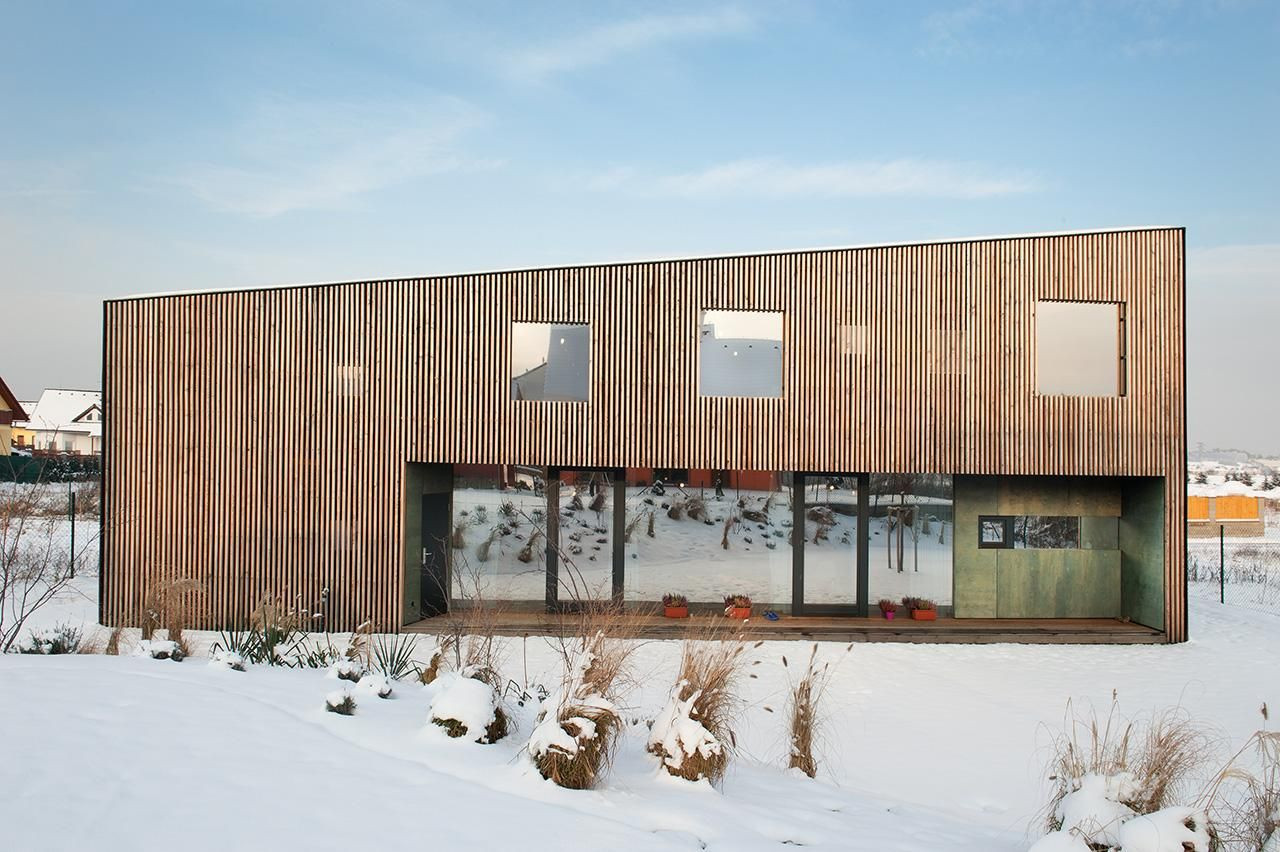 Prostory předzahrádky a zahrady jsou propojeny s interiérem lodžií a závětřím. Tvar domu se záměrně otevírá k jižnímu nároží za sluncem, naopak k severu se uzavírá. Jihozápadní fasáda domu s okny do obytných místností je chráněna slunolamem z modřínových hranolů. Ostatní fasády včetně střechy jsou provedeny z celoplošně lepené EPDM fólie.