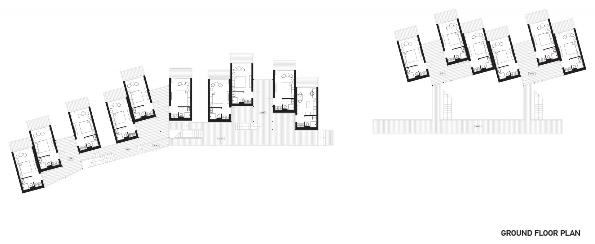 Hotel se skládá ze tří hlavních bloků – 32 standardních pokojů, několika samostatných apartmánů a budovy s recepcí. Jeden standardní pokoj nabízí zhruba 18 metrů čtverečních užitné plochy, přičemž hlavní lákadlo představuje výhled z prosvětlených buněk. Navštěvníkům se přímo při pohledu z postele rozprostírá živý obraz přilehlého jezera obklopeného stromy.