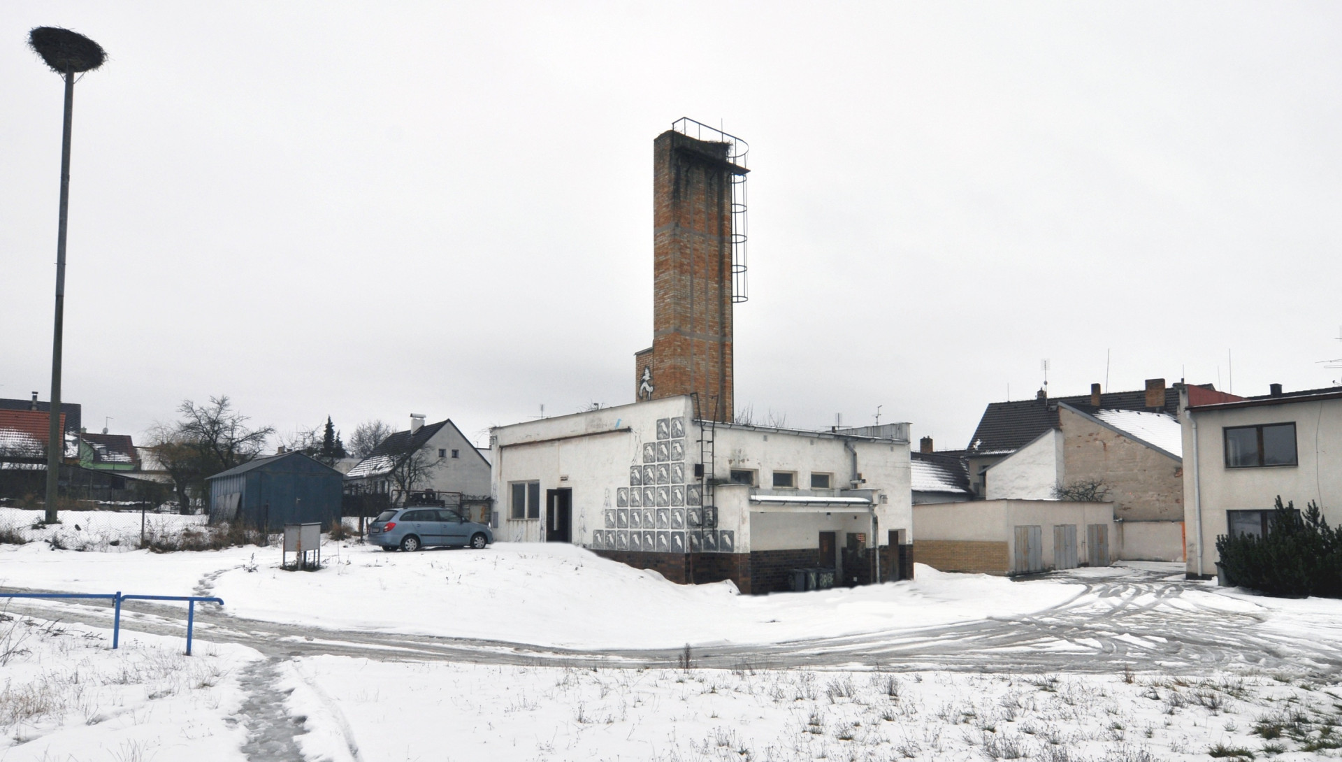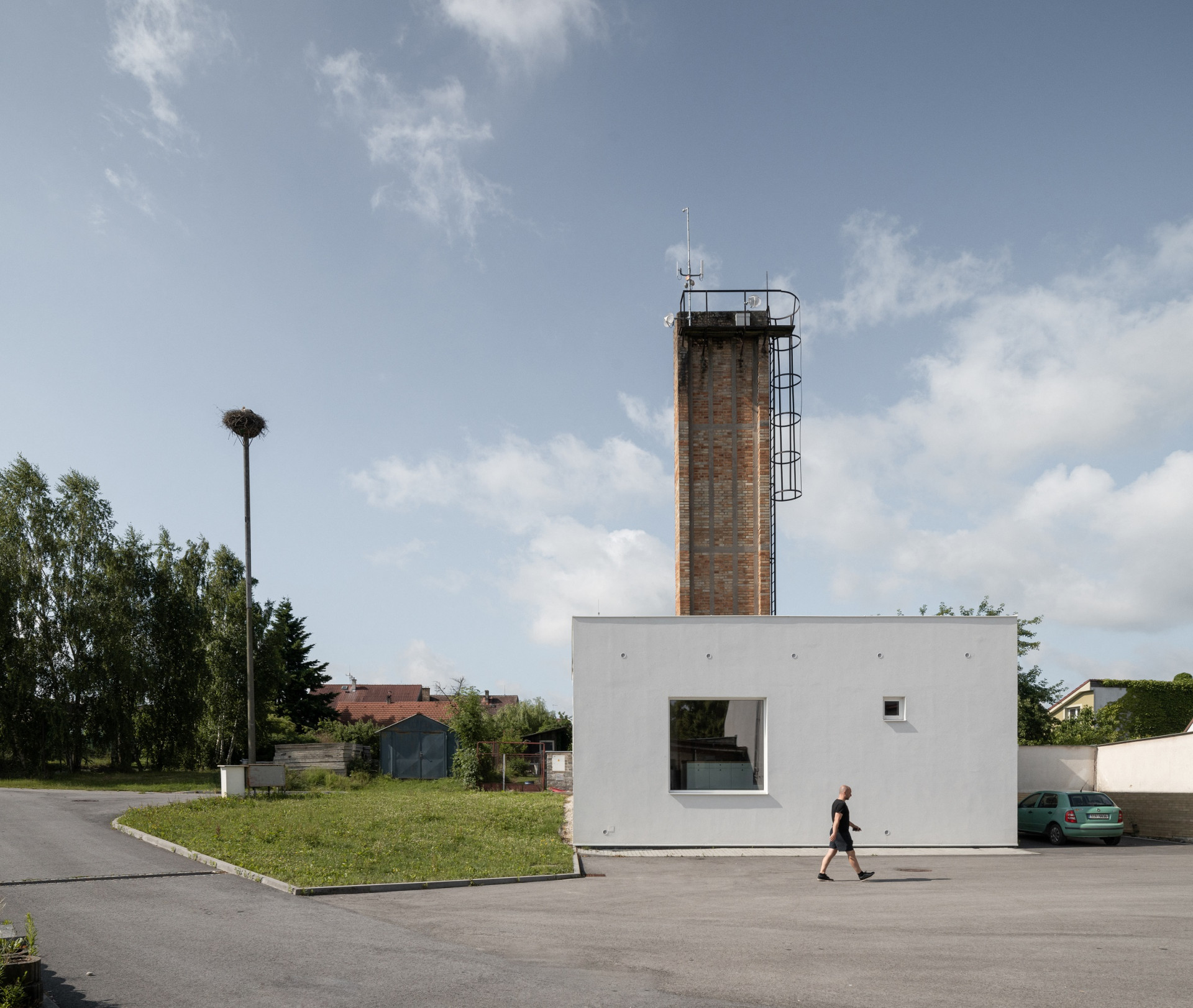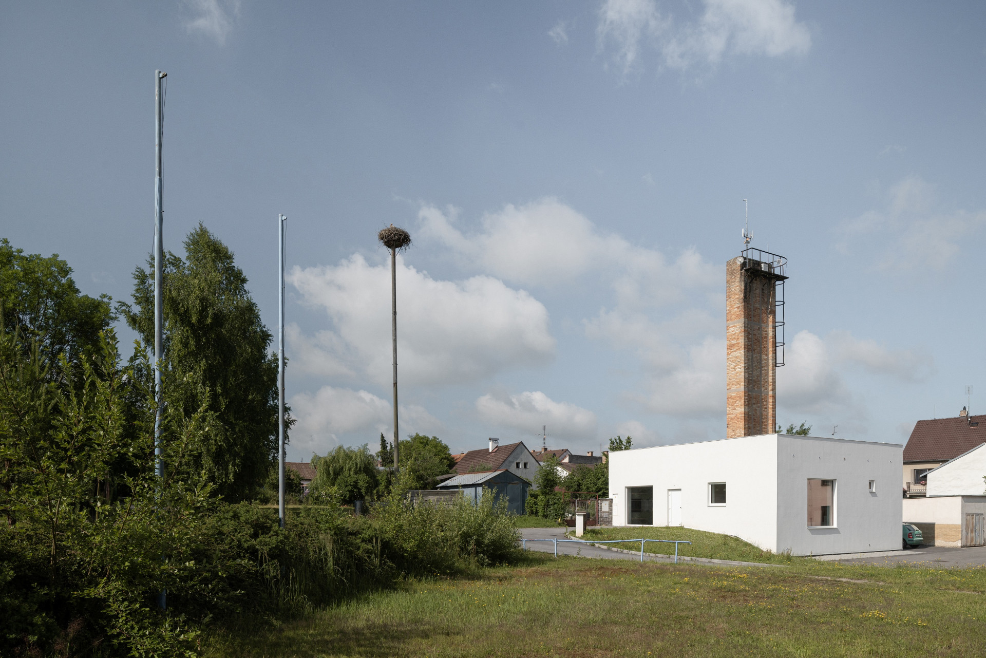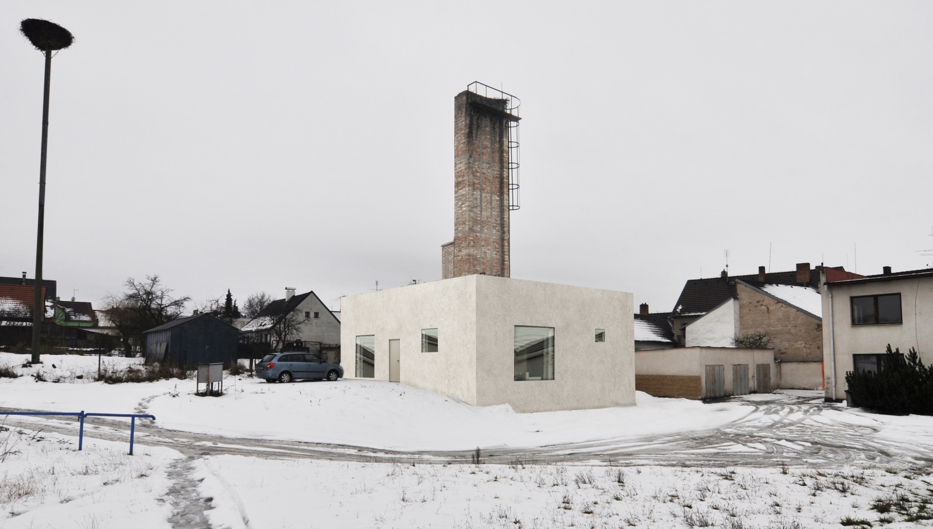 Minimalistický kvádr s vysokým cihlovým komínem slouží jako prostory odborných učeben základní školy v jihočeských Ledenicích. Původní funkce malého objektu však bývala zcela jiná – dodnes ji naznačuje vysoký cihlový komín.