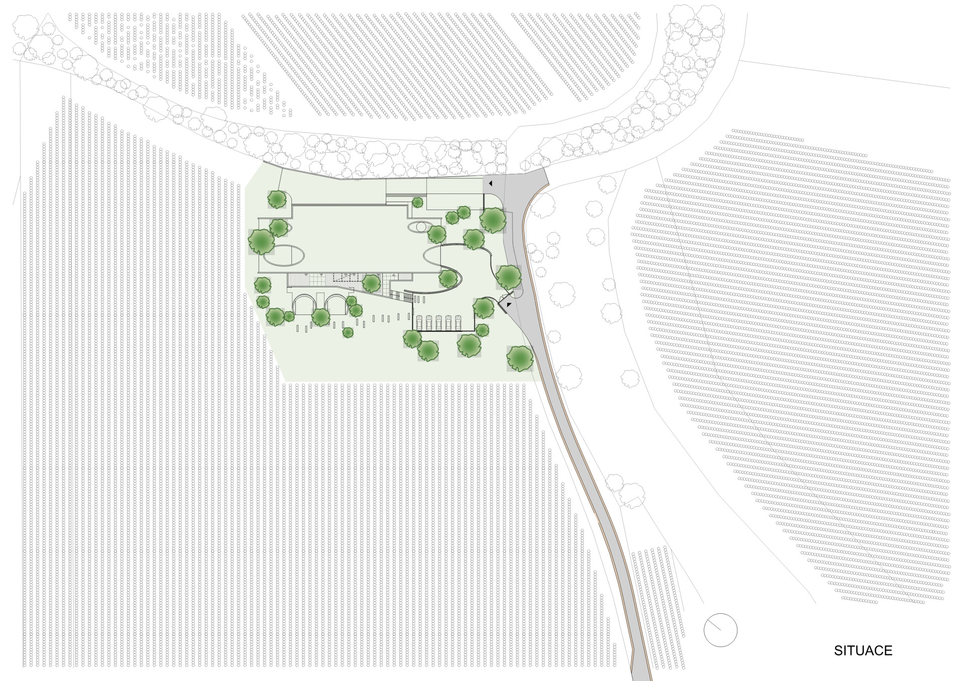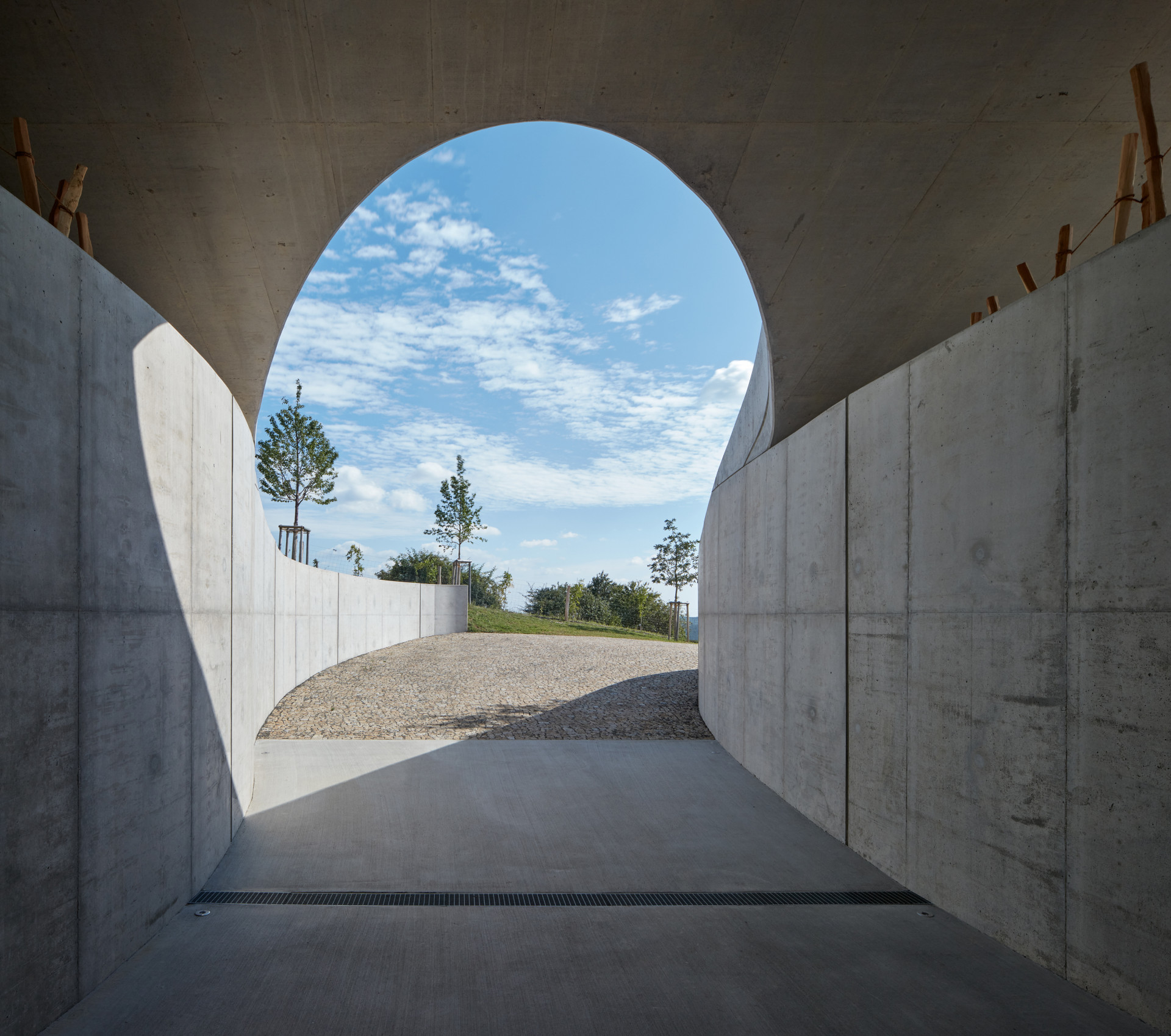 Architekt Aleš Fiala na svém návrhu akcentuje propojení vnitřních prostorů s okolní krajinou. Proto železobetonovou stavbu na několika místech prorazil velkoformátovými okny. Přízemí se směrem ven otevírá celé a přelévá se v rozlehlou terasu. Na té bude víno chutnat.