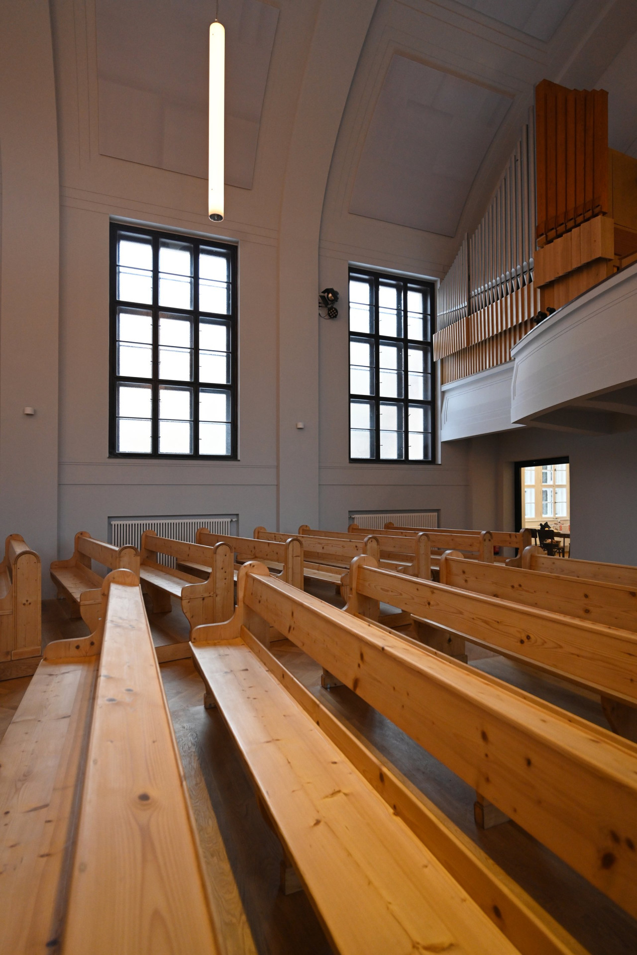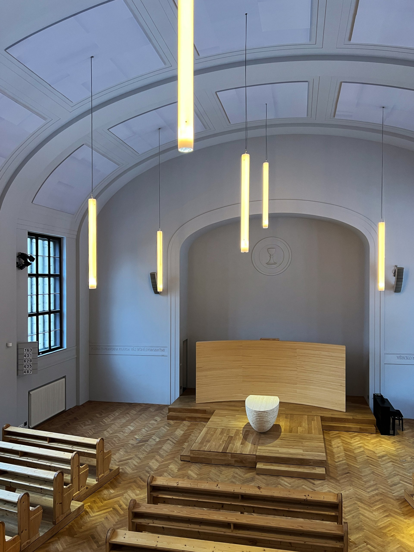 Trochu agresivně barevný žlutý a hnědý interiér architekti sjednotili a spojili. Zlepšili akustiku, takže je tu teď lépe rozumět kázání, ale prostor lze používat také pro koncerty. Další podstatná změna je nábytek – lavice získaly pojízdné podložky, takže je možné je odvézt ke straně a díky tomu tu tančit, za působení kazatele (a tanečníka) Klačka se konaly dokonce taneční bohoslužby.