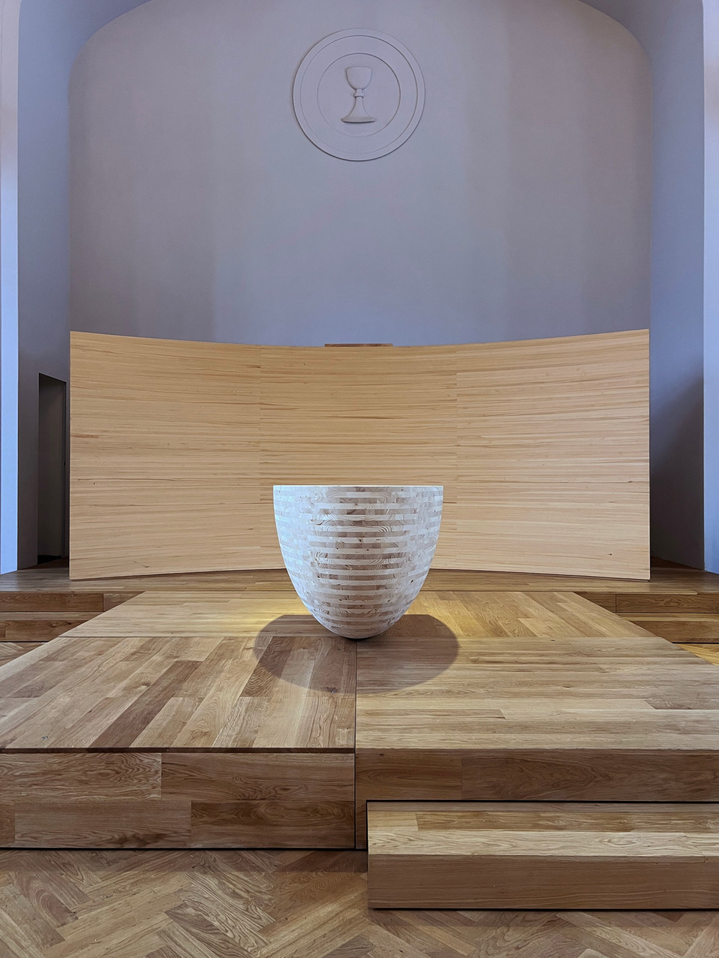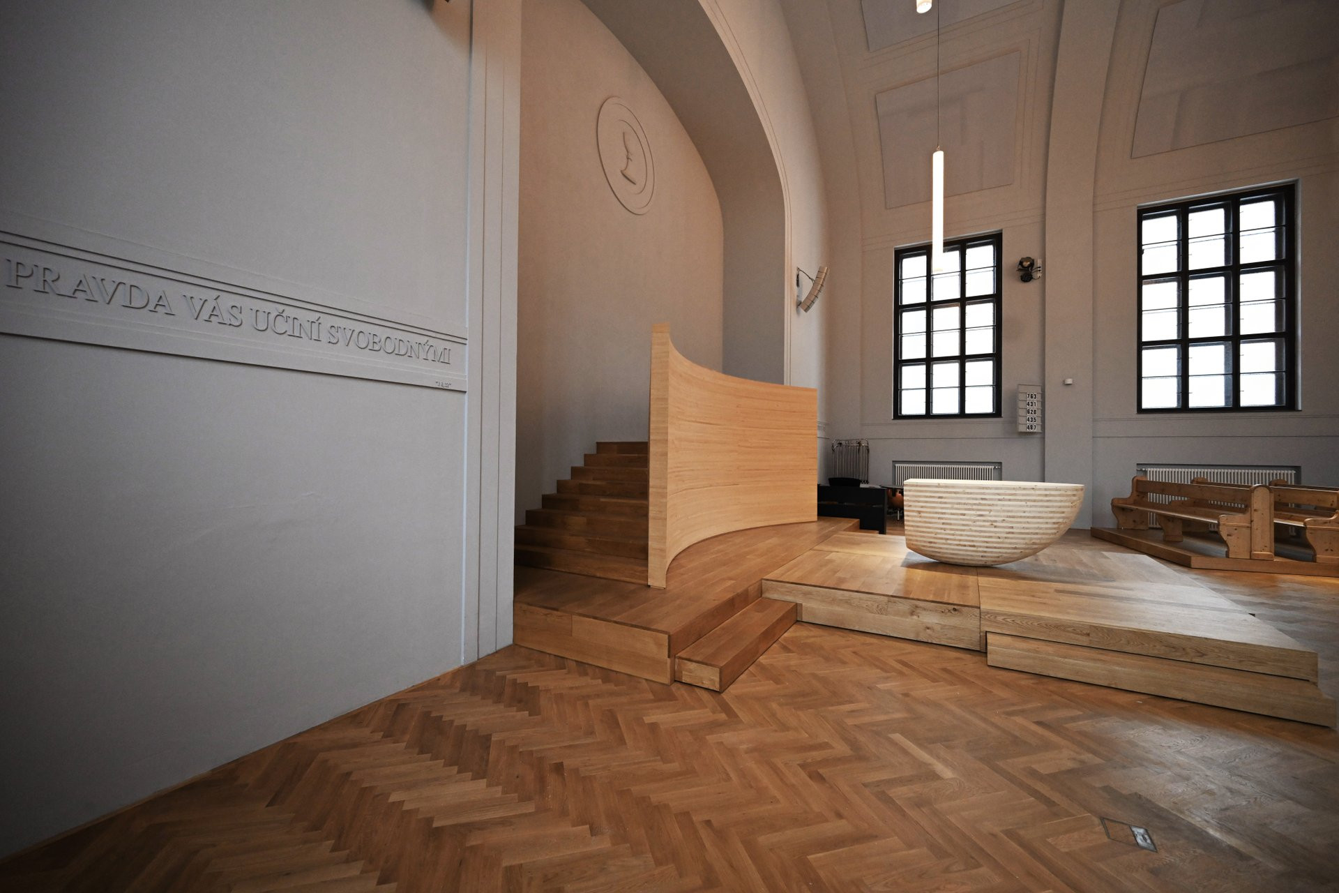 Neokázalé je také nové liturgické zařízení – architekti navrhli kazatelnu, křtitelnici a stůl Páně, který svým tvarem připomíná nakrojený chléb.