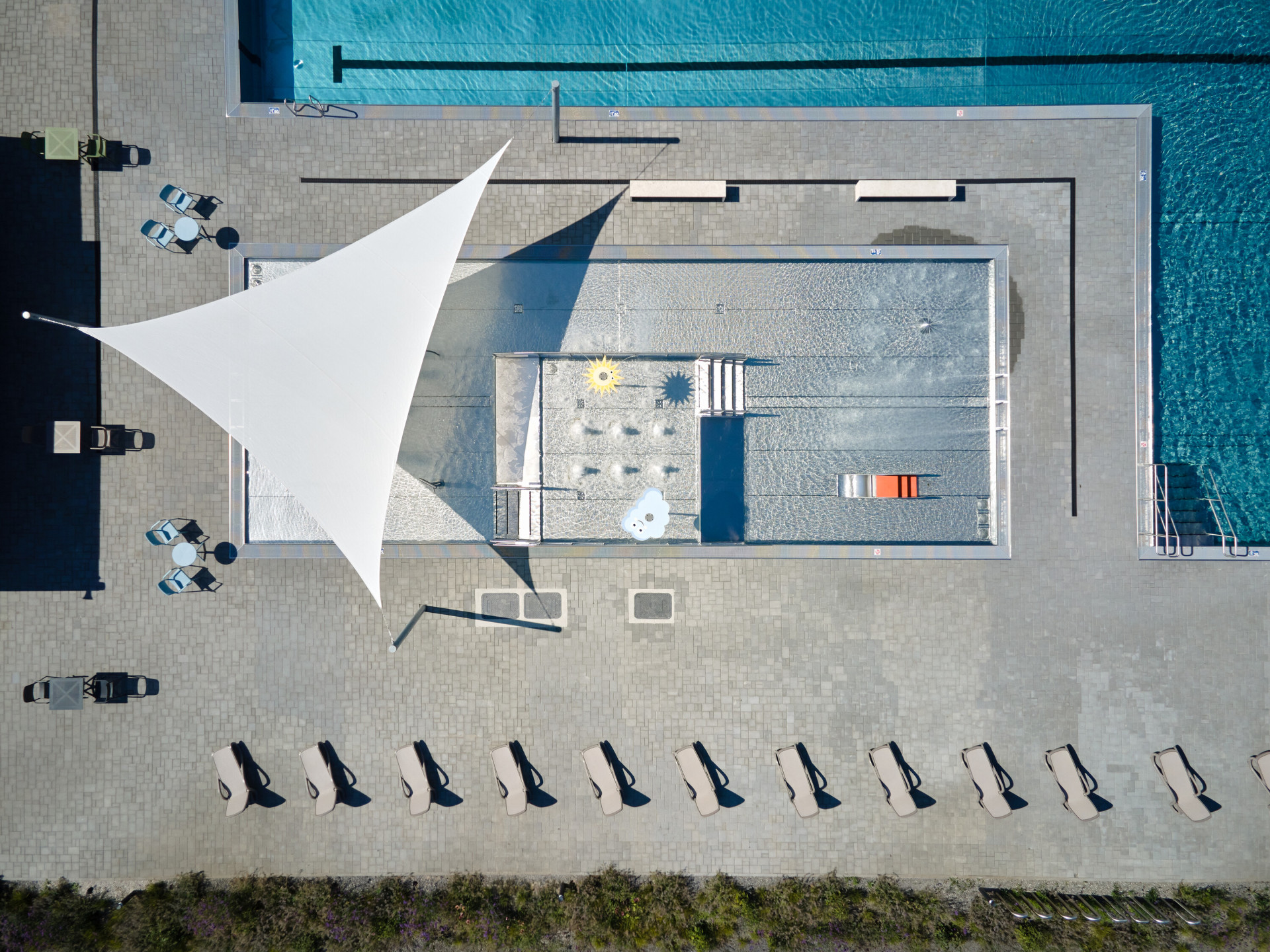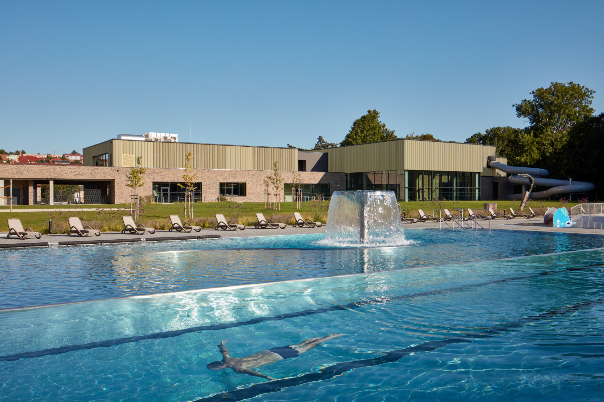 Zařízení, kde se dá sportovat i relaxovat, se jmenuje Aquavparku. V parku tady totiž už původně fungovalo venkovní koupaliště. To je dnes pohledově skryté za novostavbou. Prošlo kompletní revitalizací, jeho původní uspořádání zůstalo, bazény ale nově mají nerezové vany.