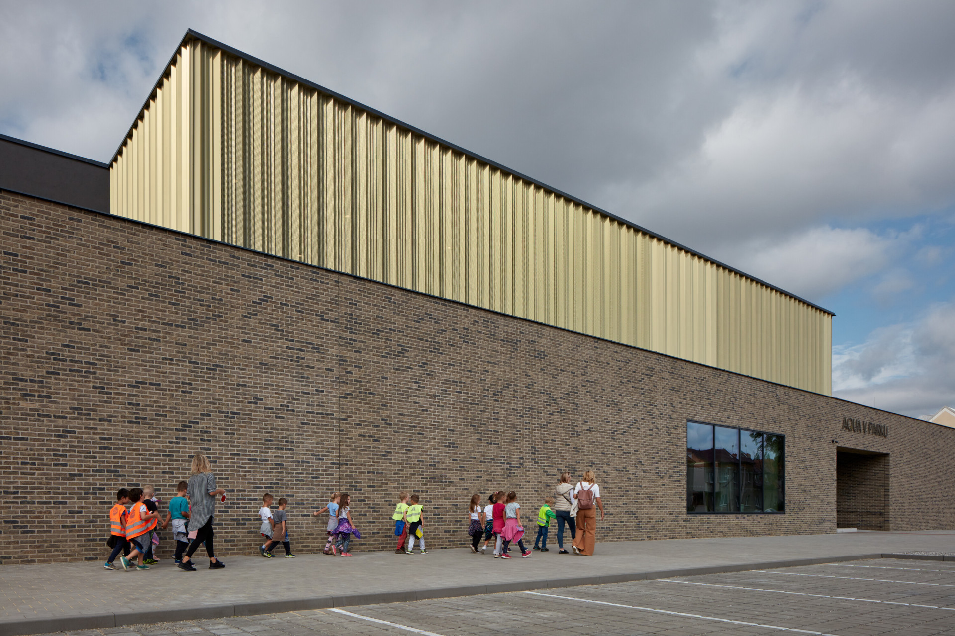 Objekt s bazénovou halou je proto hmotově rozdrobeny. Parter je pevný, tvoří ho táhlá stěna obložená cihelnými pásky. Vyšší podlaží jsou pak směrem do ulice pojatá pavilonově – jako tři (téměř) samostatné kvádry. Velká stavba se tak zjemňuje a nepůsobí jako nepatřičný monoblok. Podél průčelí akvaparku pokračuje cyklostezka, kterou se přes park projede až do centra Kyjova.