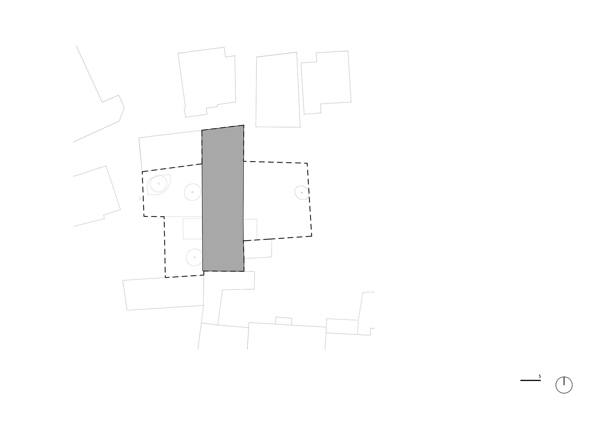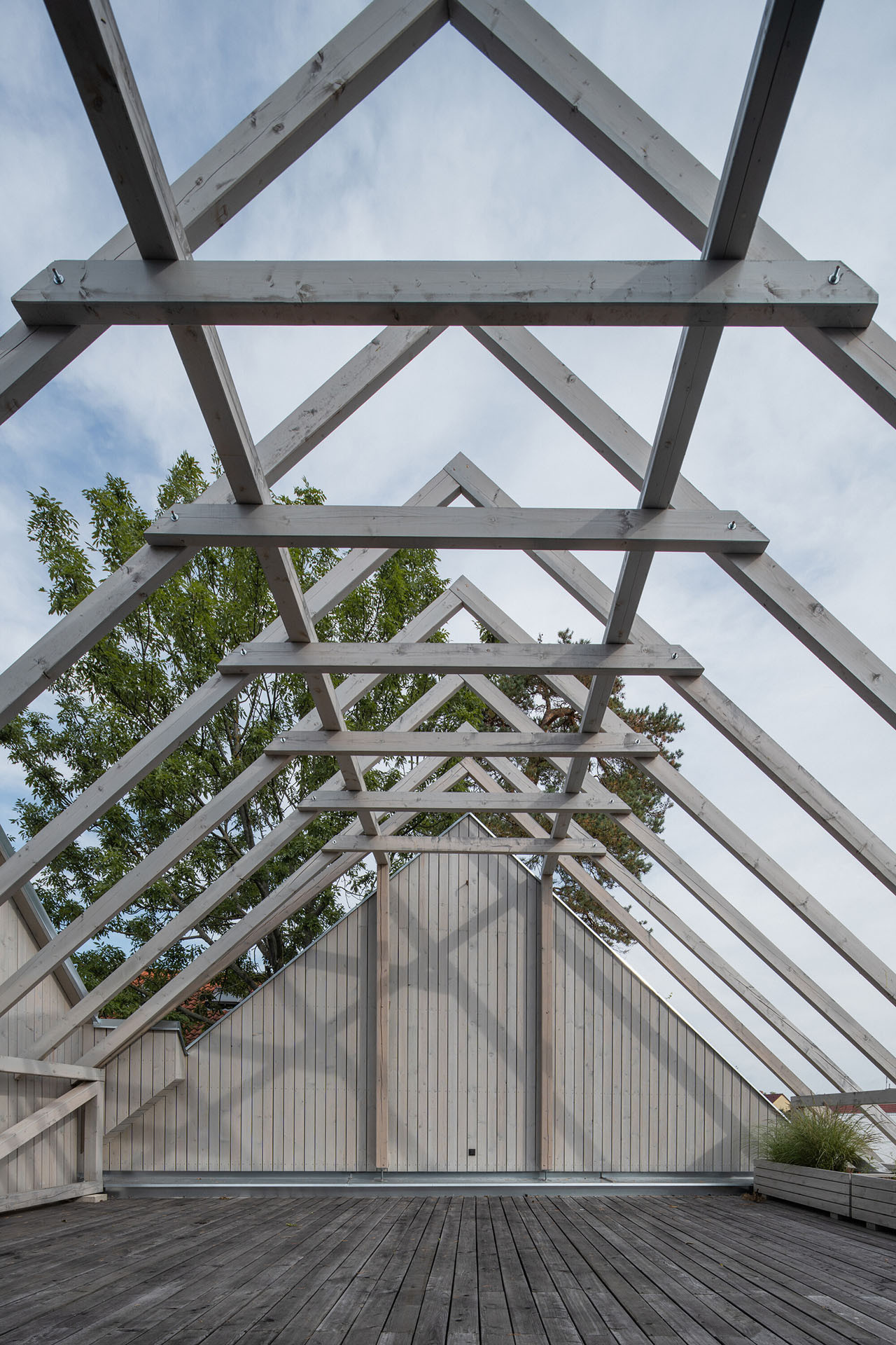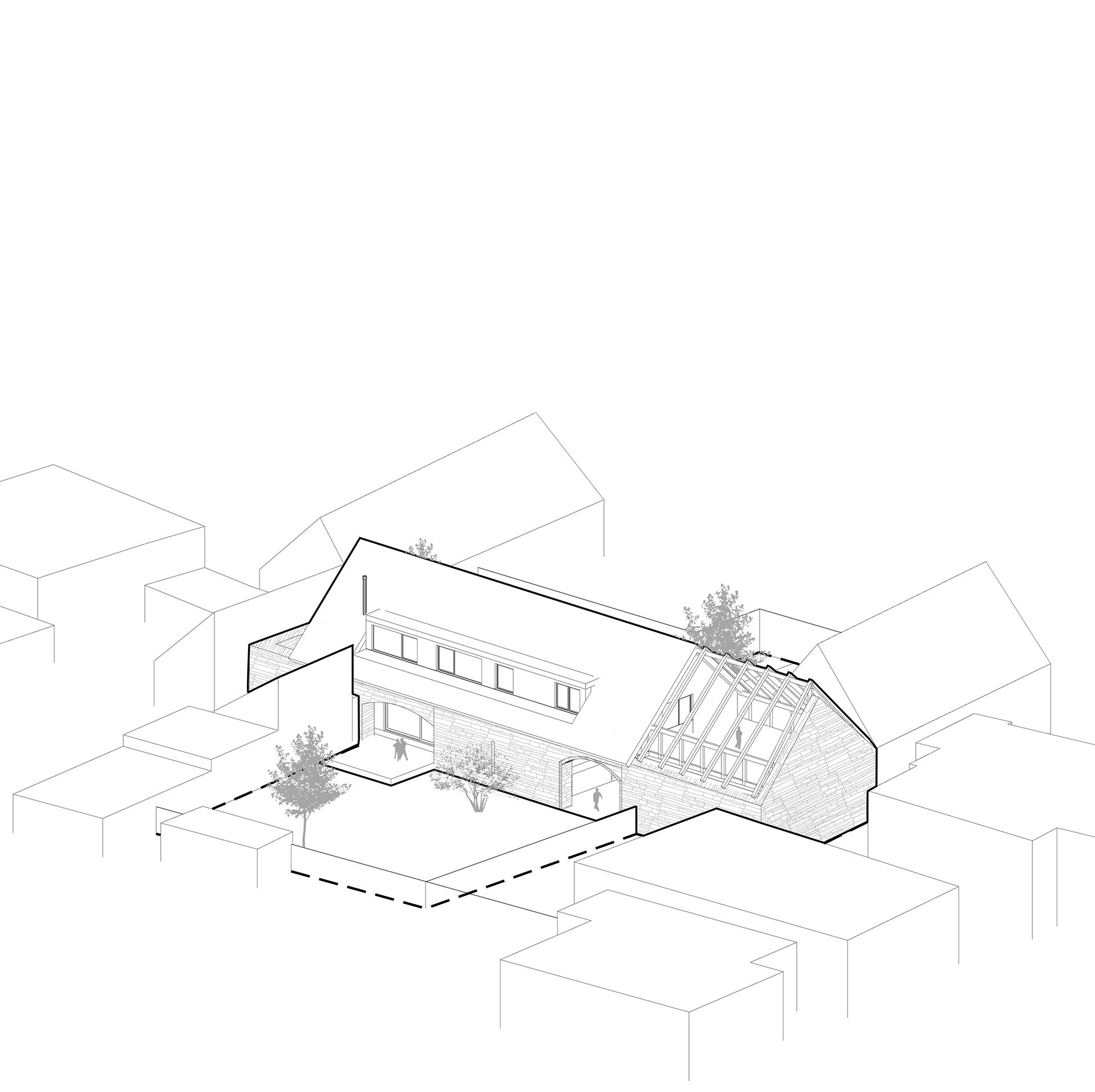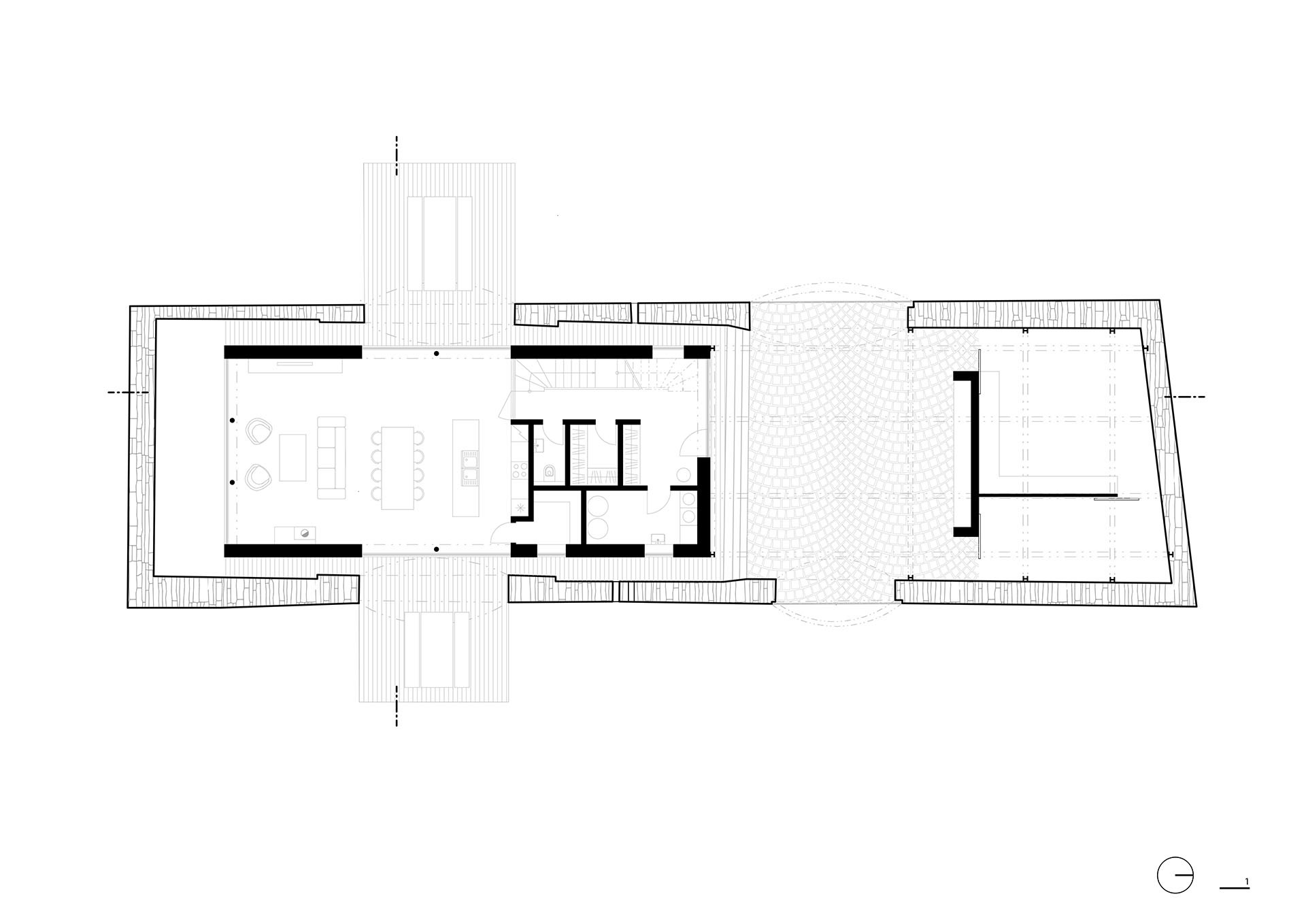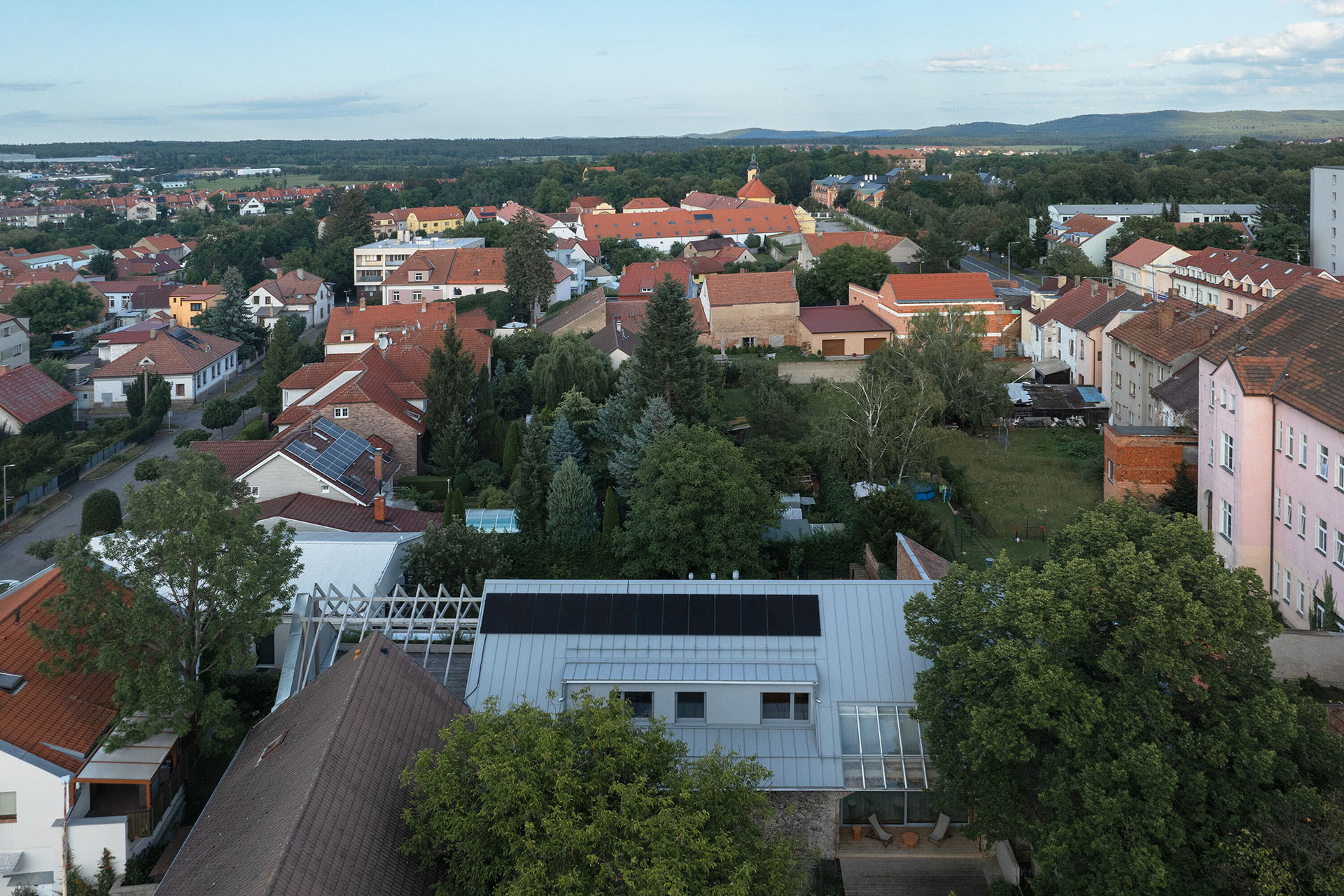 Stodola rozděluje pozemek na dvě poloviny orientované na východ a západ. V zahradě tak vznikají dvě odlišné atmosféry. Jedna část je více klidná a slouží k odpočinku, zatímco ta druhá má aktivnější charakter – na každou vede jedna z obývákových teras.