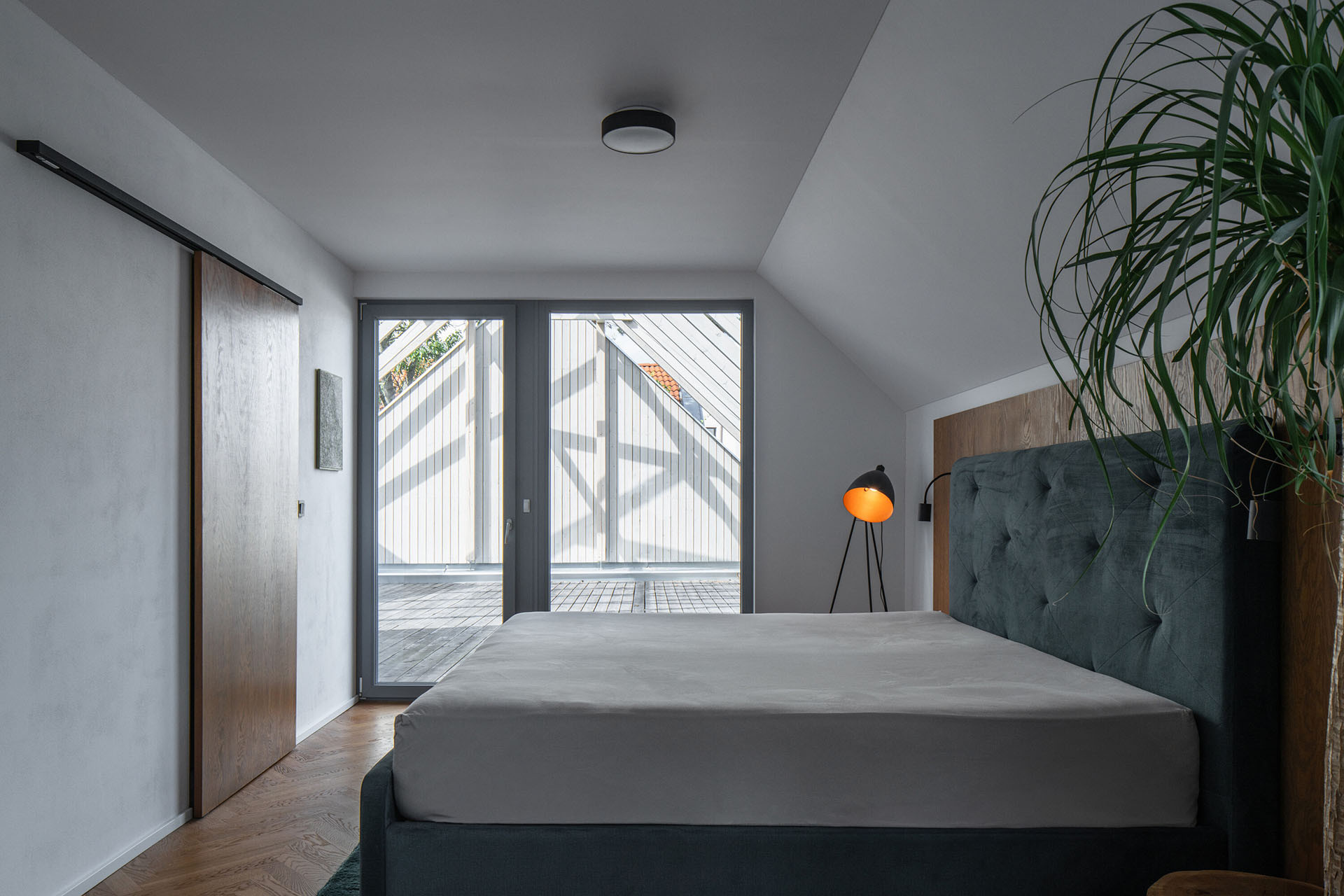 Do druhého patra se jde po schodech, které vedou z obývacího pokoje. Tady najdete dětské pokoje, ložnici rodičů a pokoj pro hosty. Ráno se tu určitě nestojí fronta na čištění zubů, mají totiž dvě prostorné koupelny. V jižní části stodoly je navržena pracovna. Z hlavní ložnice je východ na terasu. Obývací pokoj je také propojen se zahradou hned dvěma terasami. Na jednu svítí slunce ráno a na druhou večer, a tak si můžete si sami vybrat kam se kdy posadíte.