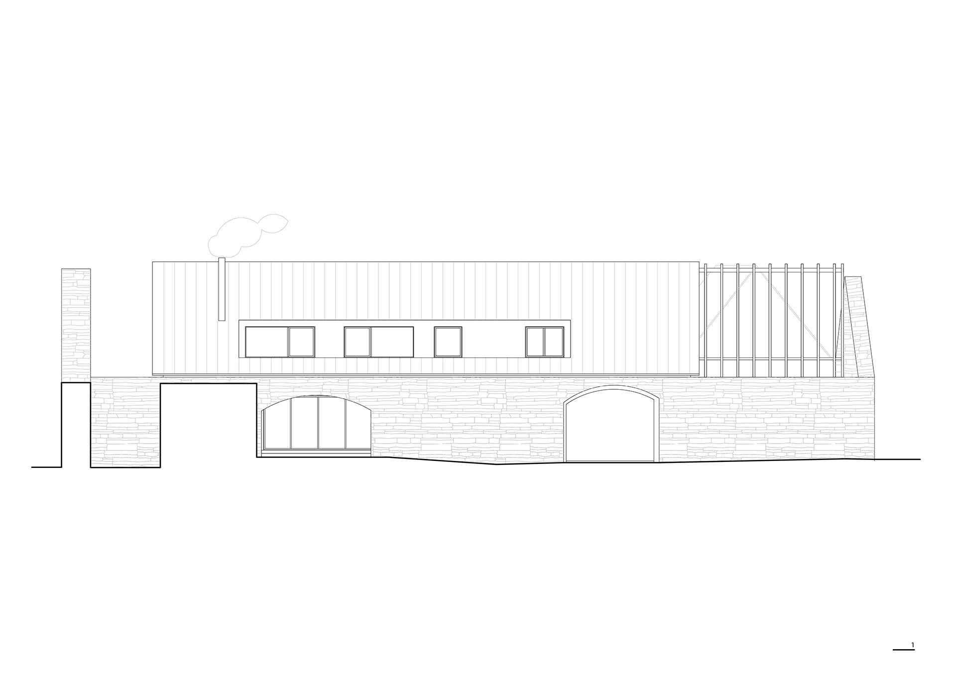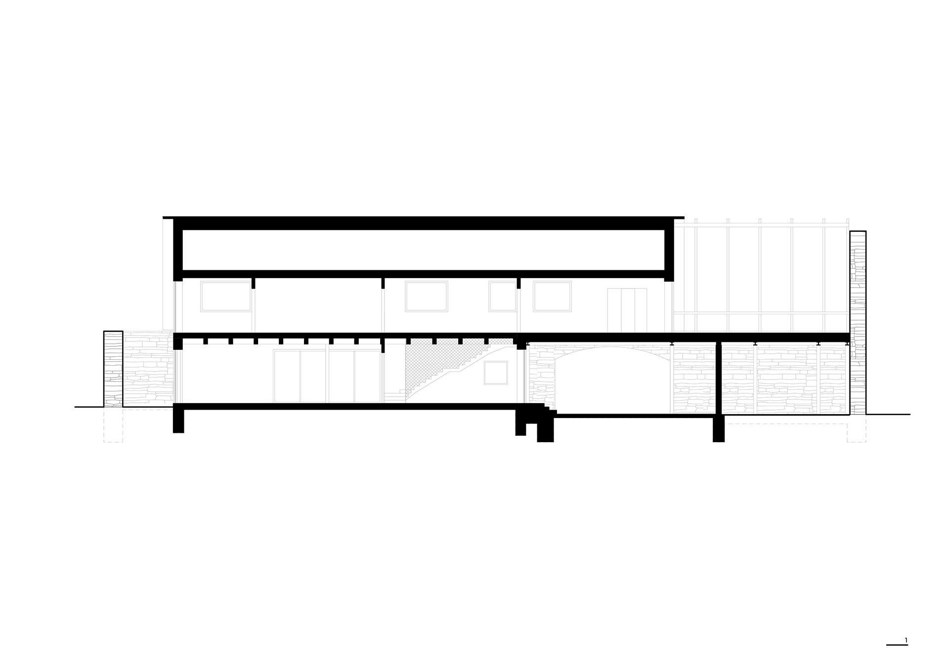 Vložená novostavba se dispozičně podřizuje původnímu zdivu a klenutým otvorům. Konstrukčně je však zcela oddělena. Přechod mezi starým a novým není patrný. „K cihlovo-kamennému torzu obvodové zdi jsme přistupovali s opatrností téměř památkové ochrany,“ popisují architekti ze studia Karnet architekti.