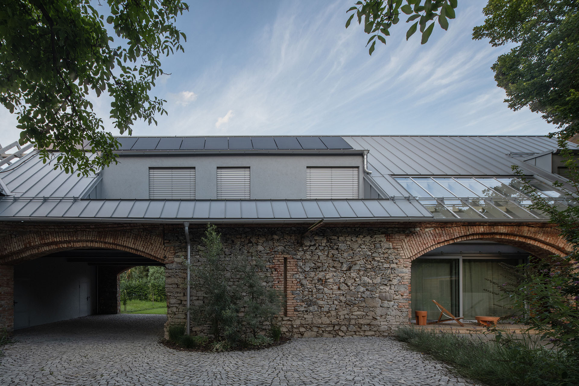 Při pohledu na stodolu zvenčí si jako první všimnete původních klenutých průjezdů. Jeden byl zasklen a funguje jako okno do zahrady v hlavním obytném prostoru. Ten druhý slouží jako přístřešek pro parkování a zároveň prostor pro průjezd na druhou polovinu pozemku. U průjezdu se v horní části domu nachází také dílna a venkovní sklad na sezónní sportovní vybavení kryté nadzemním podlažím.