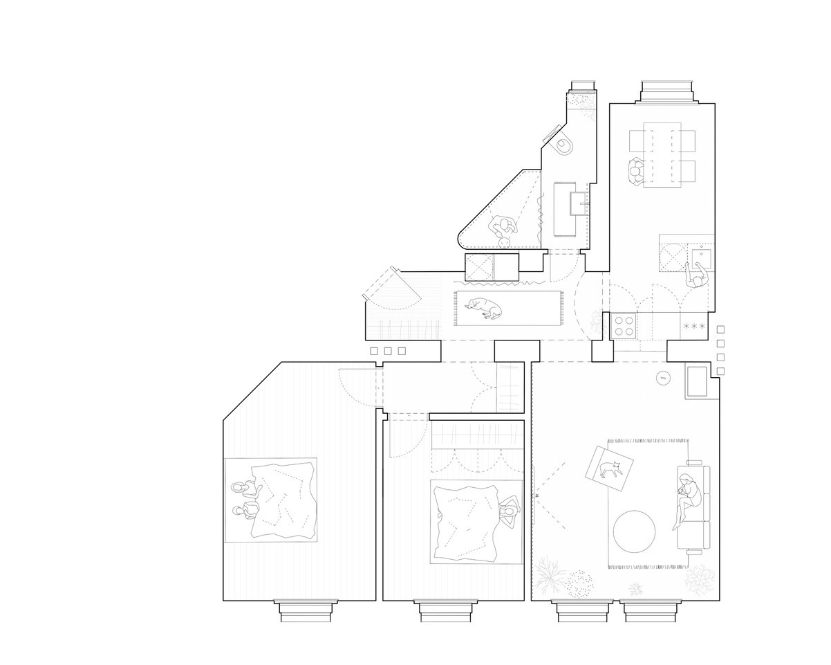 Největší důraz kladli architektky na dostatečné prosvětlení dispozice a otevřenost prostoru. Mezi obývacím pokojem a kuchyní nově přibylo výdejní okénko, jež bylo pro byty z tohoto období běžnou záležitostí; oba prostory funkčně a vizuálně propojuje. Zrušili průchozí pokoje, ale vytvořili současnější uspořádání se dvěma neprůchozími ložnicemi a obytným jádrem. Přibyla šatna, v koupelně byl kreativně využit nepravidelný trojúhelníkový prostor, který nově obsadil velkorysý sprchový kout.