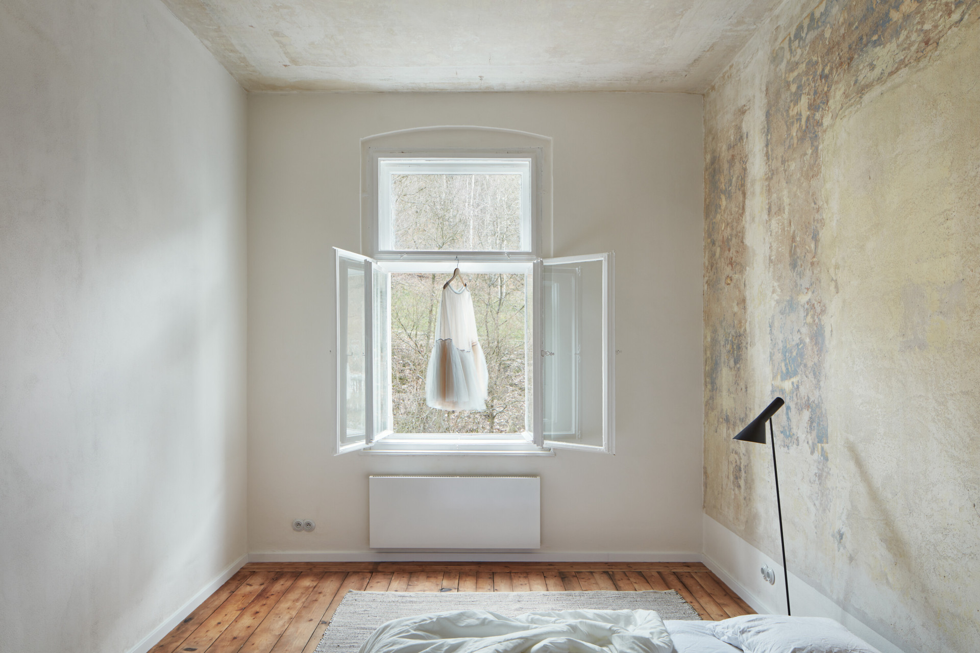 V ložnicích byla zachována původní dřevěná prkenná podlaha, která kontrastuje s novou litou podlahou šedého odstínu. Ta zvýrazňuje původní výmalbu na stěnách, pečlivě vybrané kusy nábytku od mladého designerského studia Jánský & Dunděra a další designové kousky a v neposlední řadě i původní glazovaný krb, který se nově stal dominantou obývacího pokoje.