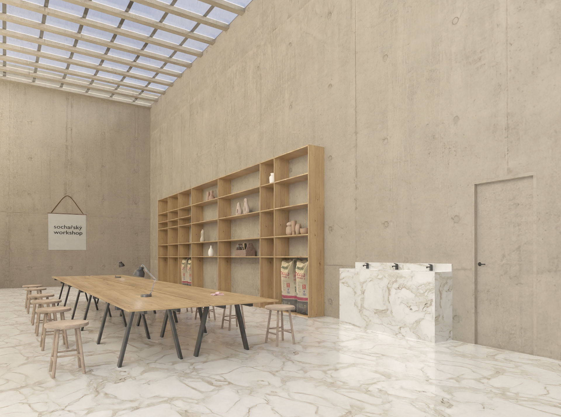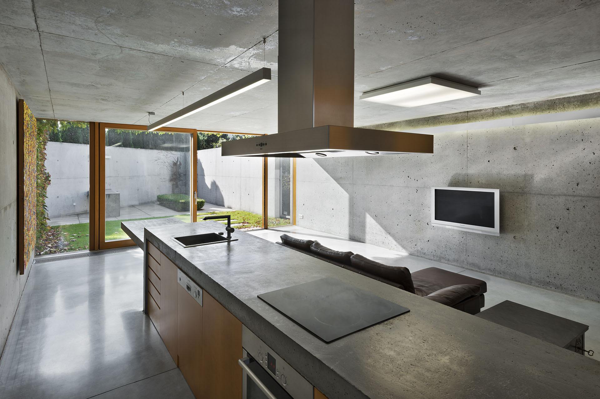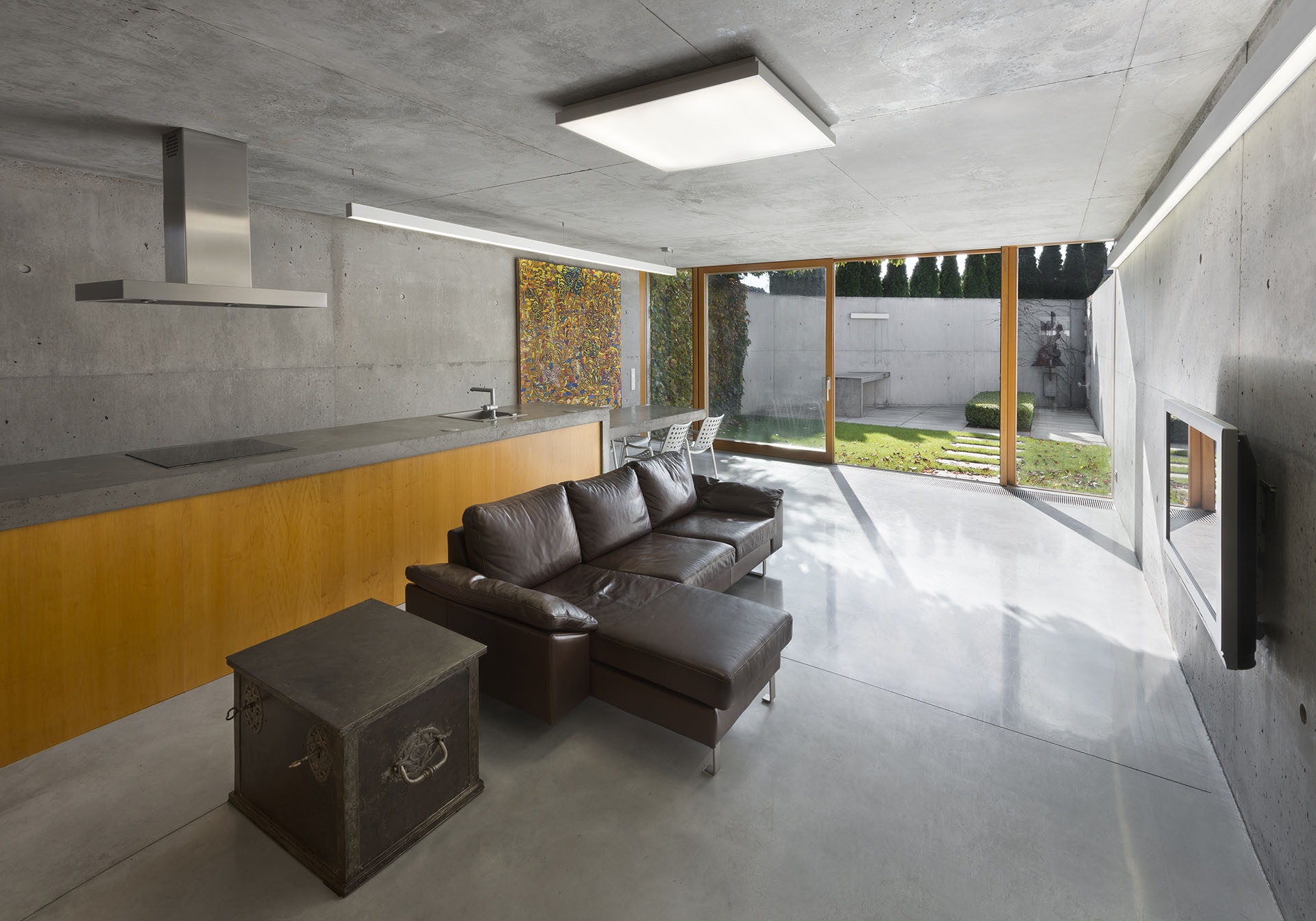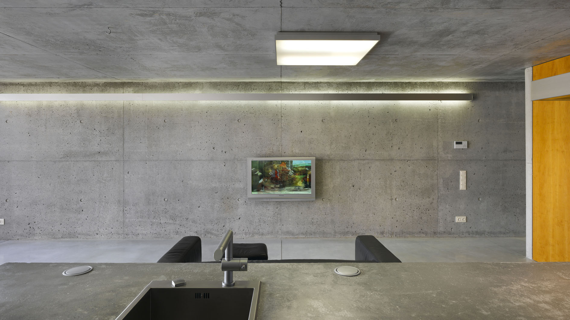 Neošetřené konstrukční materiály použité v budově působí masivním, nepřikrášleným dojmem. V prostorách se nachází broušená neleštěná betonová podlaha, stěny jsou také betonové a neošetřené, stejně jako strop.