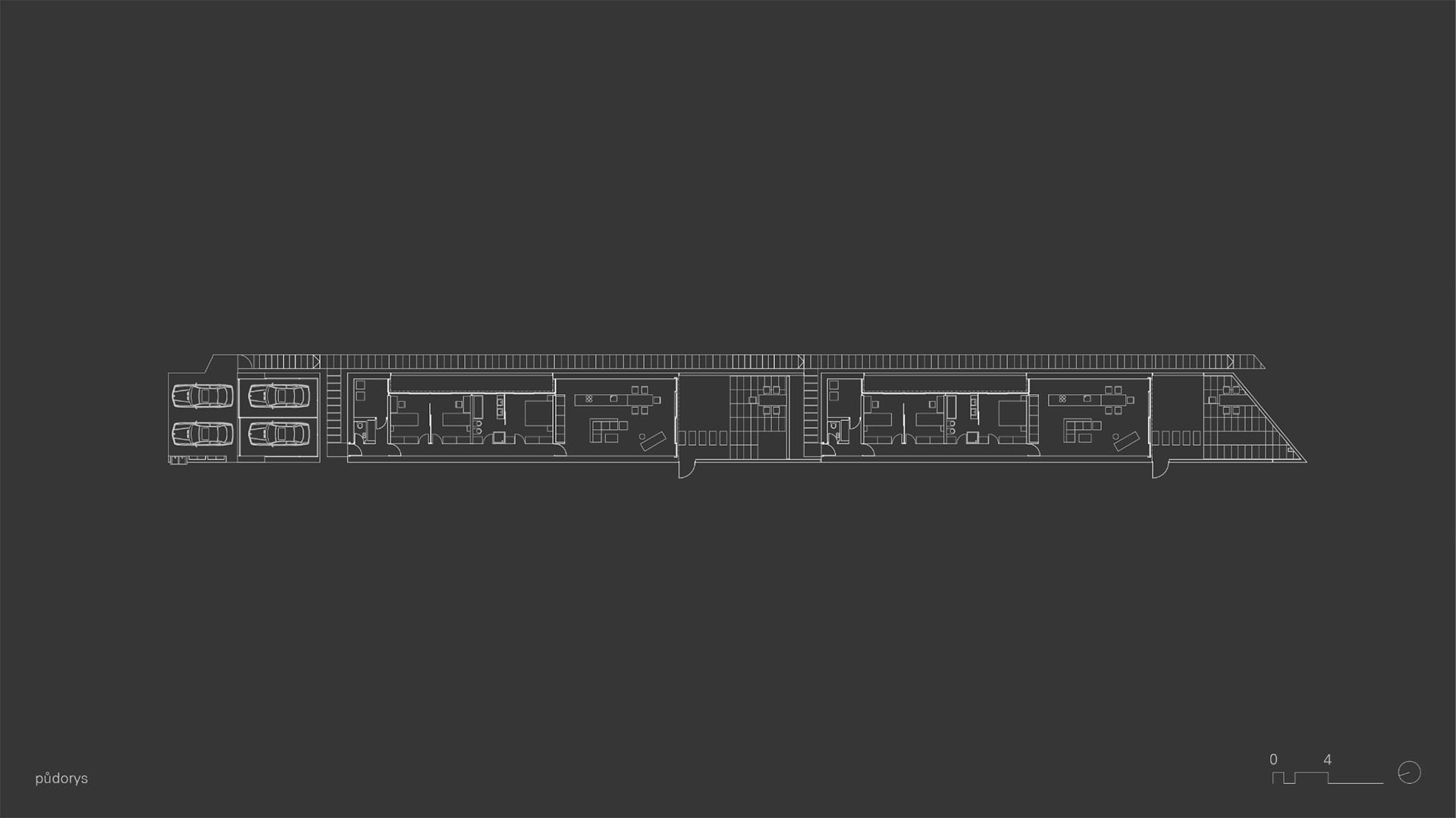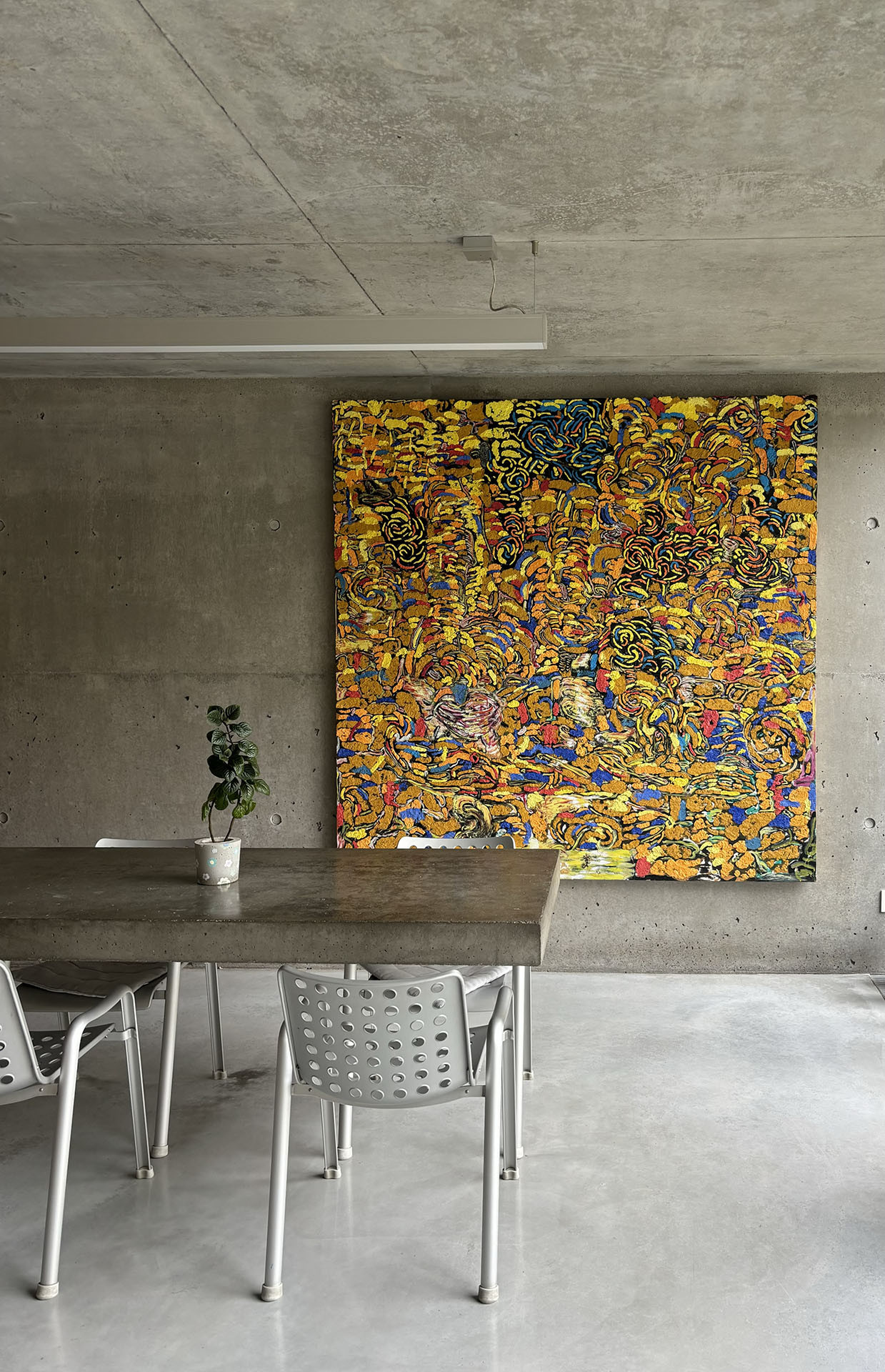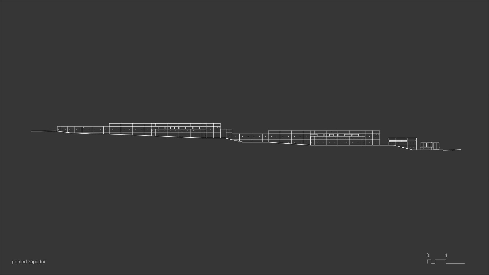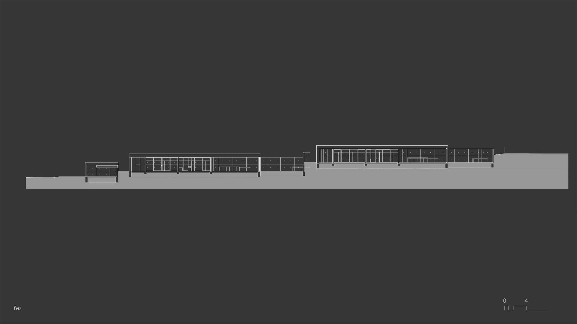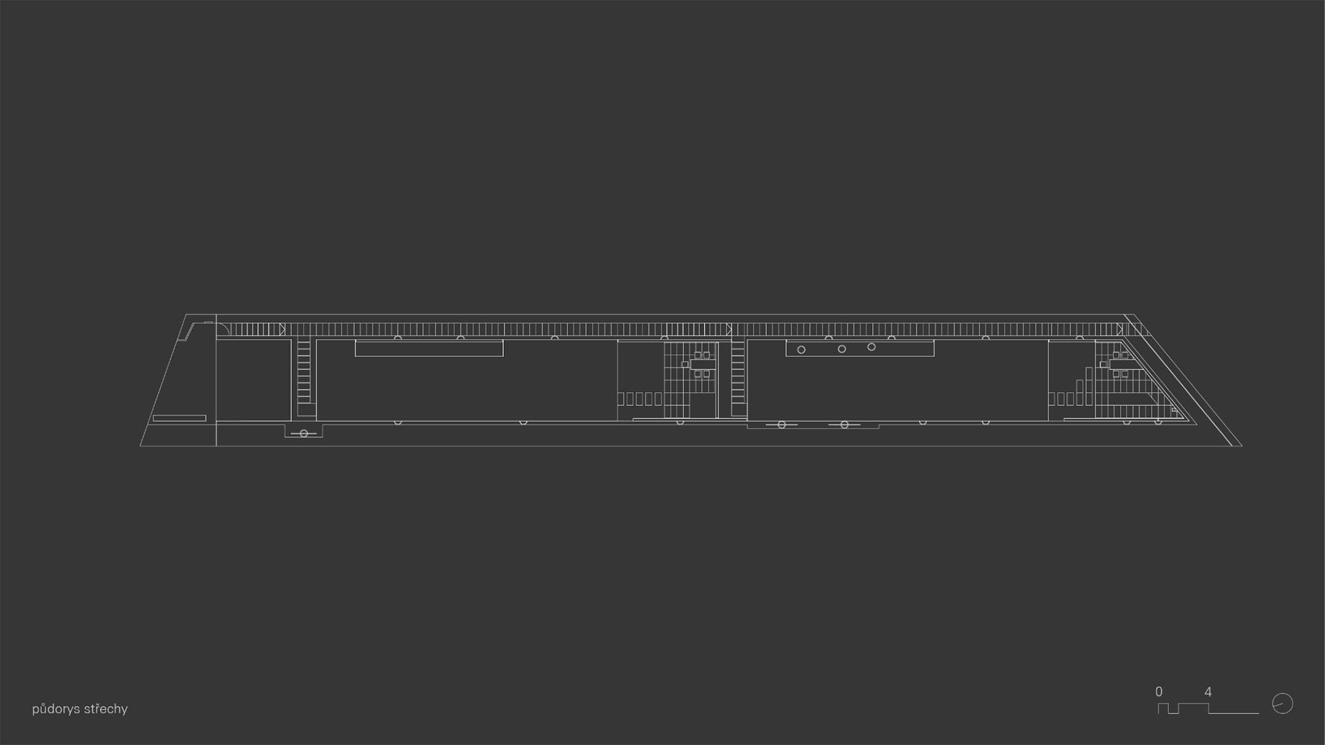 Neošetřené konstrukční materiály použité v budově působí masivním, nepřikrášleným dojmem. V prostorách se nachází broušená neleštěná betonová podlaha, stěny jsou také betonové a neošetřené, stejně jako strop.