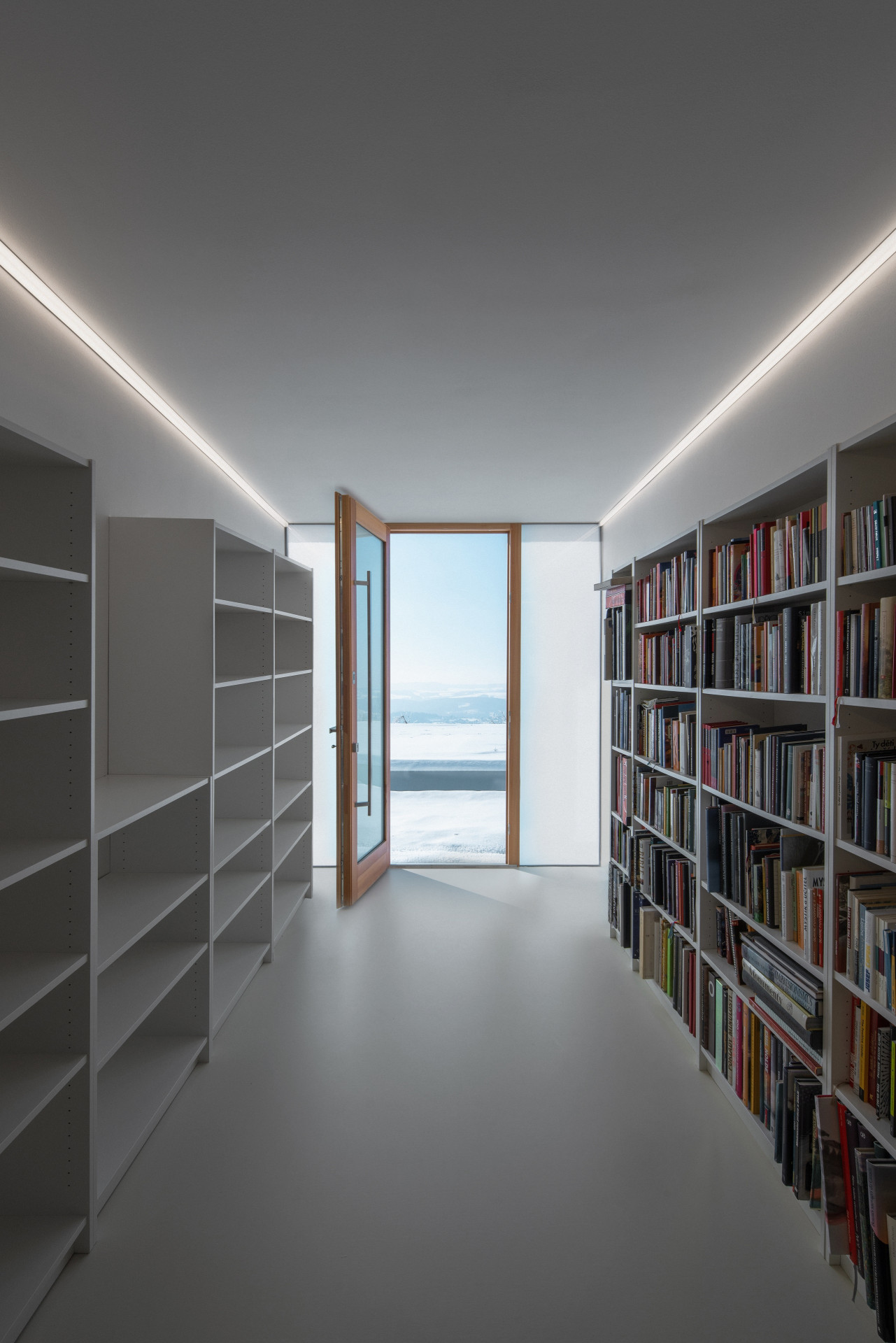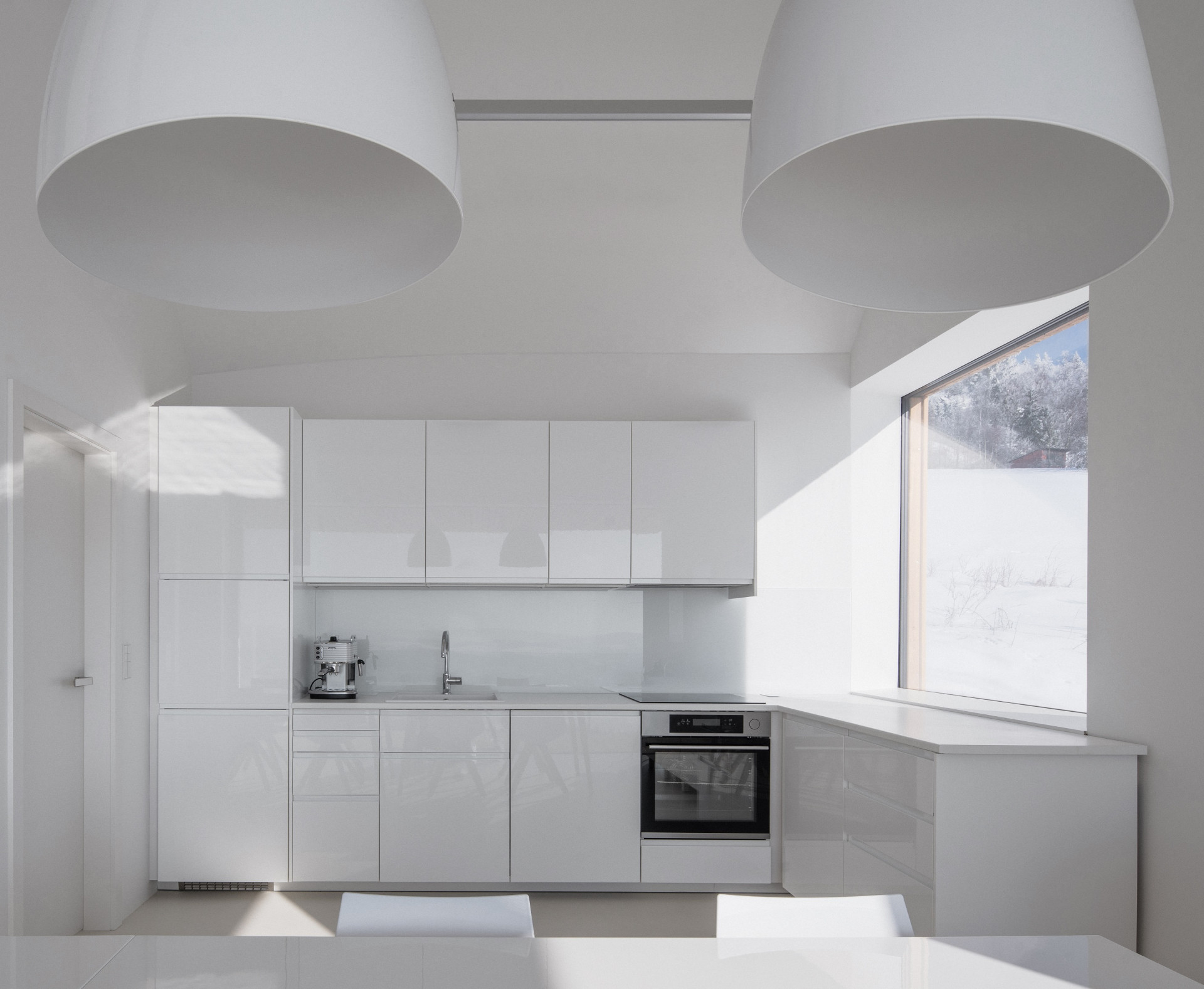Účelně minimalisticky zařízený vnitřní prostor nechává o to více vyniknout kráse panenské přírody za prosklenými stěnami. Výsledkem je maximální propojení interiéru s nekonečnou horskou scenérií.