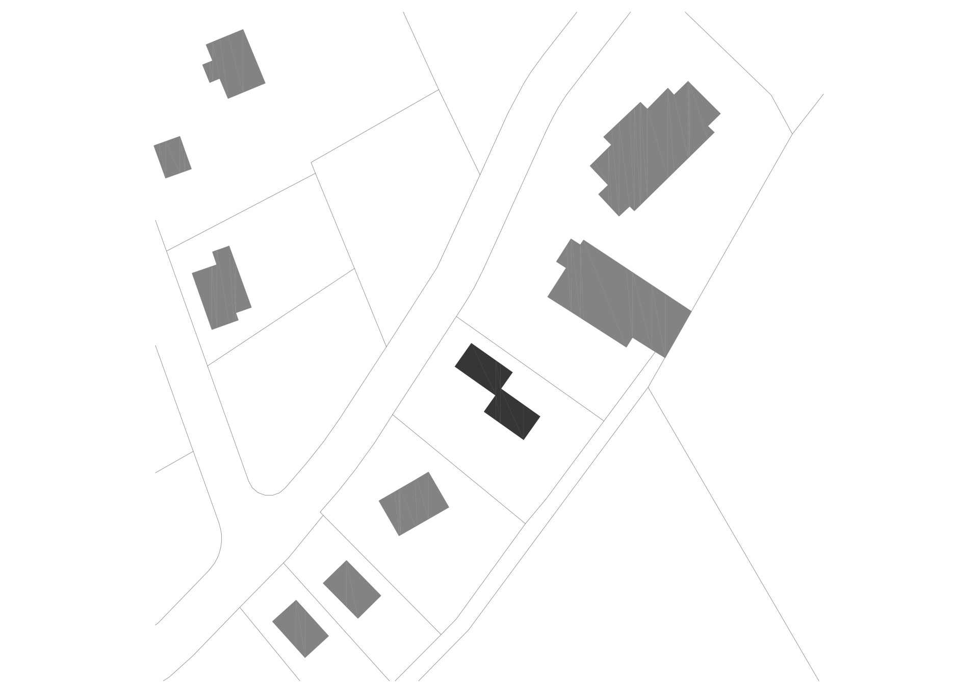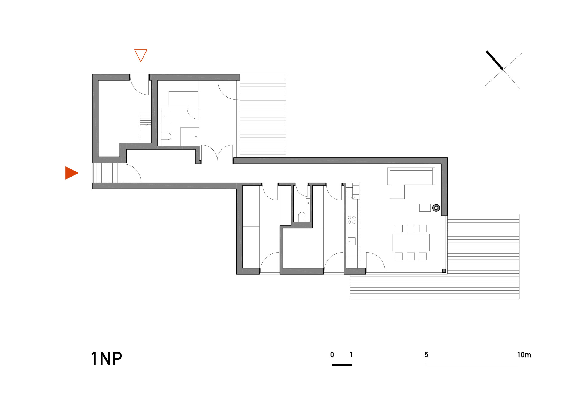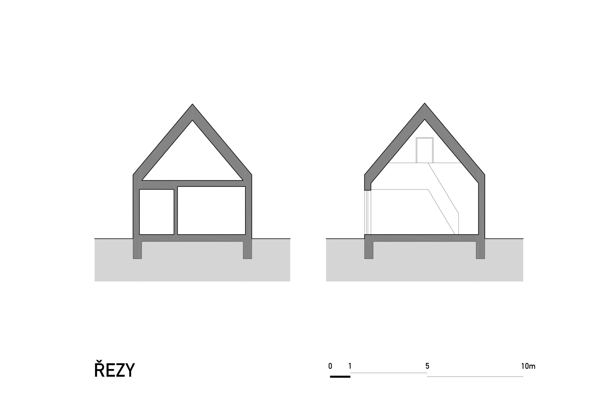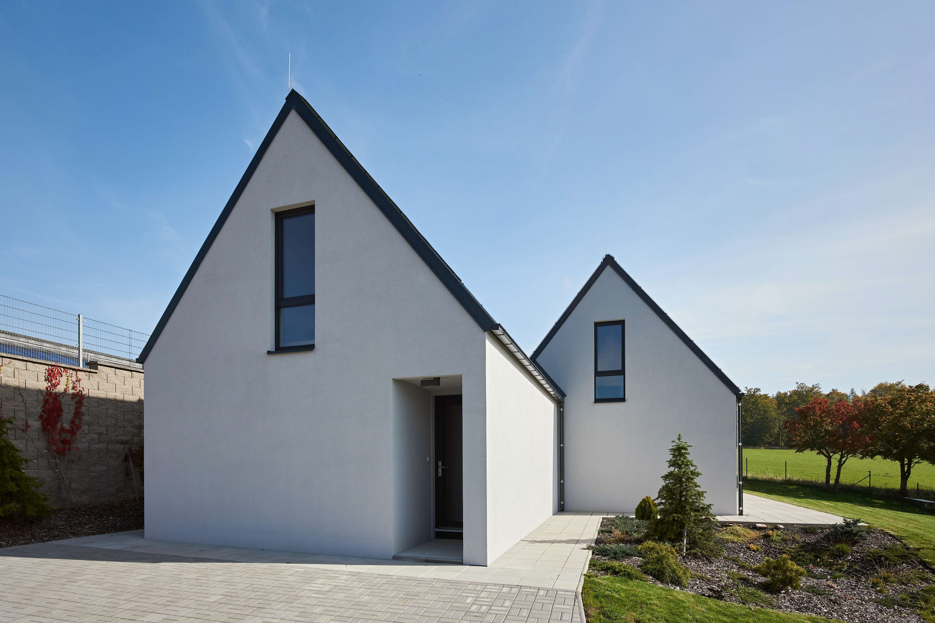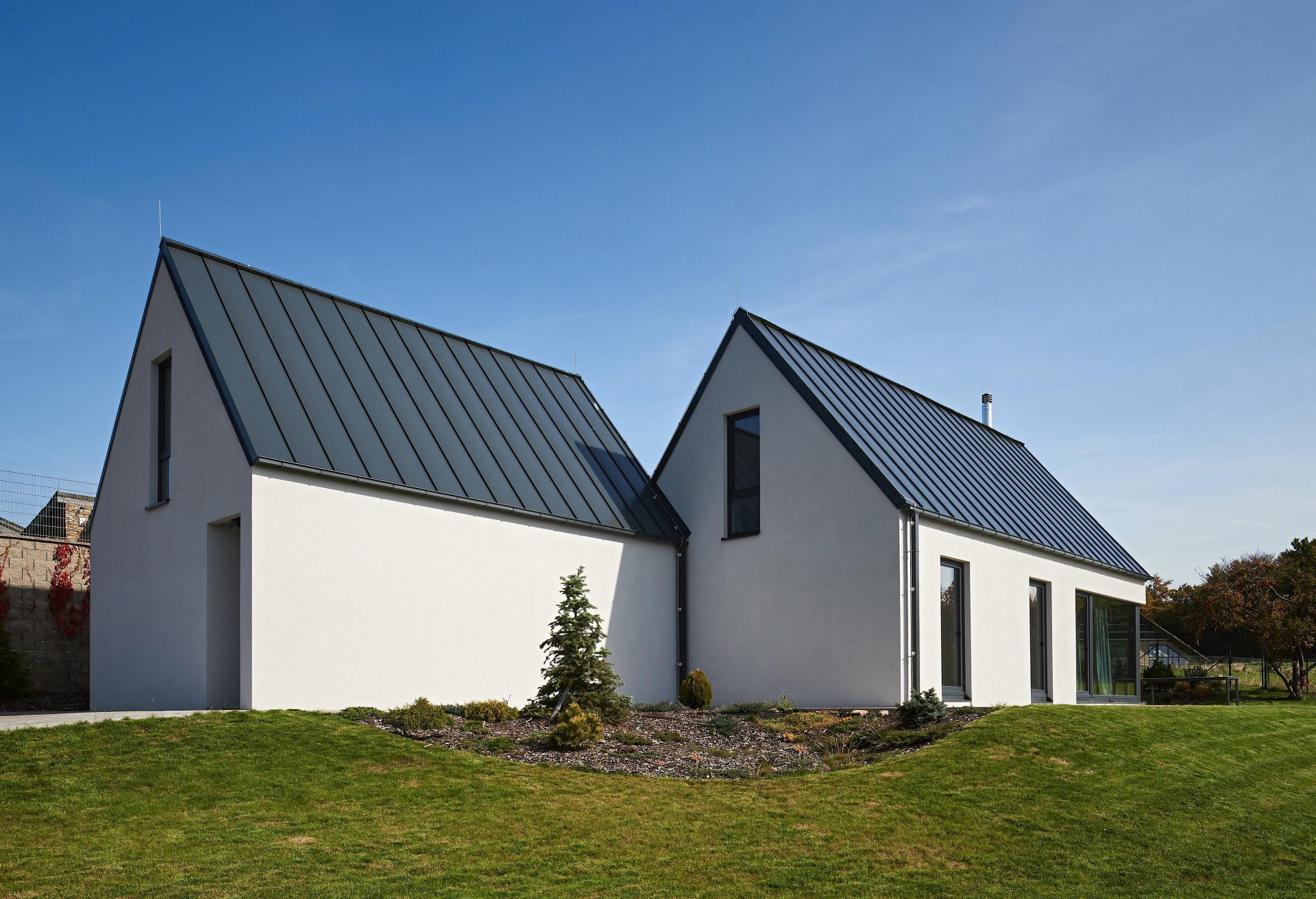 Tomu je přizpůsobený vnější tvar a objem. Dům je orientovaný podélnou osou směrem k ulici, má střechu se sklonem 50 stupňů, která odolá vodě a sněhu. Objem je navíc rozdělený do dvou hmot. „Jsou vůči sobě posunuté a spojené vnitřní chodbou,“ vysvětluje autor návrhu, architekt Jan Alex Řezáč ze studia Modulora.