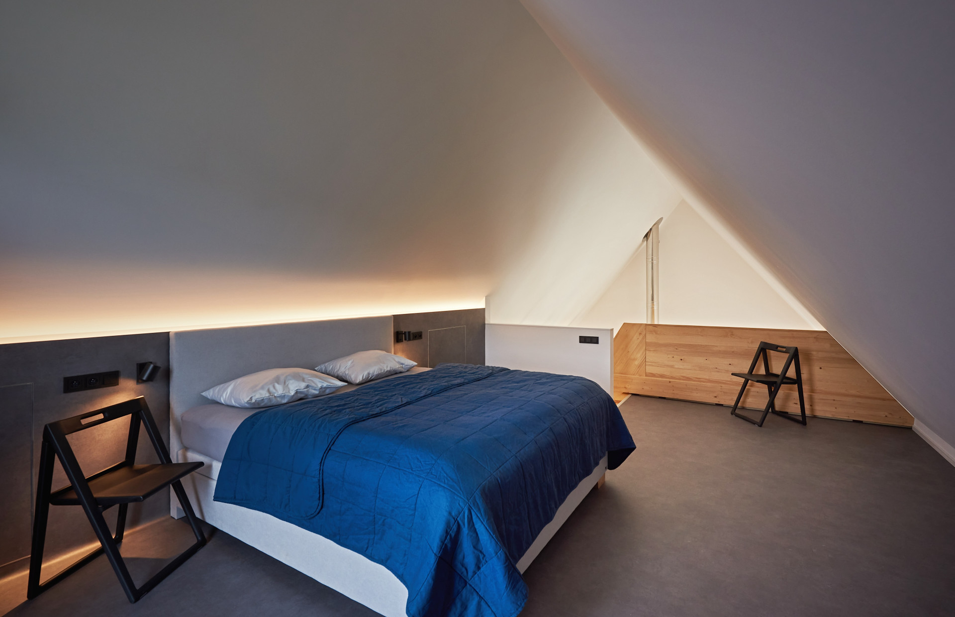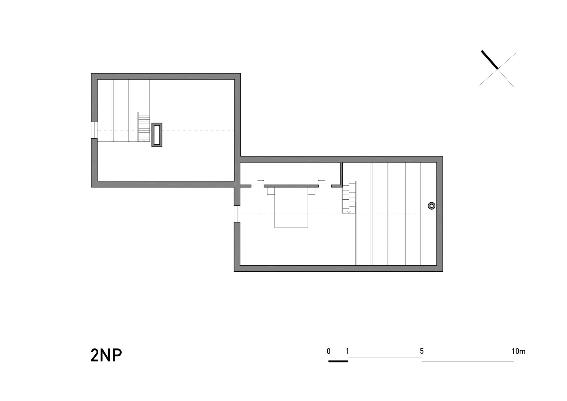 V jedné části horského dvojdomu je obytná místnost, dětský pokoj a v podkroví rodičovská ložnice. Jelikož obytná kuchyně není veliká, bylo třeba co nejúsporněji vyřešit schody. „Klasické schodiště s jedním či dvěma rameny by zabíralo velkou část půdorysu při relativně malé zastavěné ploše domu. Ideálním kompromisem se ukázalo použití mlynářských schodů o šířce pouhých 70 cm. Konstrukčně byly vyrobeny ze smrkové spárovky a spolu s přiznanými vaznými trámy jsou výrazným interiérovým prvkem,“ vysvětluje architekt Řezáč.
