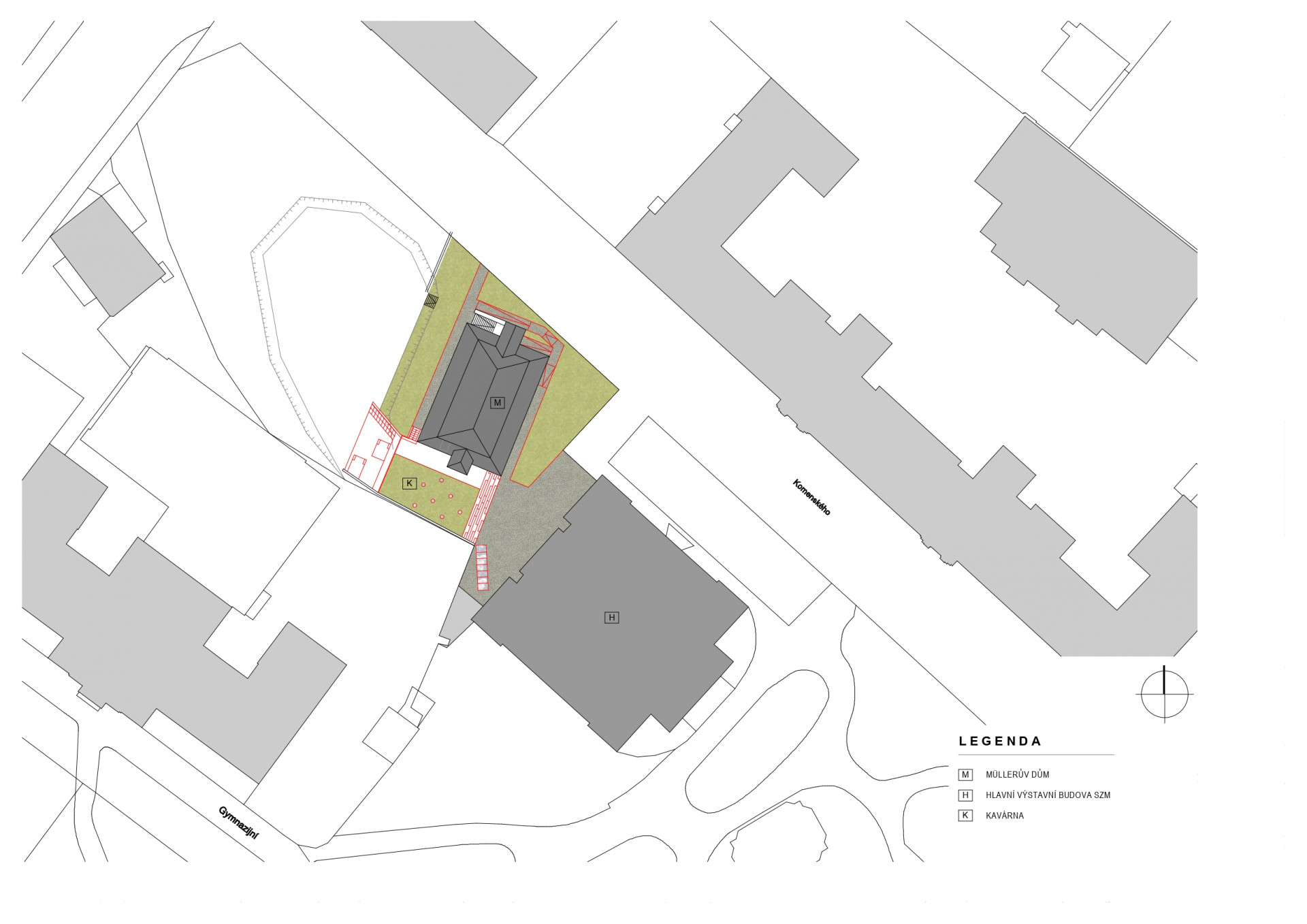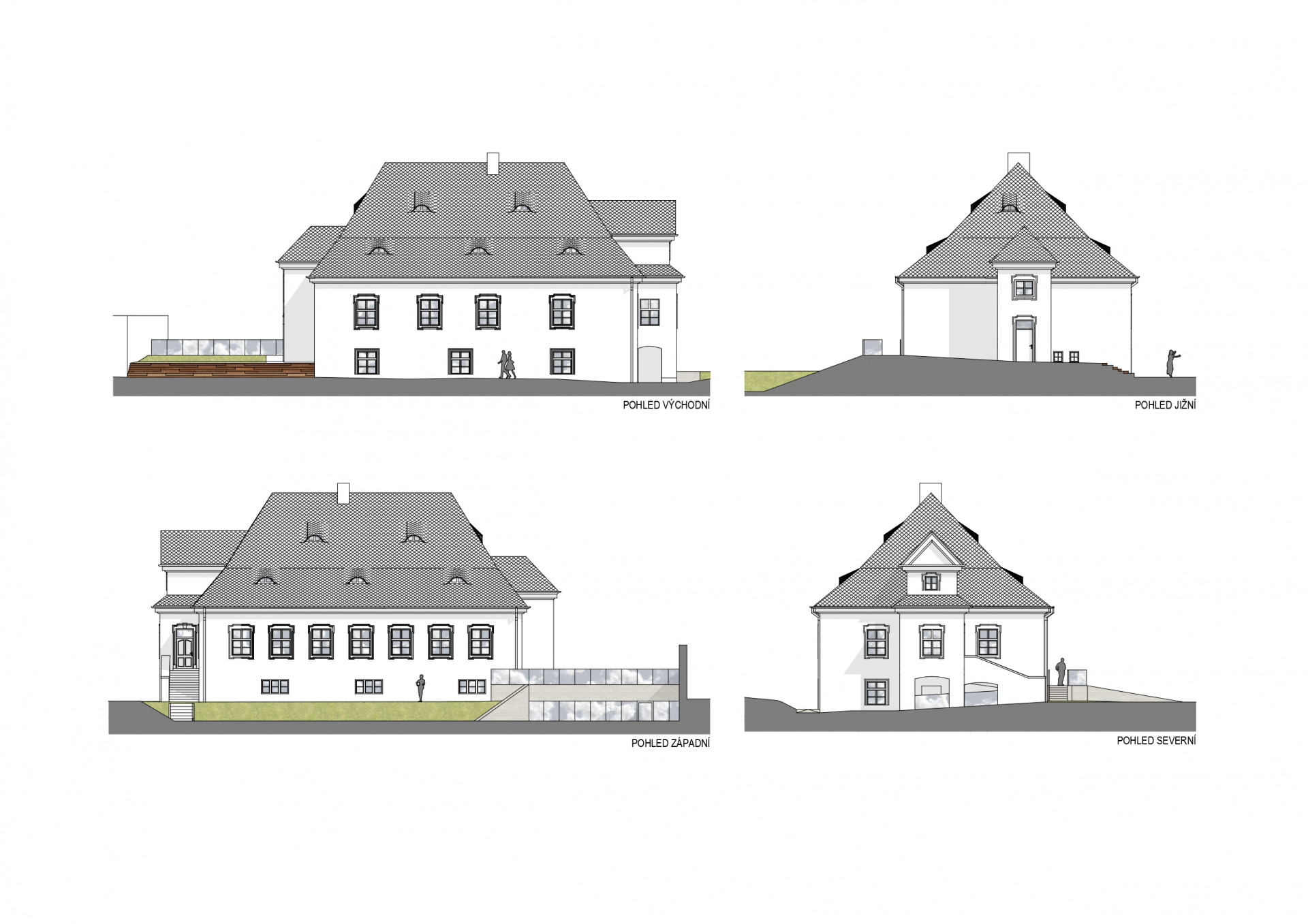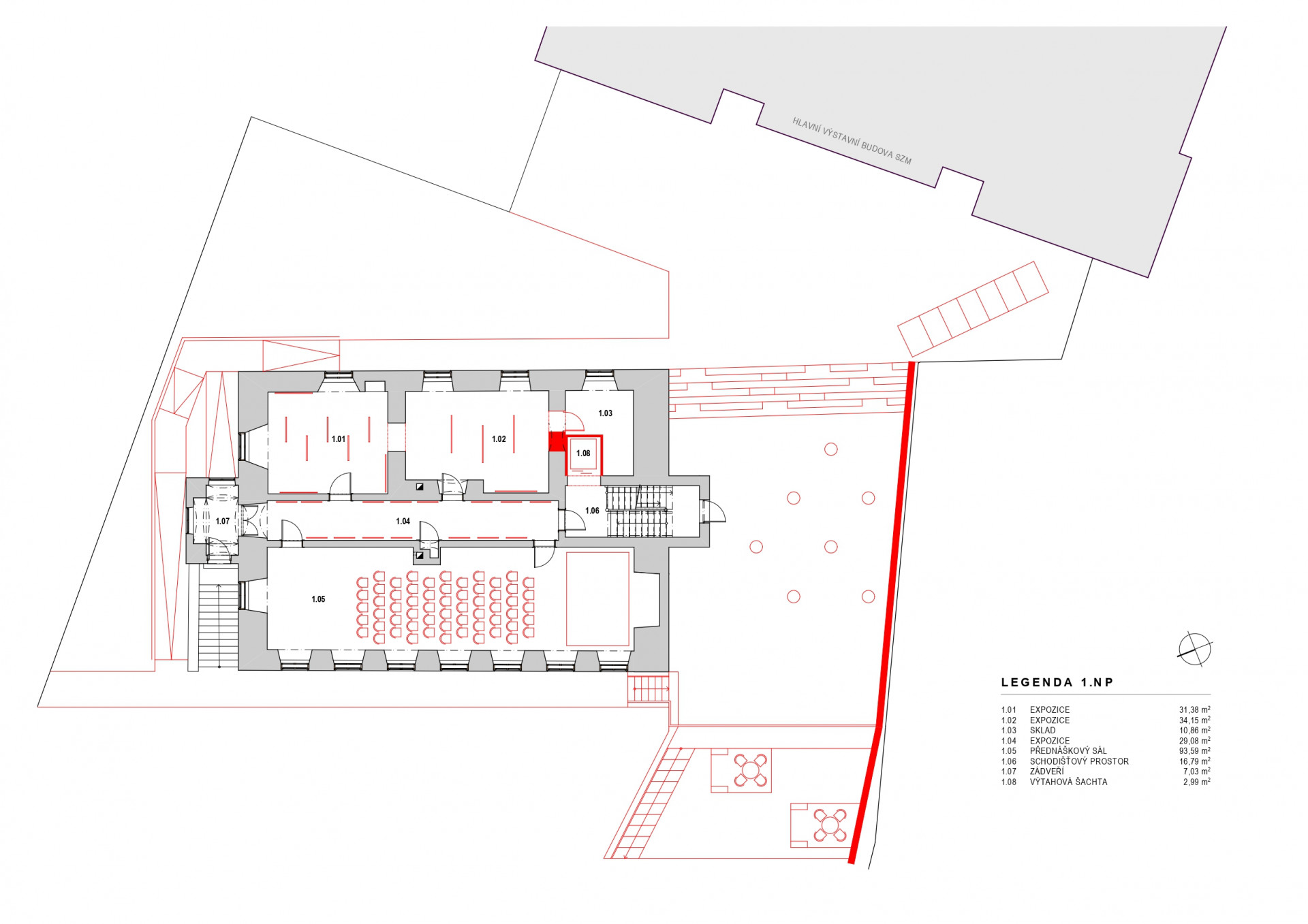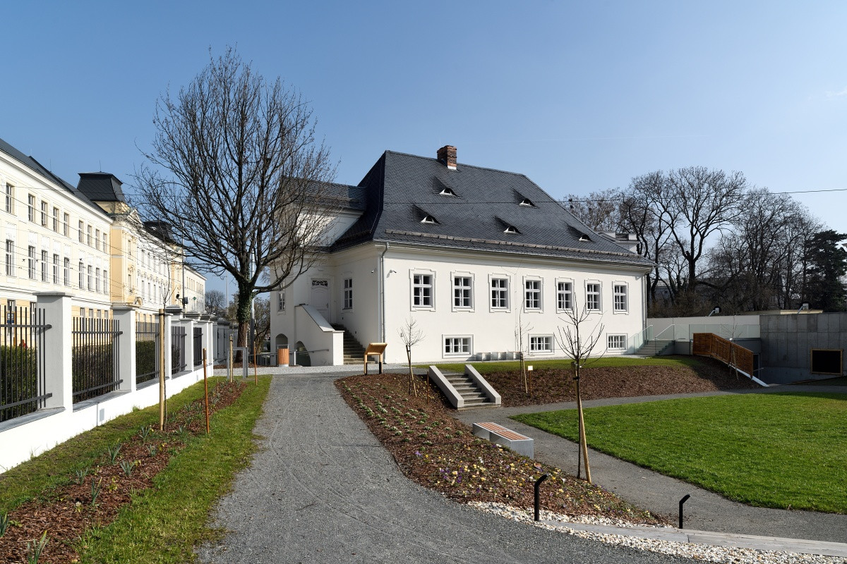 Další nové stavební vstupy do památky představuje výtah vložený do míst novodobých konstrukcí nebo podzemní propojení s historickým sídlem muzea. „V suterénu s klenbami jsme navrhli výstavní prostory, v patře podél západního průčelí přednáškový a výstavní prostor a v krovu se předpokládal další výstavní prostor,“ upřesňují architekti s tím, že podkroví je součástí prohlídkové expozice a nachází se v něm také typický kalhotový barokní komín.