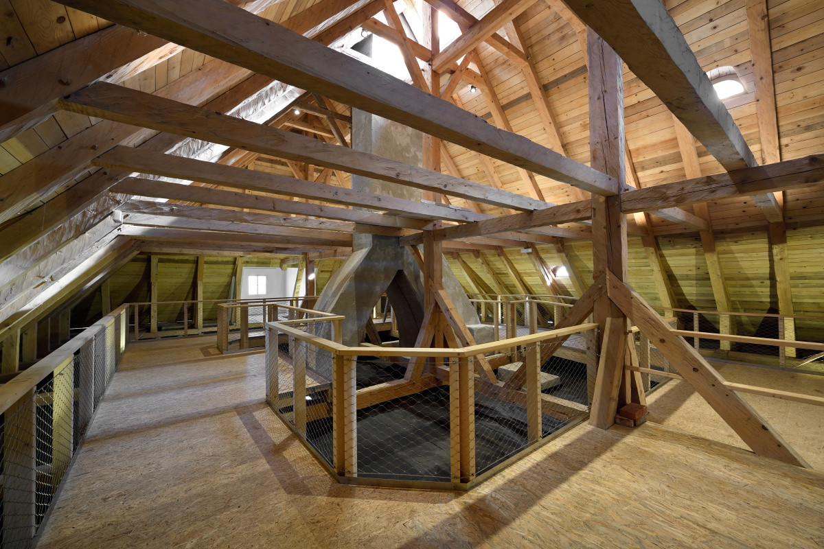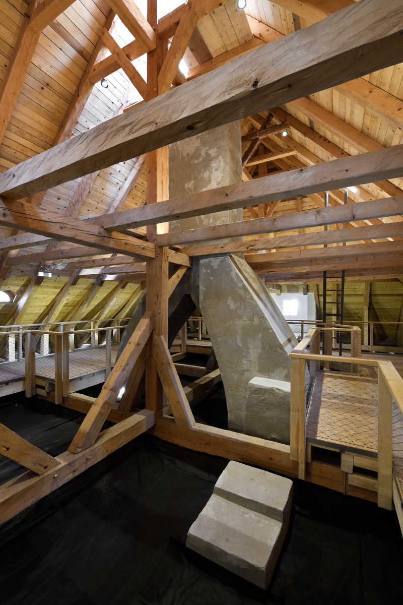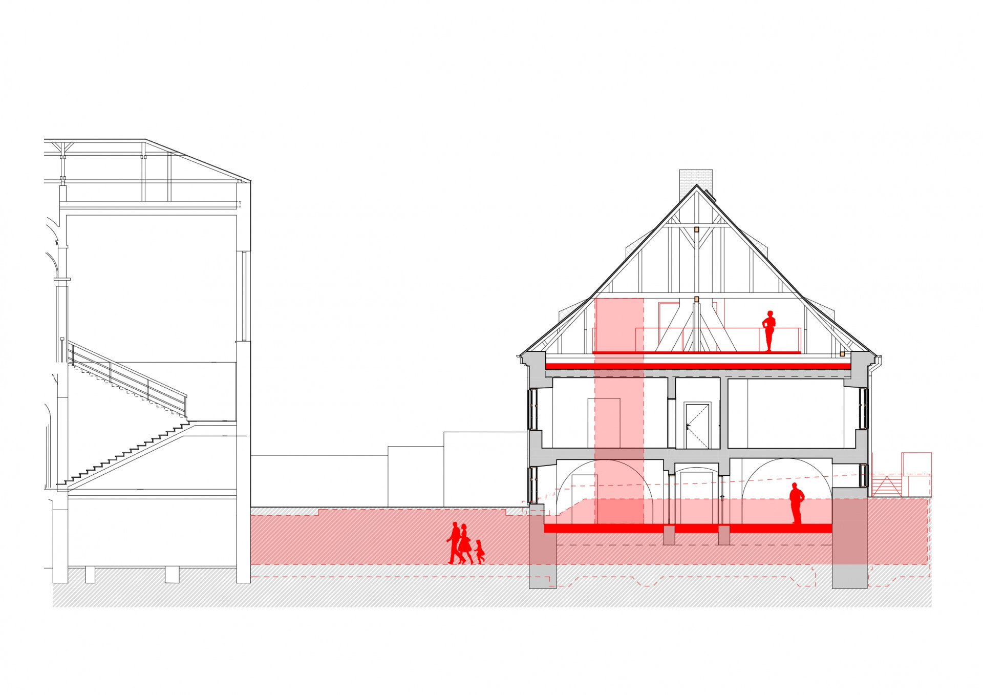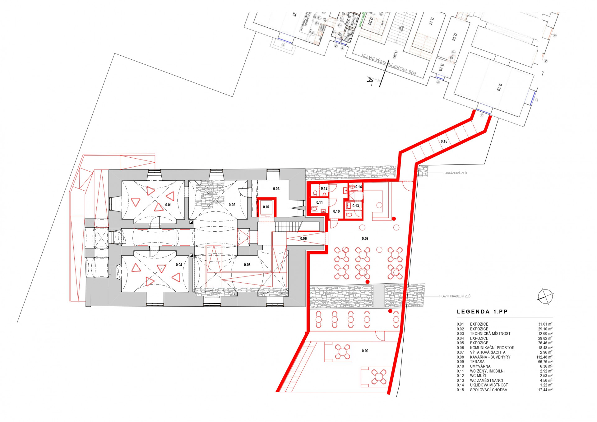 Další nové stavební vstupy do památky představuje výtah vložený do míst novodobých konstrukcí nebo podzemní propojení s historickým sídlem muzea. „V suterénu s klenbami jsme navrhli výstavní prostory, v patře podél západního průčelí přednáškový a výstavní prostor a v krovu se předpokládal další výstavní prostor,“ upřesňují architekti s tím, že podkroví je součástí prohlídkové expozice a nachází se v něm také typický kalhotový barokní komín.