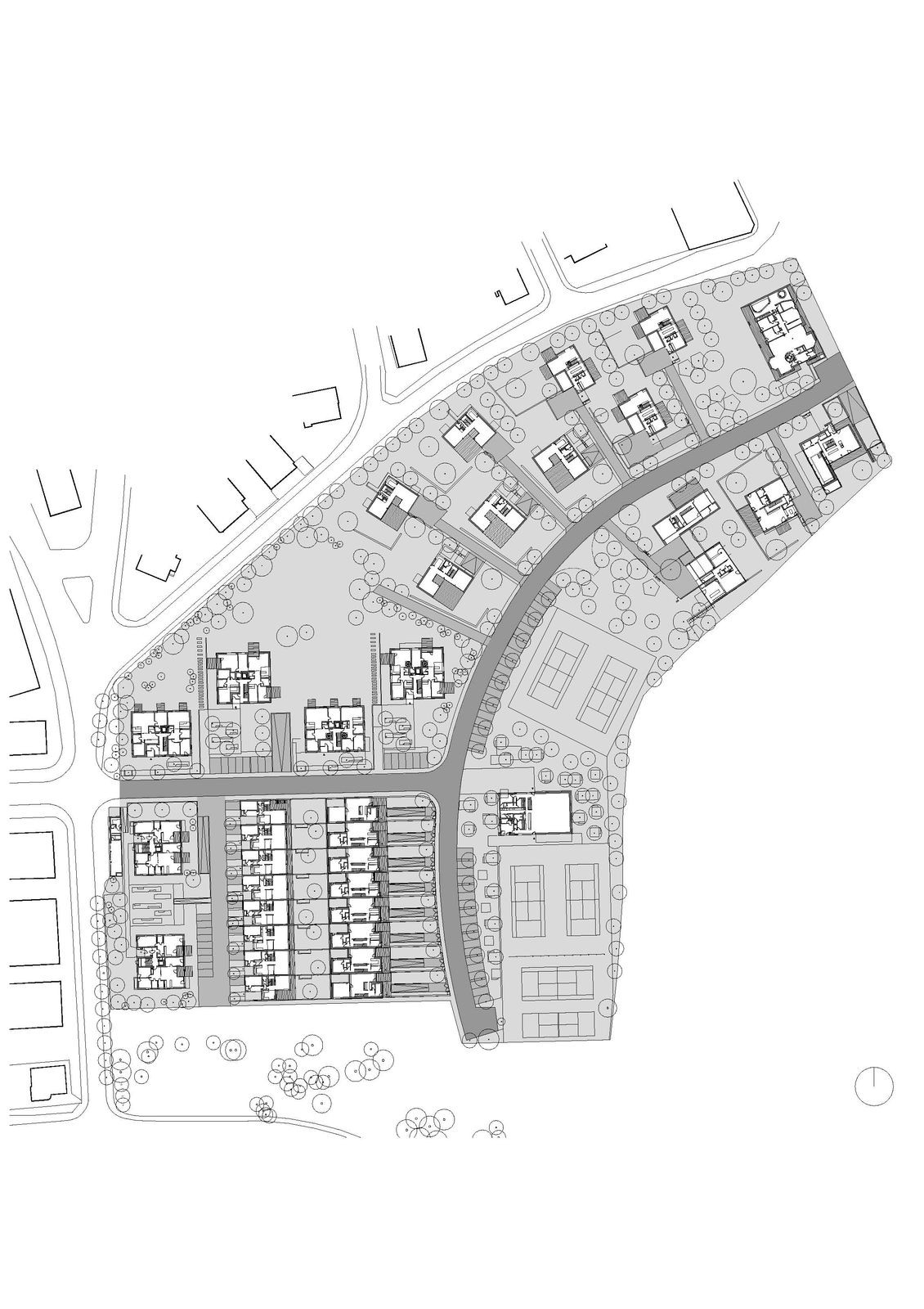 Vítězem a posléze autorem základní urbanistické regulace byla kancelář Kuba Pilař architekti. Pozemek, který se směrem od vjezdu na sever stále více a více svažuje, rozdělili do několika částí. V horní části, ještě poměrně rovné, je umístěno šest bytových domů, jejichž struktura navazuje na vilovou zástavbu ze 70. let. Nové objekty vytvářejí jakousi hradbu zajišťující klid a soukromí řadovým domům, které stojí za nimi. Následuje hrana svahu, za kterou se centrální komunikace více vlní, a kolem ní jsou postupně postaveny rodinné vily. Soubor obytných objektů je v horní části ještě doplněn o objekt sportovní haly a tenisové kurty.