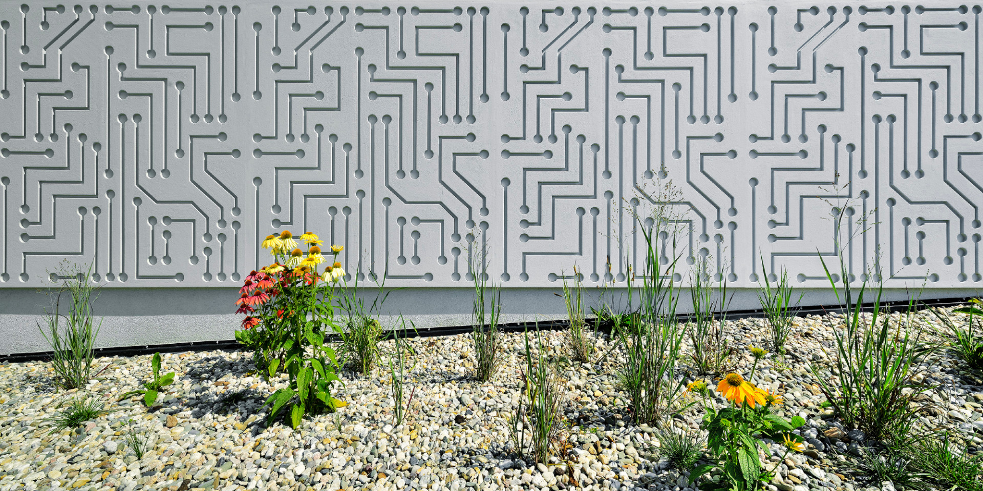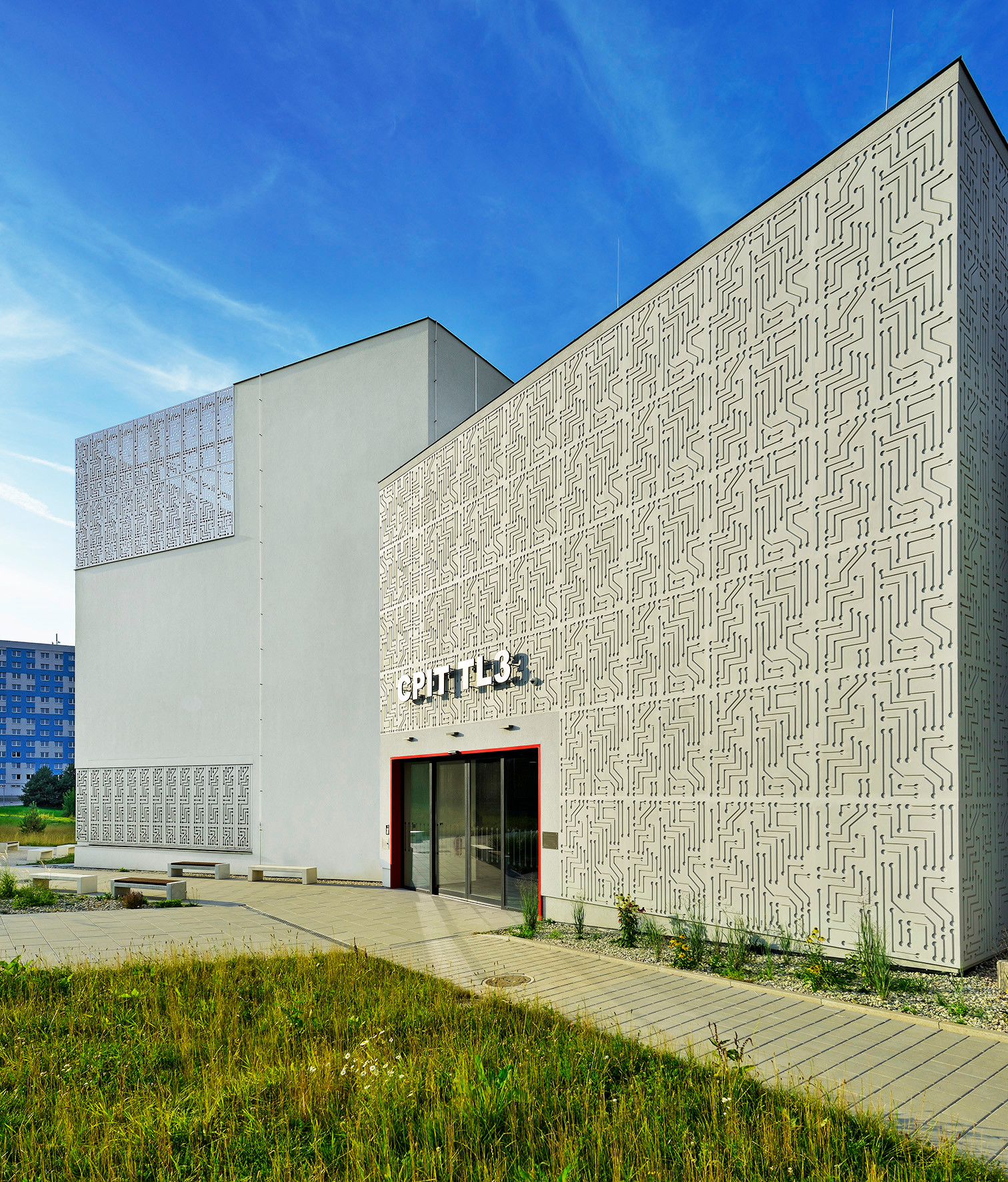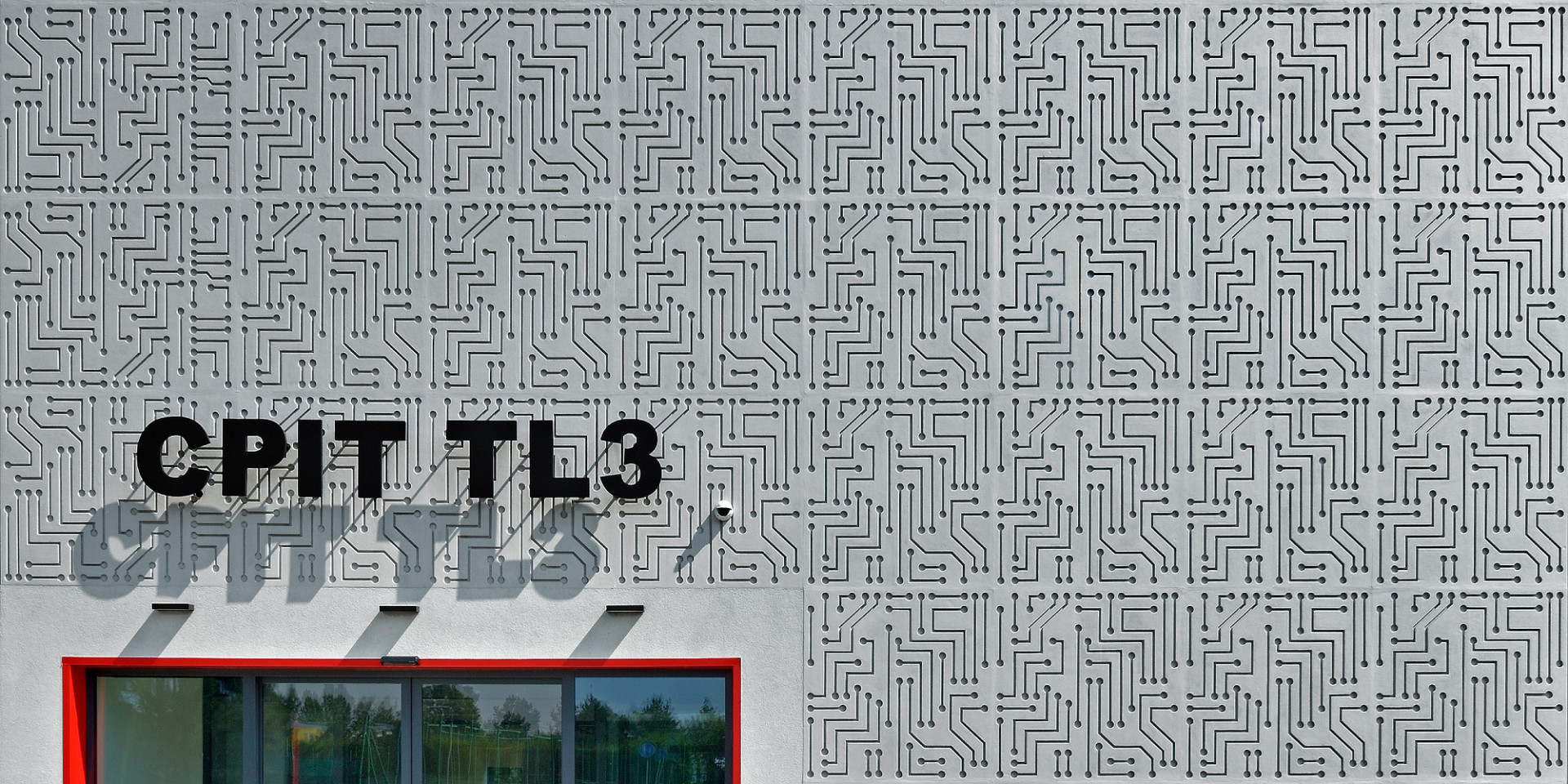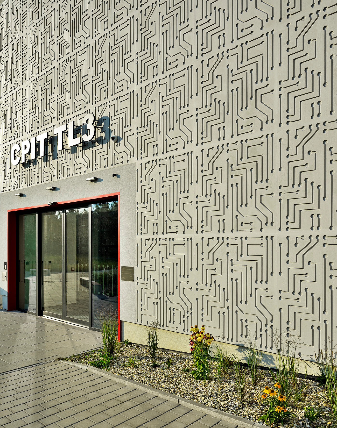 Specifický výraz dodává budově fasáda s reliéfní omítkou ve světle šedém odstínu. Tematicky zvolený vzor tištěných spojů se zde propisuje do finálního povrchu díky vyfrézovanému vzoru v tepelné izolaci. Stejný motiv se pak opakuje na aluco-bondových panelech okenic i na prosklených plochách, kde jej tvoří polep z UV stabilní folie.