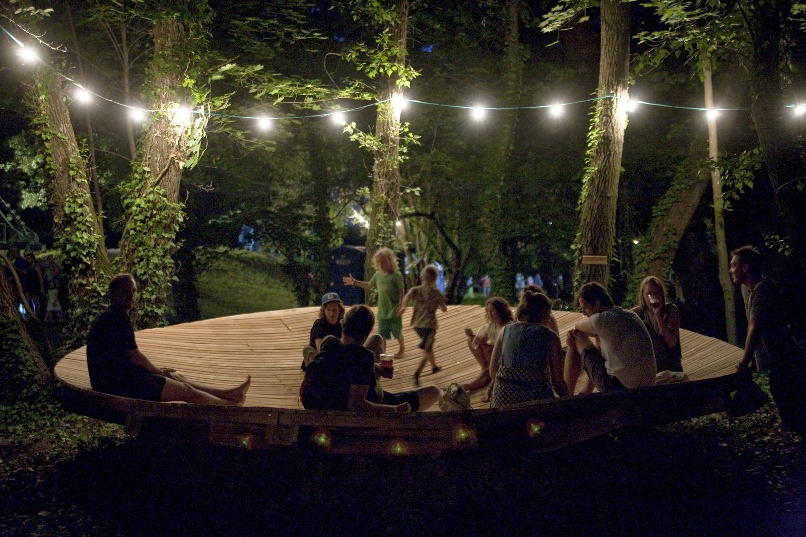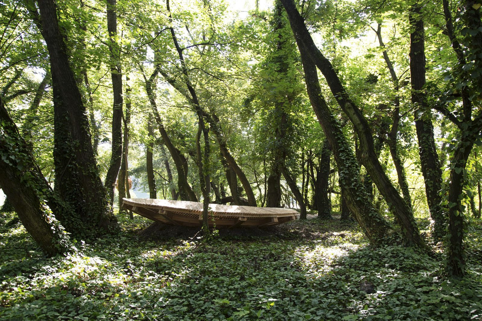 Konvexní dřevěná plocha je osazena mezi vzrostlé stromy na břečťanový koberec. Lze na ní sedět, ležet, pozorovat noční oblohu a cokoliv dalšího. Právě nejednoznačná funkce je pro tvůrce důležitá, objekt si bude žít svým vlastním životem a nikomu není diktováno, co na daném místě smí nebo nesmí dělat.