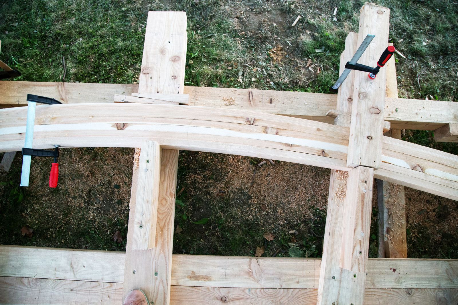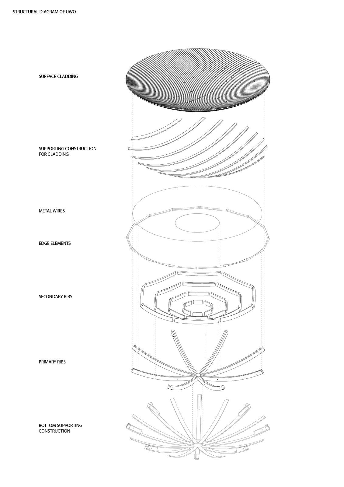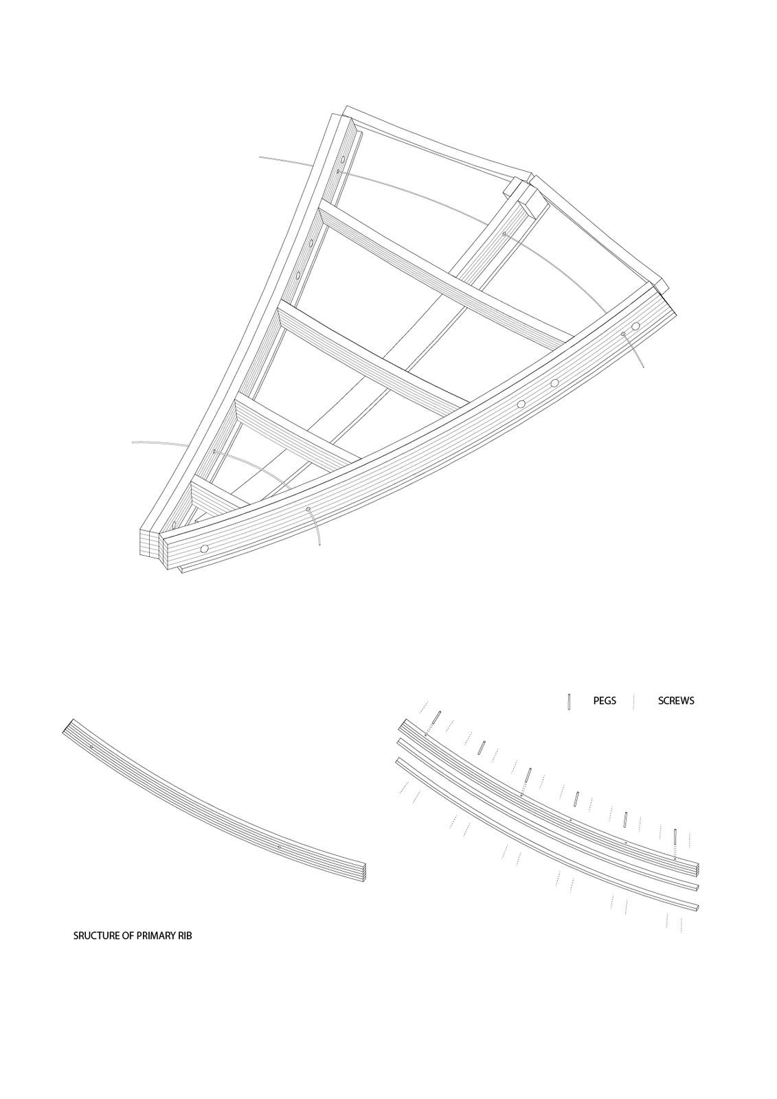 Podporná struktura konstrukce je tvořená vrstvením ohnutých profilů z červeného smrku. Nosníky jsou následně smontované do osmi trojúhelníků a poskládané do výsledného tvaru kulového vrchníku přímo na místě. Objekt má v průměru 5,5 m a váží přibližně 600 kg.