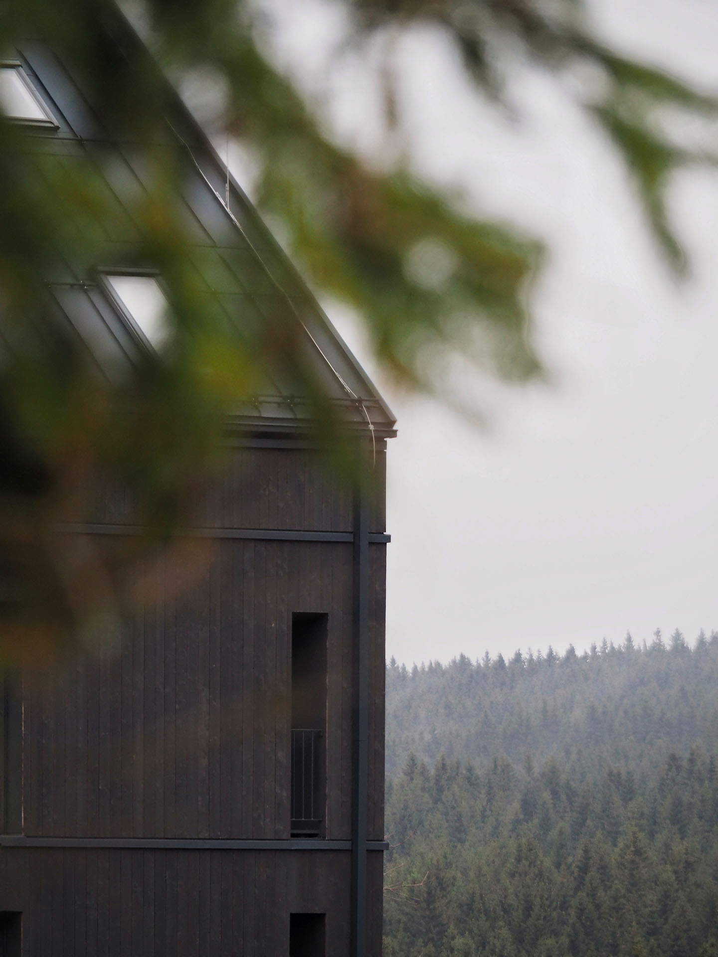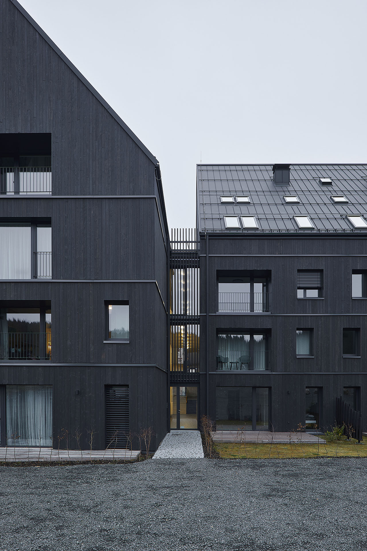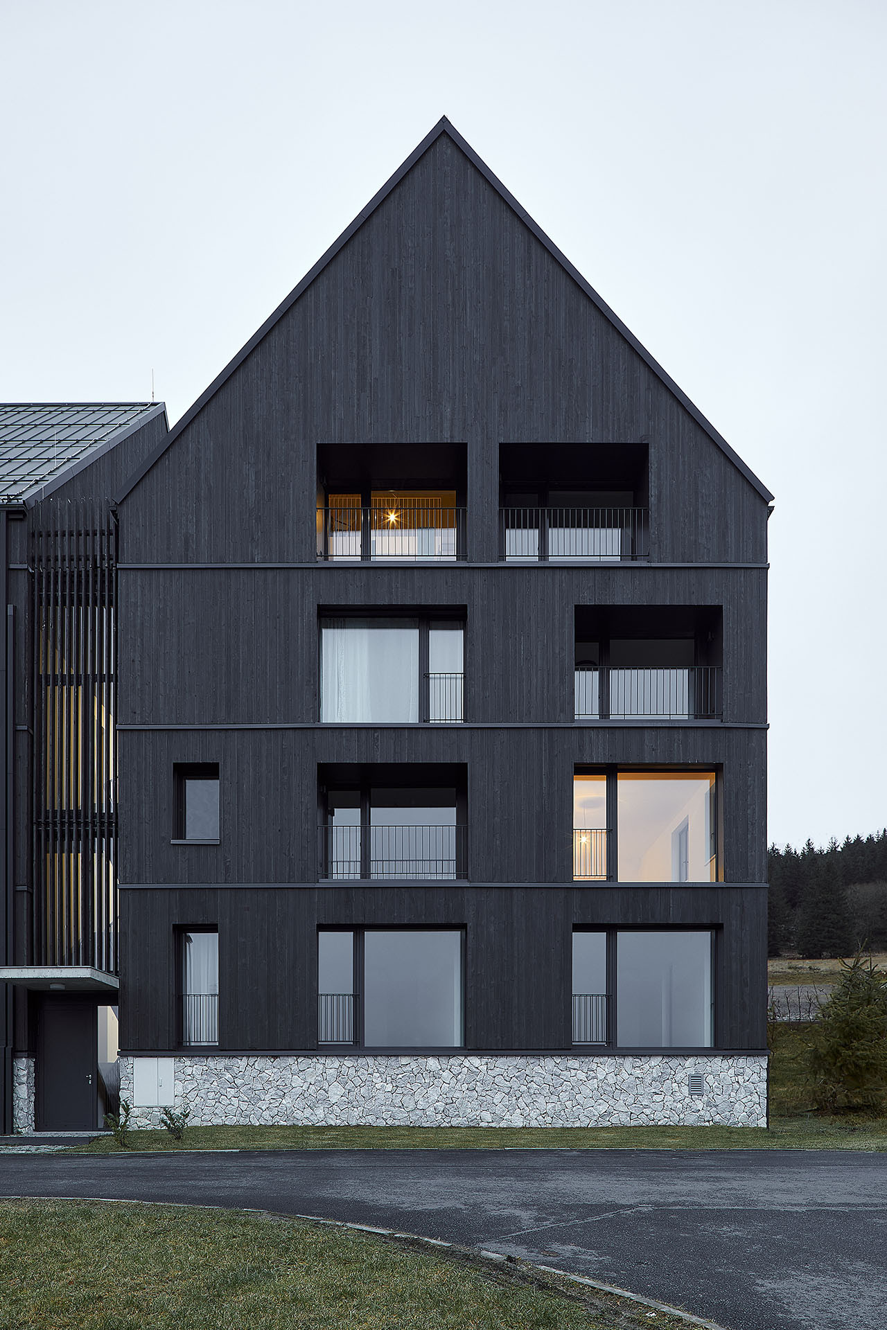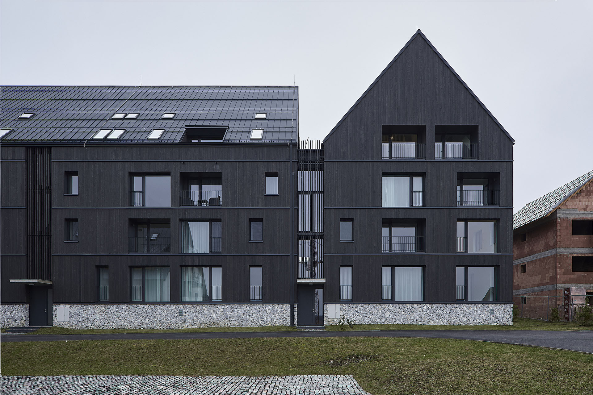 Čtyřpodlažní bytovku obklopuje příroda a velká okna poskytují cenné výhledy do horské krajiny. „Dům respektuje základní principy krušnohorské architektury a okolní kopcovitou krajinu. Tradiční forma je interpretována soudobým architektonickým jazykem a vzniká tak spojení stavby a okolních hlubokých lesů,“ říkají architekti ze studia monom.