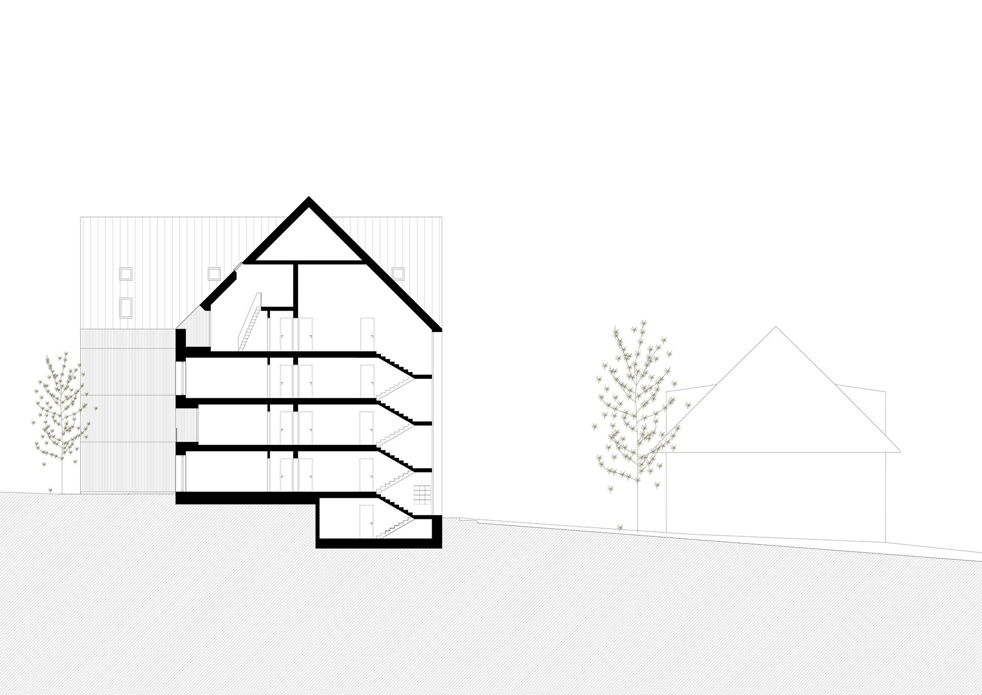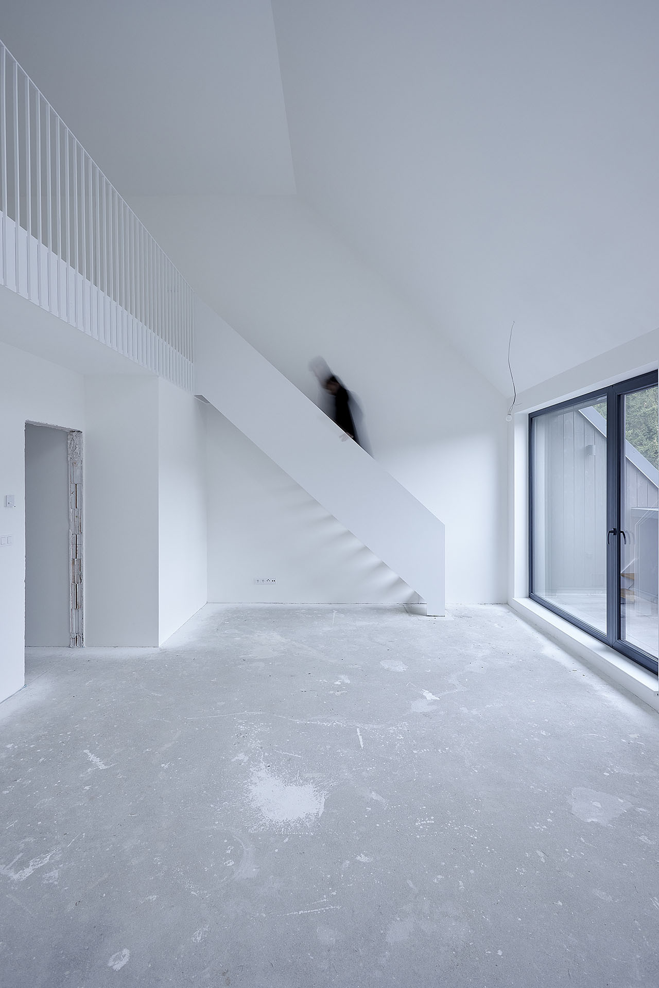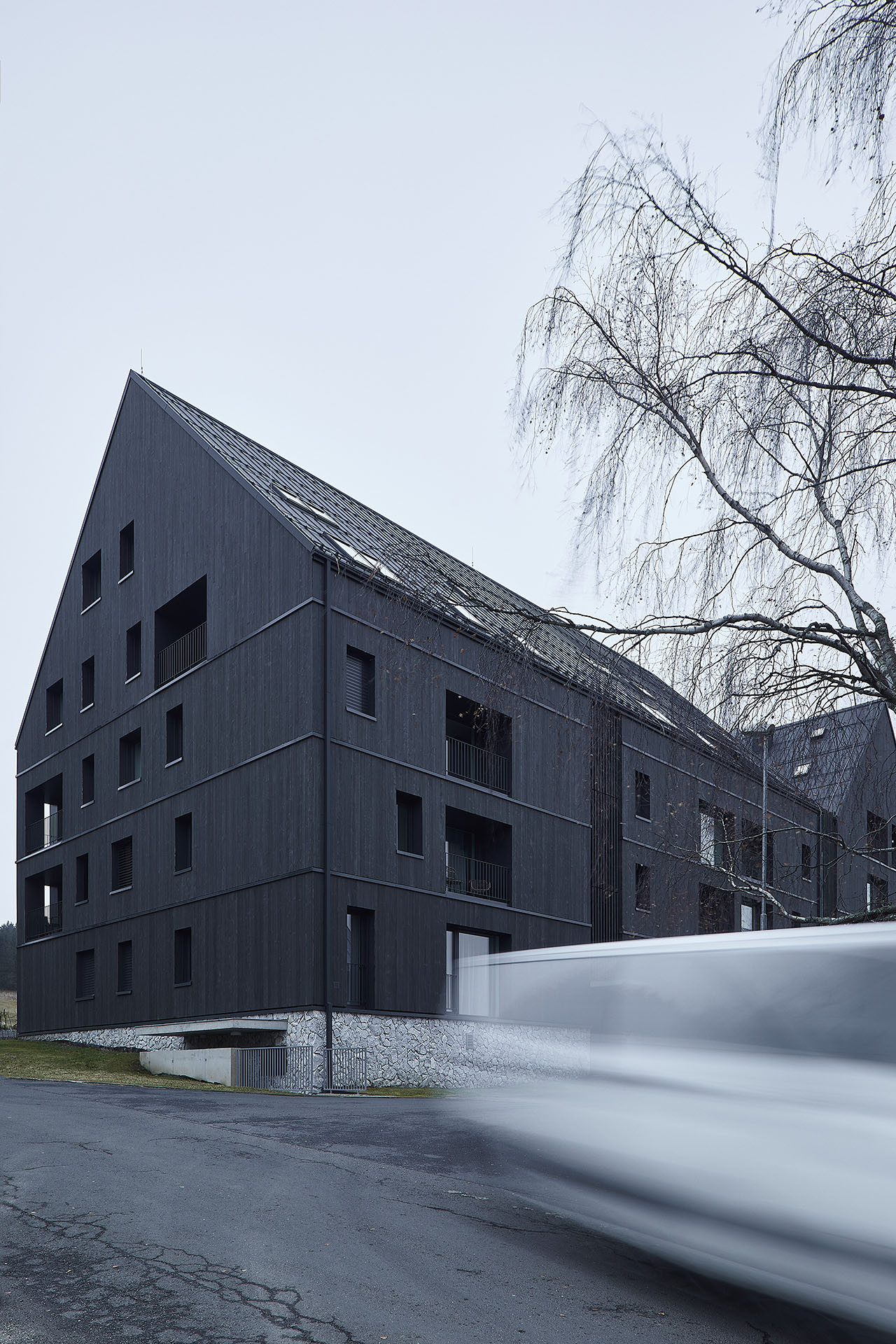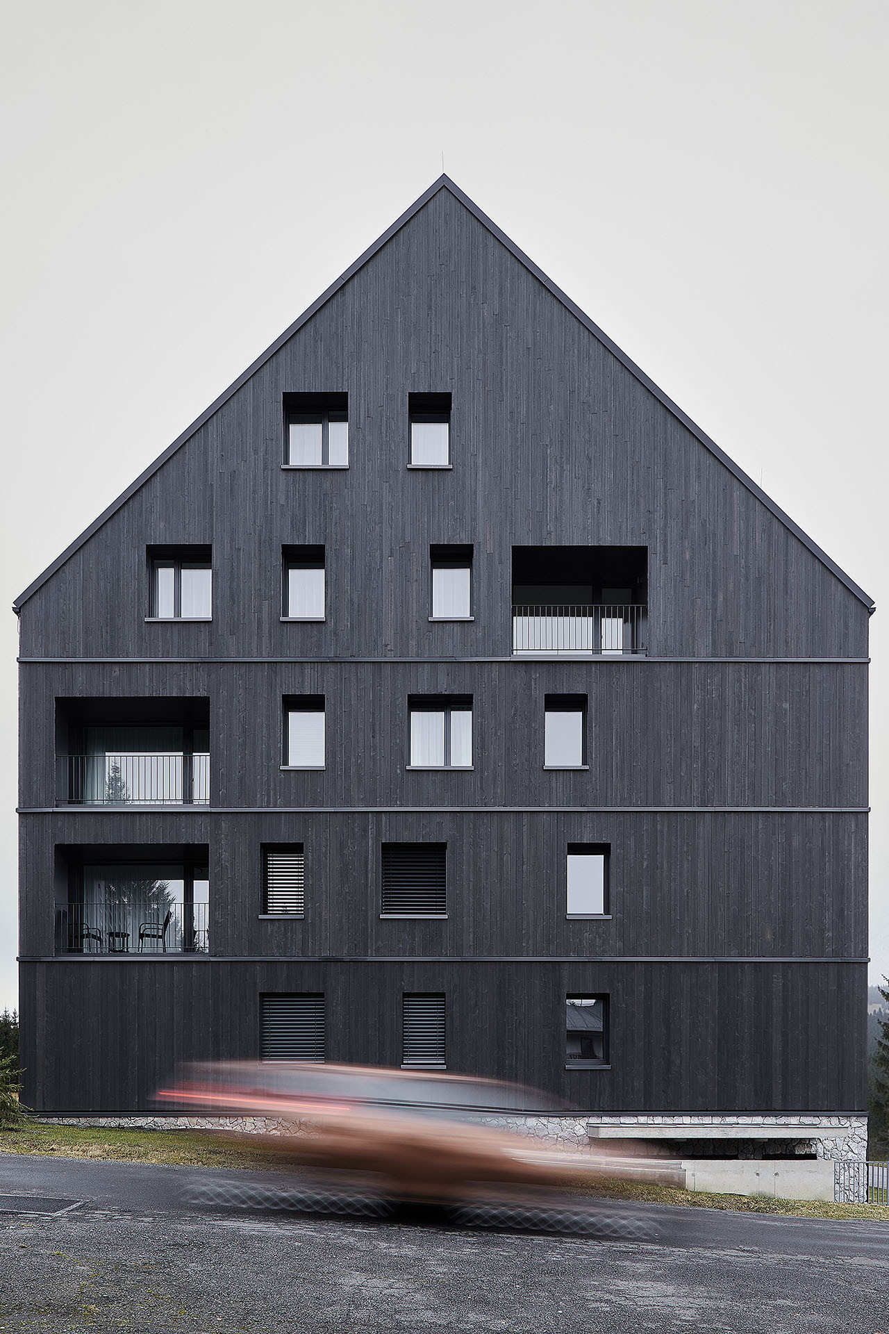 Čtyřpodlažní bytovku obklopuje příroda a velká okna poskytují cenné výhledy do horské krajiny. „Dům respektuje základní principy krušnohorské architektury a okolní kopcovitou krajinu. Tradiční forma je interpretována soudobým architektonickým jazykem a vzniká tak spojení stavby a okolních hlubokých lesů,“ říkají architekti ze studia monom.
