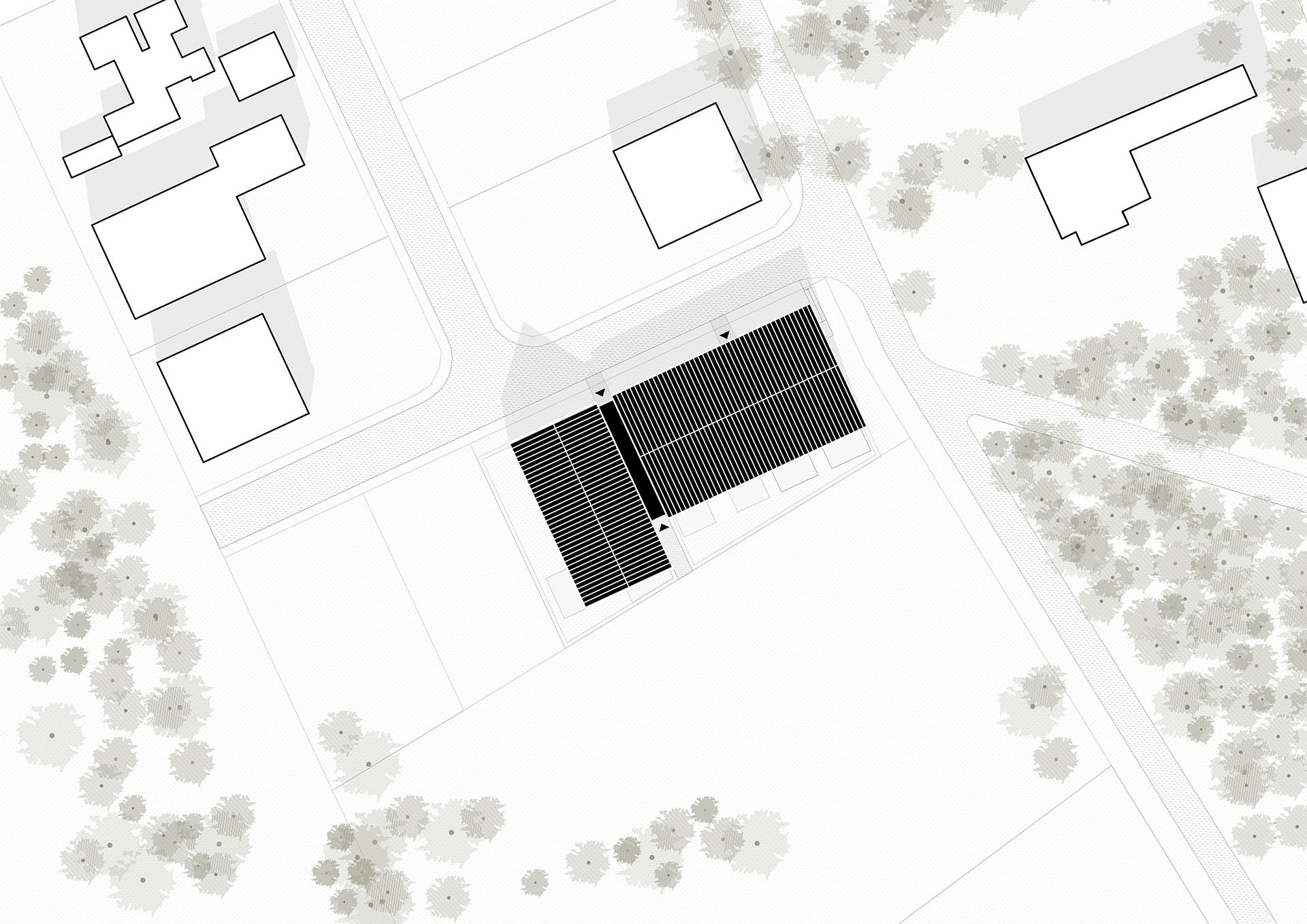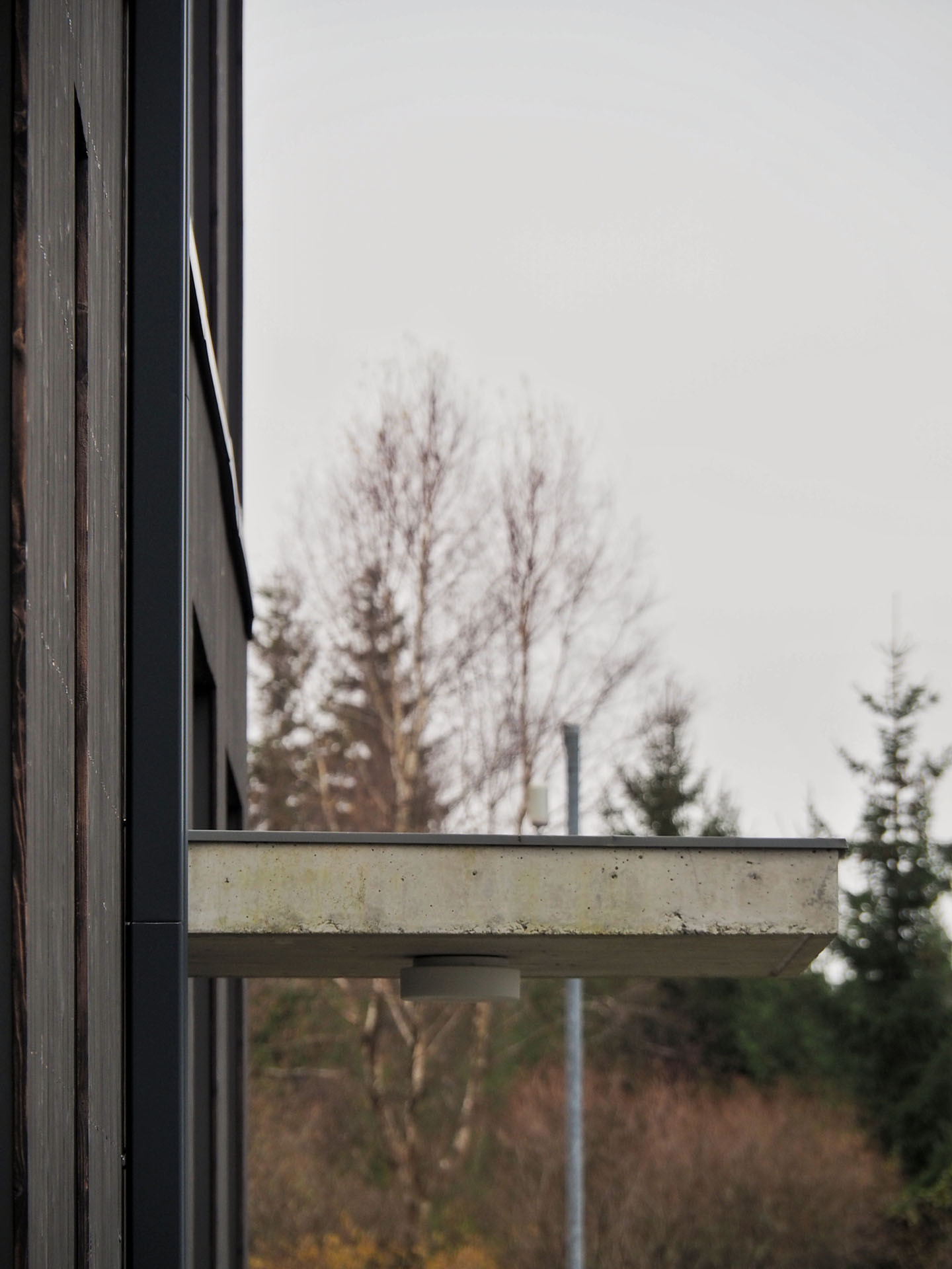Dům architekti rozdělili na dvě jednoduché hmoty se sedlovými střechami. K zemi stavbu ukotvuje kamenný sokl a výraznou figuru ještě podtrhuje tmavá opalovaná fasáda. Tato tradiční technika zajistí dřevu dlouhou životnost. Střešní prvky jsou také sjednoceny do tmavé barvy, tak aby byla zachována výtvarná kompaktnost domu.