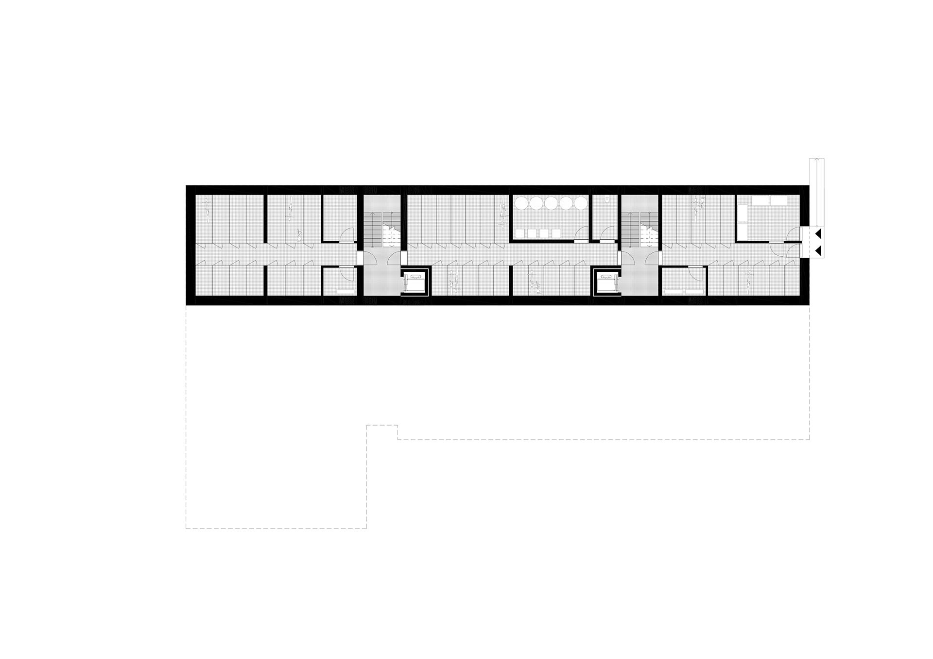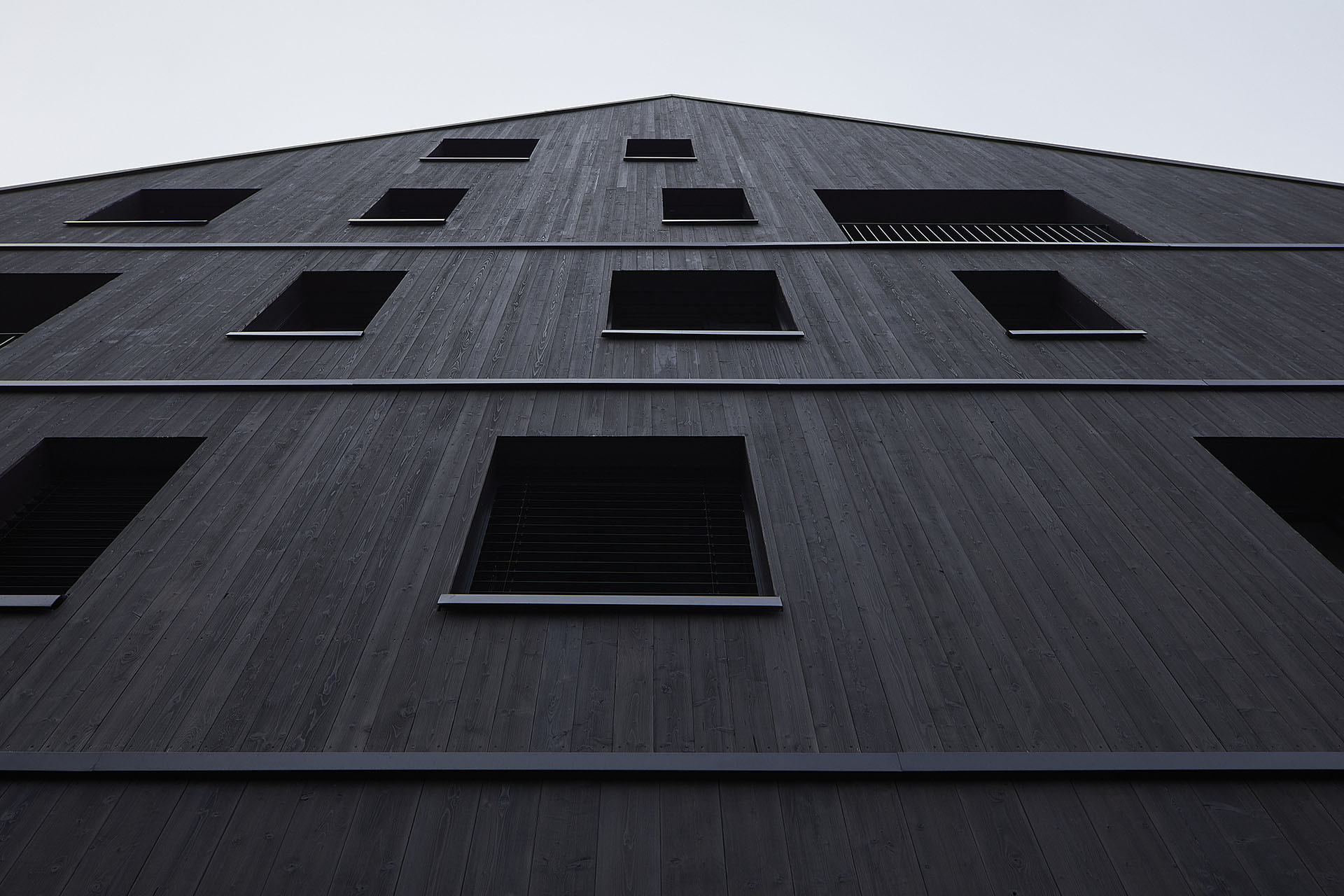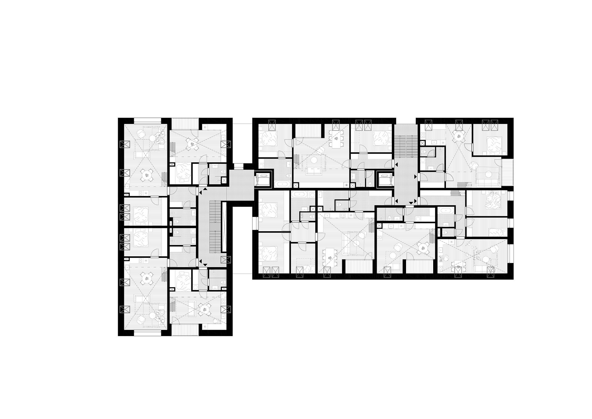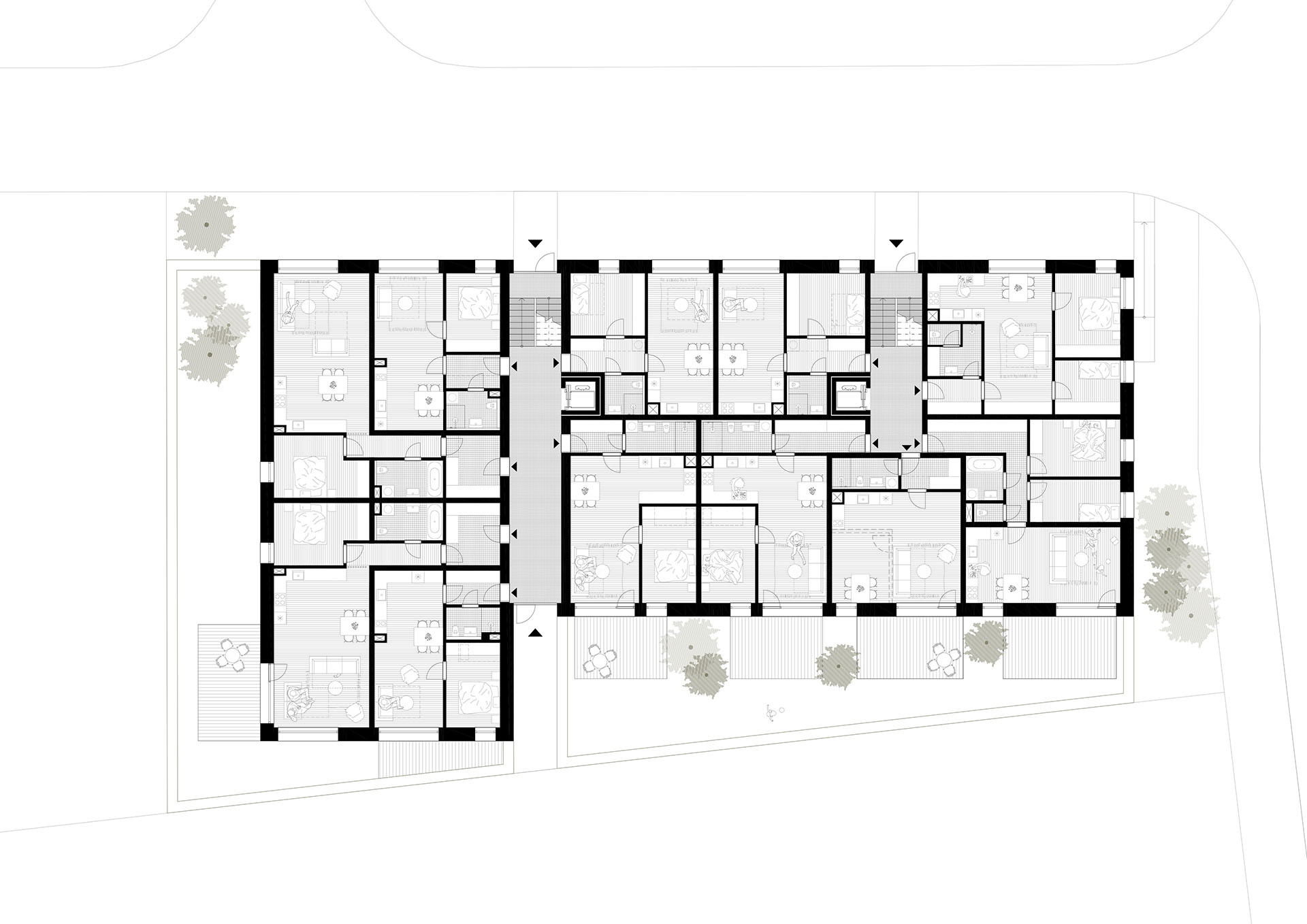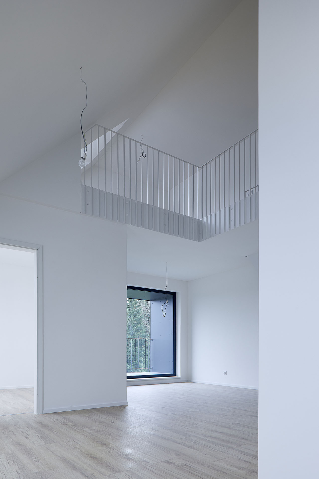 Uvnitř se nachází celkem 42 bytů s širokou škálou uspořádání vyhovující rozličným potřebám obyvatel. „Převažující dvoupokojové byty doplňují velkorysé loftové byty situované v nejvyšším podlaží s převýšenými prostory v podkrovní části domu. Veškeré byty jsou navrženy s velkoformátovými okny či lodžiemi umocňujícími výhled do okolní krajiny. K bytům v kontaktu s terénem přiléhají předzahrádky s dřevěnými terasami. Loftové byty mají zase přístup na střešní terasy, jež jsou nenápadně zapojené do hmoty domu,“ popisují autoři.