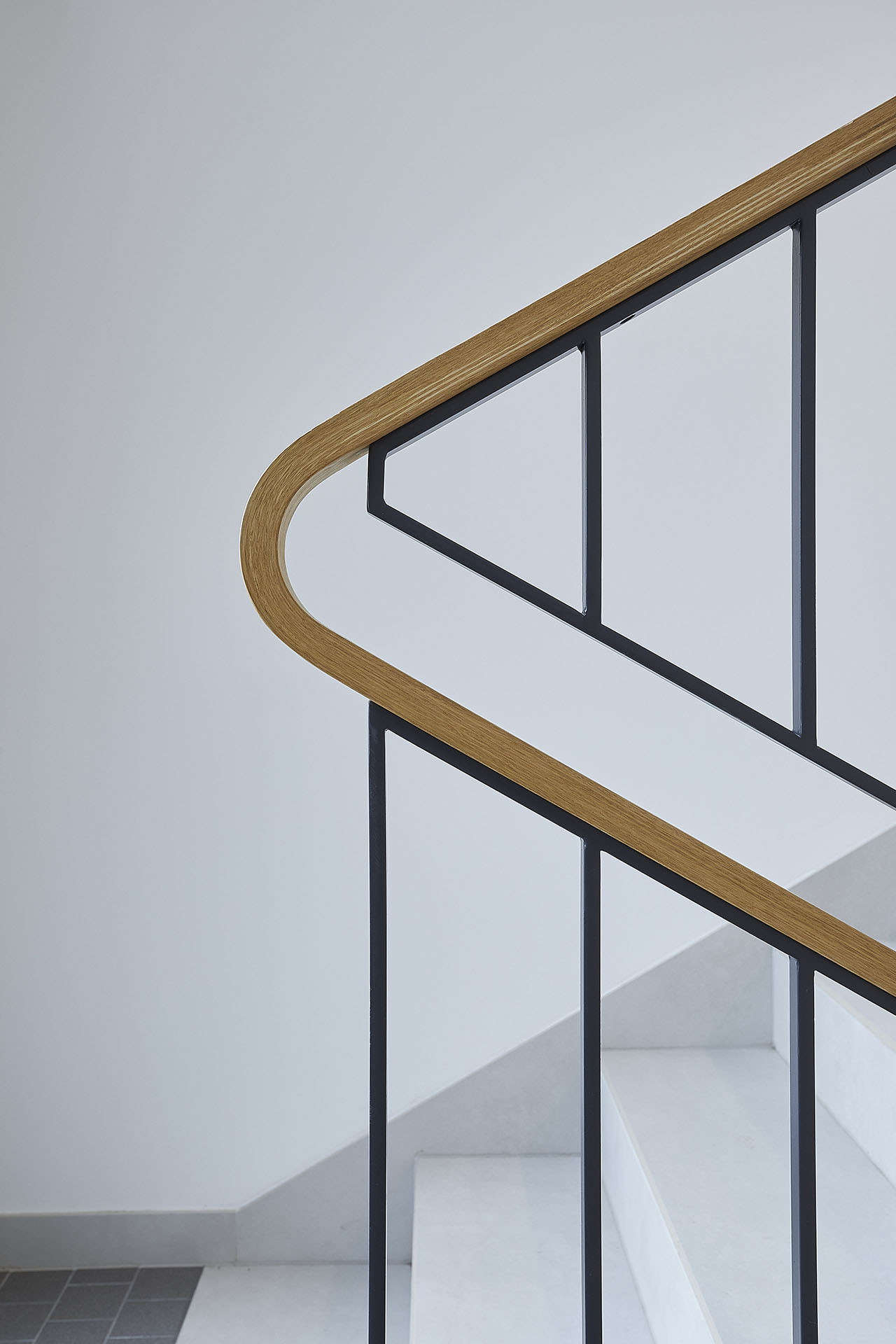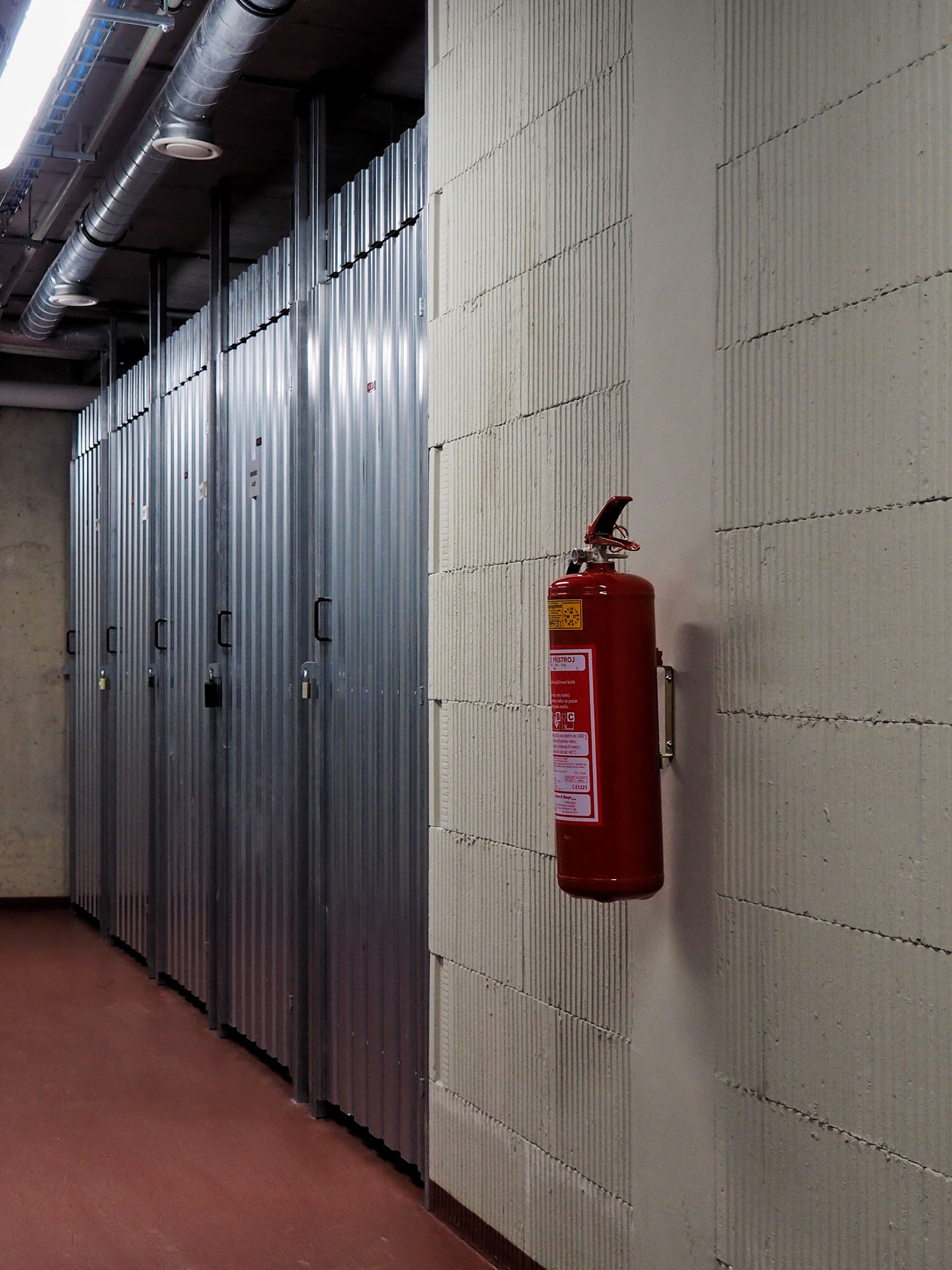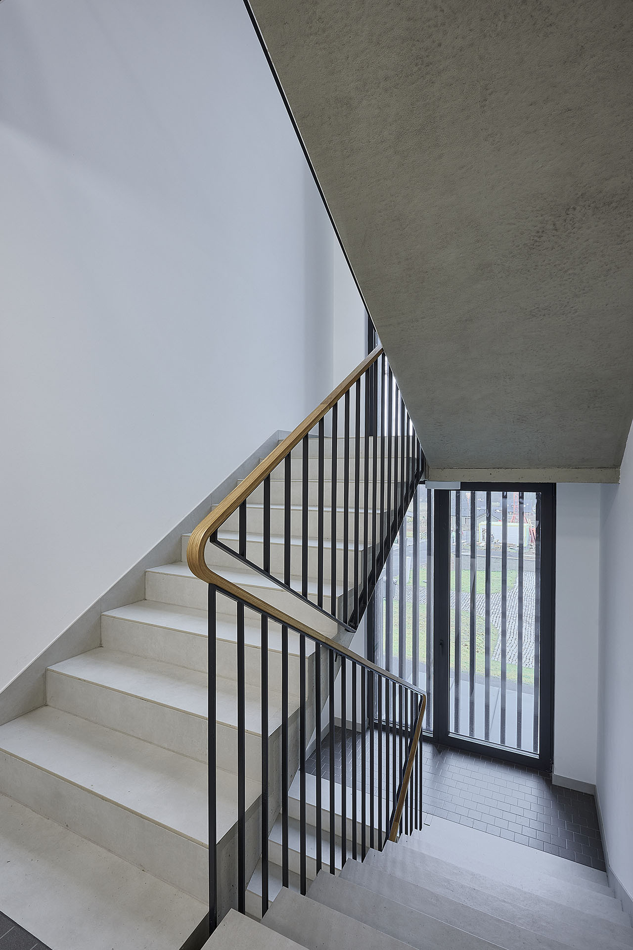 V částečně zapuštěném podzemním podlaží se nachází technické zázemí domu a sklepní kóje k jednotlivým bytům. Na chodbách a ve zbylých společných prostorách domu najdeme sjednocenou infografiku nebo promyšlené detaily jako atypické madlo schodiště z ohýbaného dřeva či poštovní schránky.