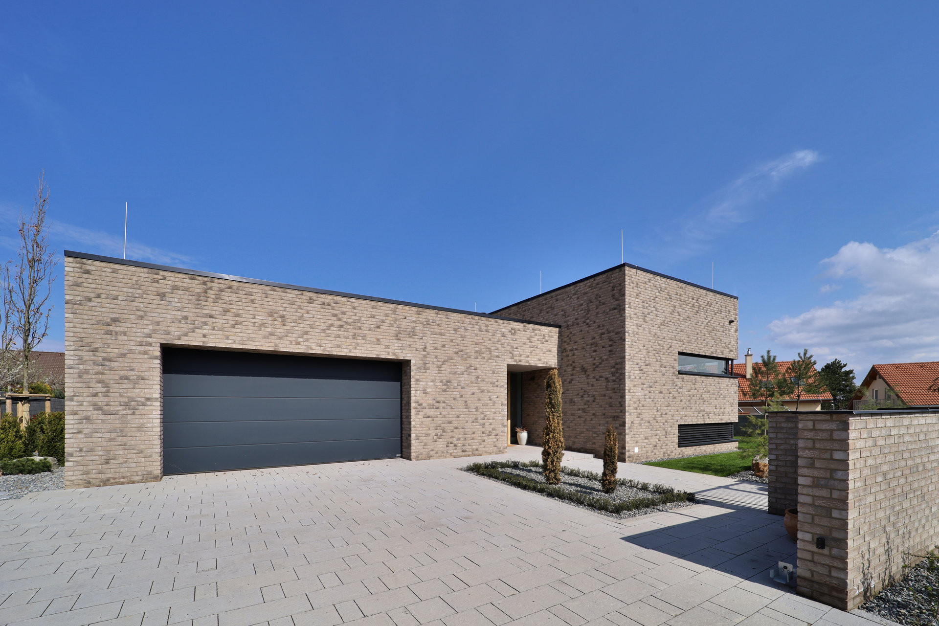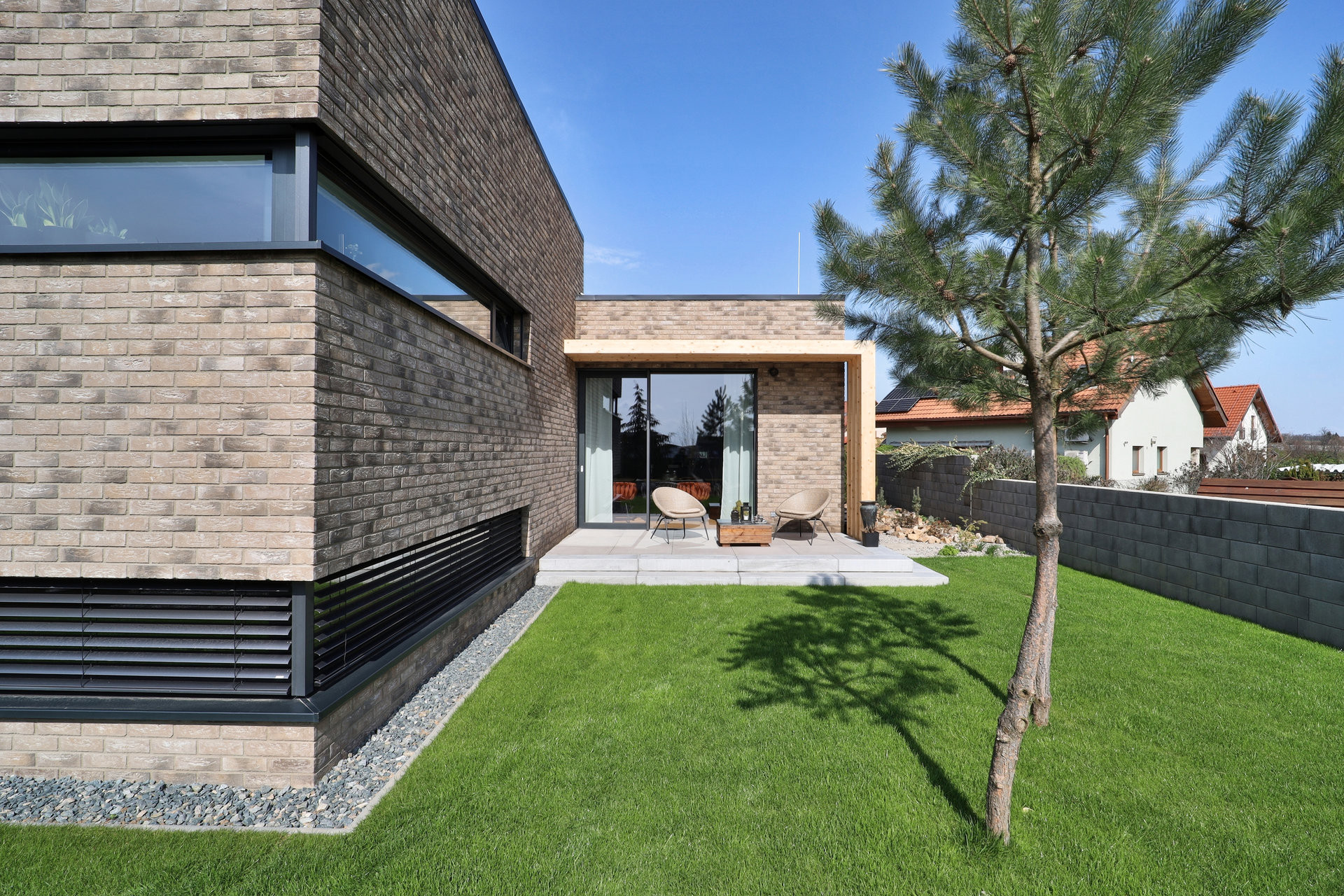 Na fasádu použili cihelný pásek, což nebyla náhoda: „Cihla je má velká láska ruku v ruce s láskou k Anglii. Miluji cihlové domy. I náš předešlý dům byl z části obložený cihlou v červené barvě. U nového domu jsme zvolili odlišný odstín, který více navozuje skandinávský styl. Na druhé straně je obložení cihlou praktické z hlediska údržby a trvanlivosti,“ říká. Obkladový cihlový pásek dodala firma Klinker Centrum.