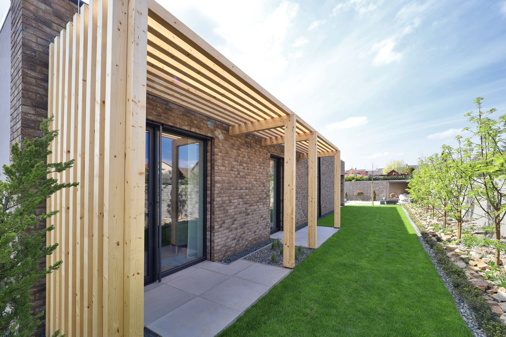 Julie Kočárková bydlela s rodinou v tradičním domě se sedlovou střechou v malém městě na Jižní Moravě. Pozemek nedaleko koupili spíš jako investici do budoucna, ale majitelku neodolatelně přitahoval. „Sedávala jsem uprostřed pozemku ráno, v poledne i večer. Sledovala jsem slunce, stíny. Přála jsem si mít kuchyň na východní straně, jídelní stůl také s propojením na terasu, která ráno doslova vybízí k vypití kávy či čaje a je zalitá sluncem a odpoledne poskytne stín. Pak už jsem tam chodívala sedávat s papírem a tužkou a myšlenky zrozené v hlavě jsem přenášela na papír,“ říká Julie Kočárková v rozhovoru pro online magazín Můj dům krok za krokem.