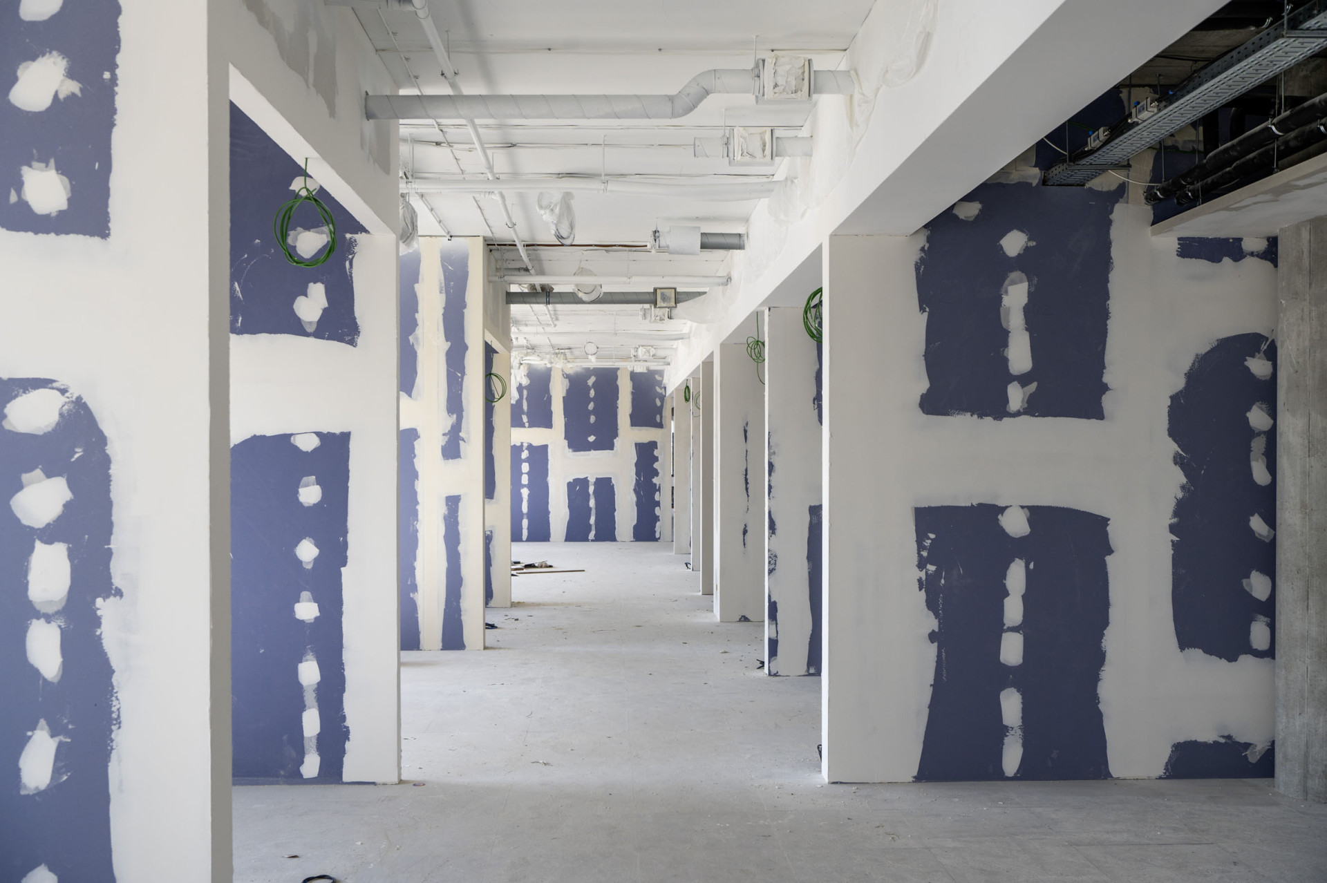 Řešení jednotlivých pater je prakticky identické. Na každém patře se nacházejí otevřené moderní kanceláře. Součástí prostoru jsou dále menší zasedací místnosti, akusticky izolované buňky pro telefonování, relaxační prostory s pohovkami a křesly, a samozřejmě nechybí sociální zázemí, kuchyňky, osobní skříňky pro úschovu věcí atd. Předem lze shrnout, že všechny sádrokartonové příčky byly navrženy v systému W112. Rozdíly jsou ve volbě příslušných sádrokartonových desek. Tak například se na jednom z pater nachází rozvodna T-Mobilu, navíc rozdělena na dvě poloviny (silnoproud/slaboproud), která si z důvodu ochrany proti požáru vyžádala dvojnásobný záklop červenými deskami RED Piano (EI 60 minut). Zajímavým způsobem s ohledem na akustickou izolaci jsou řešené menší uzavřené kanceláře. Dělicí příčky W112 jsou z jedné strany opláštěny dvěma deskami Knauf Diamant a z druhé strany dvěma deskami Knauf Silentboard. Ve všech kancelářích, kde je instalovaná audio-video technika, jsou k těmto příčkám navíc postaveny předstěny W626 (z jedné nebo z obou stran), již ale ze standardních desek White, taktéž se dvěma záklopy. Na vnějším záklopu byla deska částečně vyříznuta a do toho místa je vložená pohltivá deska Knauf Cleneo s identickým děrováním 8/18. Cílem tohoto netradičního řešení byla nejen vynikající stavební akustika, ale i komfortní prostorová akustika v místnosti zejména při používání audio-video techniky. Parametr vzduchové neprůzvučnosti dělicí příčky byl v těchto případech Rw=58 dB. Rastr konstrukce byl opět z důvodu vylepšení tuhosti příček zhuštěn. Většina příček končila v napojení na fasádu se špaletou okna. V kancelářských prostorách ještě najdeme svěšené příčky a pochopitelně podhledy. Pro doplnění na celé ploše jsou zdvojené podlahy, pod kterými vedou příslušné instalace. Barevně umírněné řešení interiéru je zpestřeno velkoformátovými fotografiemi na stěnách, dřevěnými stoly a barevnými detaily, například relaxačními křesílky apod. Interiér tak celkově působí „teplým“ dojmem.