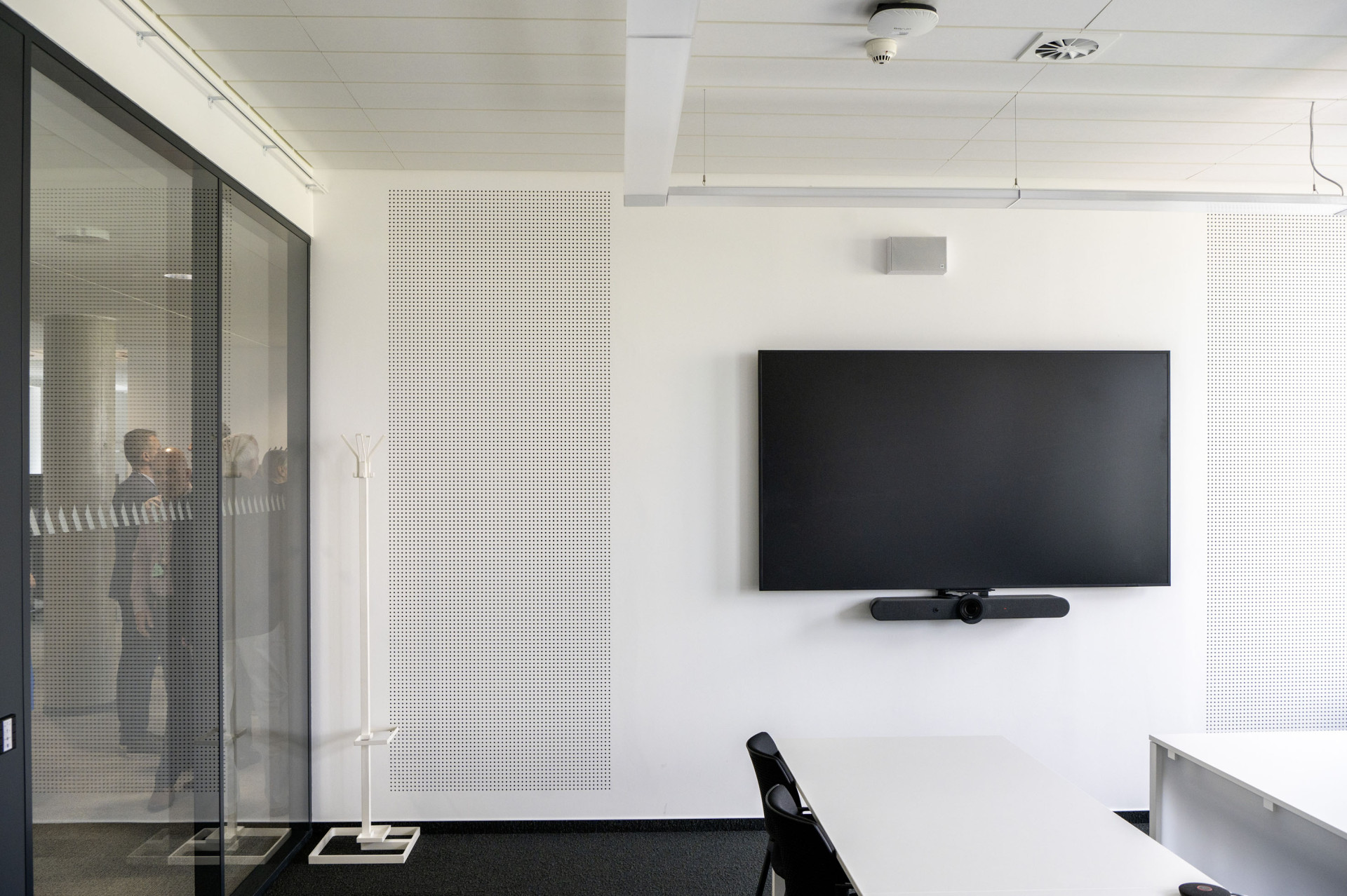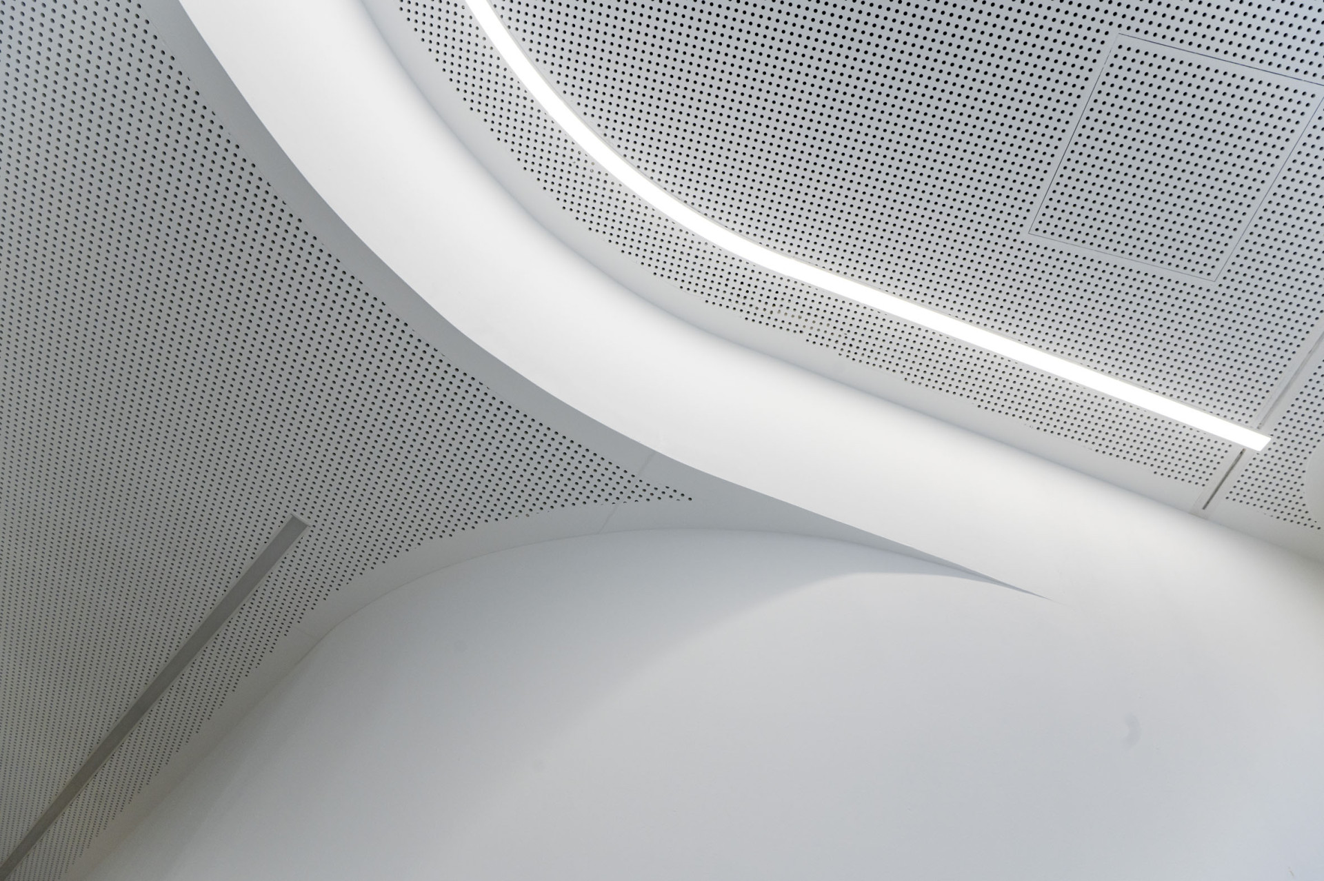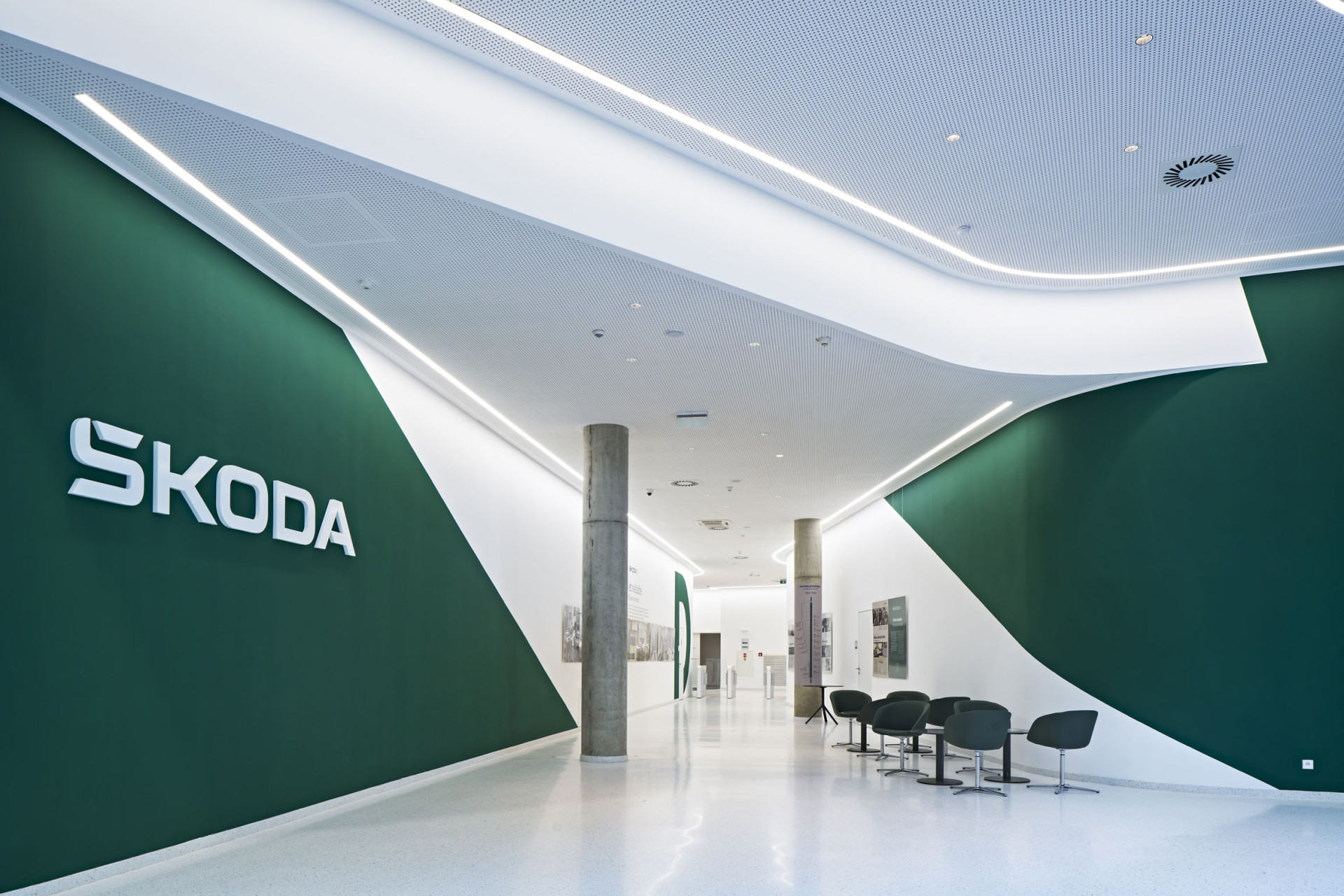 Prakticky v celé ploše přízemí si návštěvník nemůže nevšimnout sádrokartonového podhledu jehož design zvýrazňují děrované desky Knauf Cleaneo. Nutno říci, že projektantům nešlo primárně jen o design, i když ten je v případě této novodobé administrativní budovy rovněž důležitý, ale také o vytvoření odpovídajícího akustického komfortu, který je pro prostory s kumulací většího počtu lidí nutný. Pro účely přízemí budovy bylo zvoleno kulaté děrování 8/18. Spáry mezi deskami byly vytmeleny částečně Uniflottem a částečně tmelem Knauf Jet-Filler. Kromě estetiky a akustických vlastností mají Cleaneo desky schopnost tzv. „Cleaneo efektu“, tedy čištění vzduchu od různých pachů, což v případě kancelářských budov a přítomnosti gastro provozů je jistě nezanedbatelná výhoda. O výsledném akustickém komfortu jsme se mohli přesvědčit při slavnostním otevření budovy za přítomnosti celé řady významných osobností z vedení koncernu a novinářské obce.