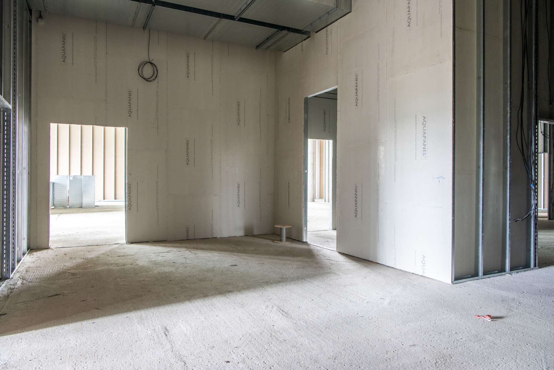 Aby mohl v přízemí vzniknout gastro provoz, bylo nutné nejprve postavit pevný korpus a na něj následně navázat příčky, které rozdělí podle potřeb provozu interiér. Základním „stavebním kamenem“ se proto stala stěna v klasické skladbě W112 dvakrát opláštěná požárními deskami Knauf RED Piano. K této příčce byla navíc za pomoci CD a UD profilů provedena další předstěna, kterou již tvořily bílé desky Knauf White. Tím bylo dosaženo potřebné tuhosti a pevnosti konstrukce. Výsledná tloušťka této stěny je 38 cm. Gastro provoz je dále rozdělen do několika prostorů podle zaměření. Ve většině případů bylo rozčlenění gastro provozu provedeno příčkami, ve kterých se z důvodu přítomné vlhkosti použily speciální cementové desky Knauf AQUAPANEL Indoor, mezi jejichž vlastnosti patří právě 100% rezistence vůči vlhku. Všechny konstrukce mají dvojité opláštění z každé strany.