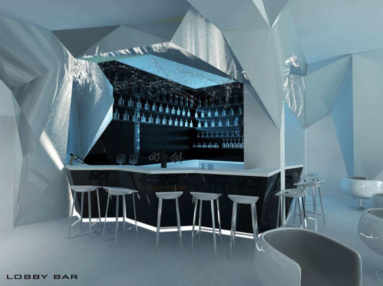 Návrh interiéru vychází z motivu ledu či ledové kry, která se "nabourala" do čistých tvarů základní konstrukce hotelového prostoru. Struktura, která se prolíná celým interiérem je složena z jednotlivých trojúhelníků, které jsou k sobě vzájemně natáčeny a vytváří tak efekt odlomeného ledu. "led" se táhne převážně po stěnách nebo místy přechází nad bary nebo do recepčního pultu. Tato poněkud roztříštěná struktura bude doplněna pouze jednoduchými prvky. Většina povrchů bude v bílé nebo světlé barvě a jako kontrast je využívána barva černá, použitá na stolcích, osvětlení a barech.