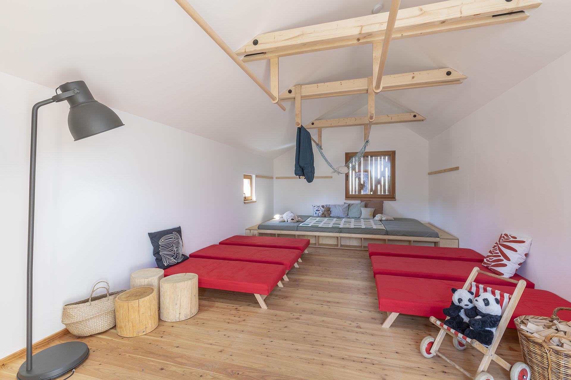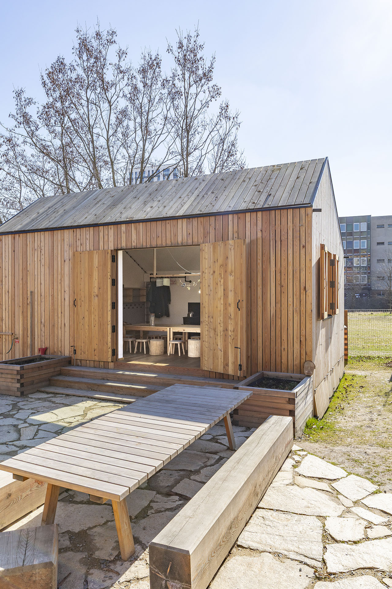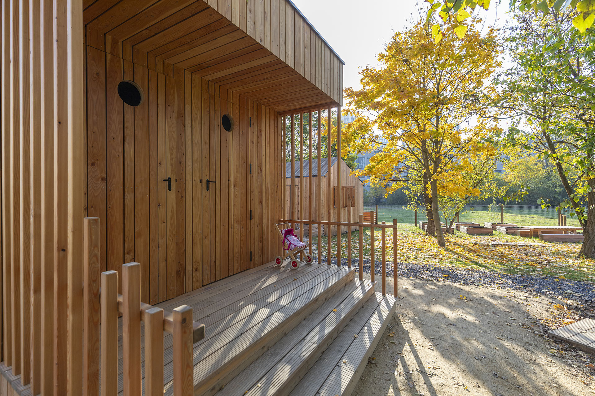 Právě kvalitní, příjemný a současně udržitelný venkovní prostor je pro projekt zásadní. Dopoledne sice děti chodí na procházku do okolí, odpoledne už ale tráví čas v areálu. Pro svůj rozvoj a hru toho v něm mají hodně. Jsou zde stoly s lavičkami, místo, kde se ráno shromažďují pro ranní kruh, pískoviště přirozeně zakomponované do terénu, vyvýšené záhony, ve kterých už teď raší první úroda. A pak také drobné dřevěné domečky, do kterých se dá schovat, když třeba trošku poprchá. Děti totiž se svými průvodci v lesních školkách pobývají venku i za nepříznivého počasí a také ve všech ročních obdobích, učí se tak bezprostřednímu vnímání ročního cyklu, snášet nepohodu a vnímat různé aspekty přírody.
