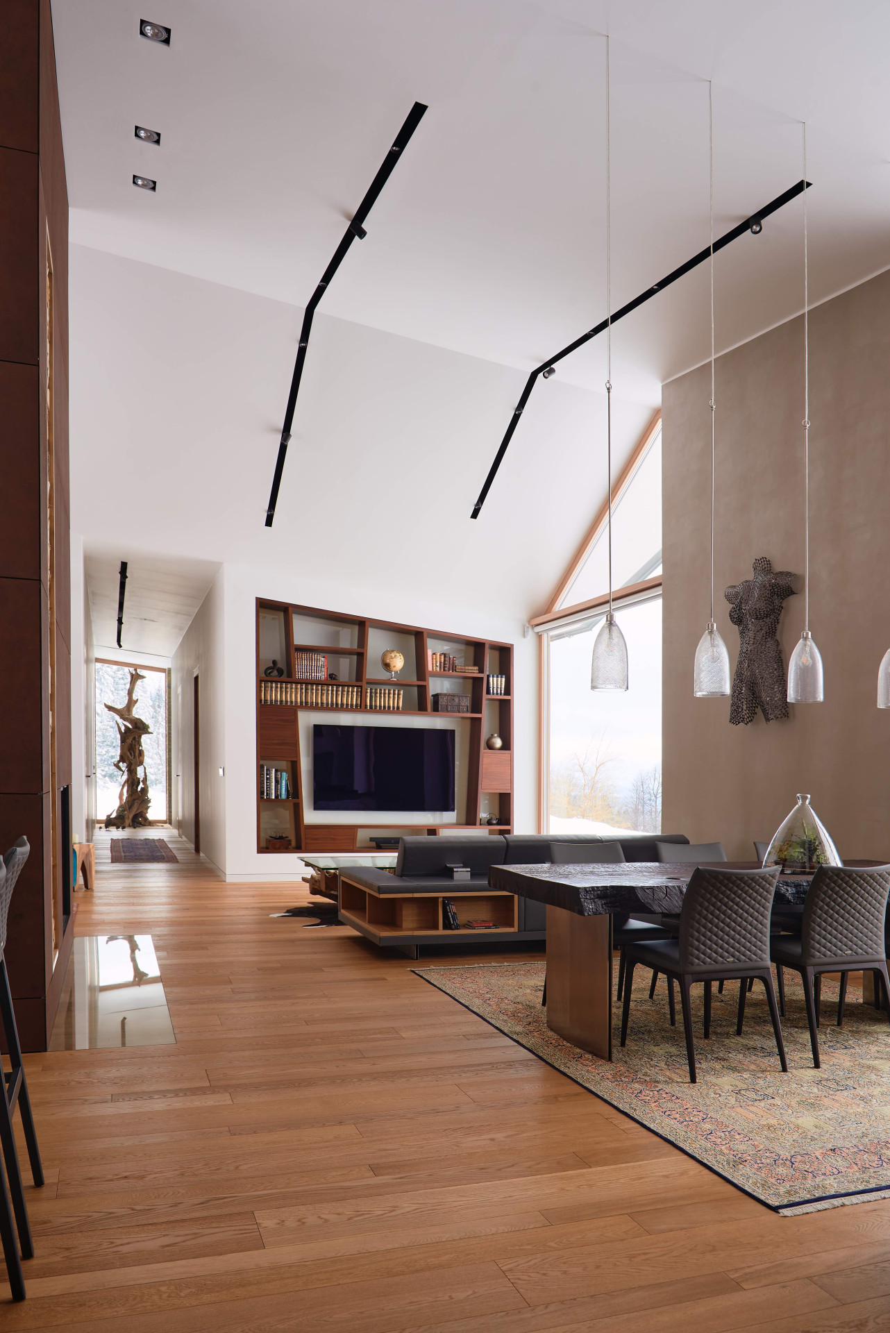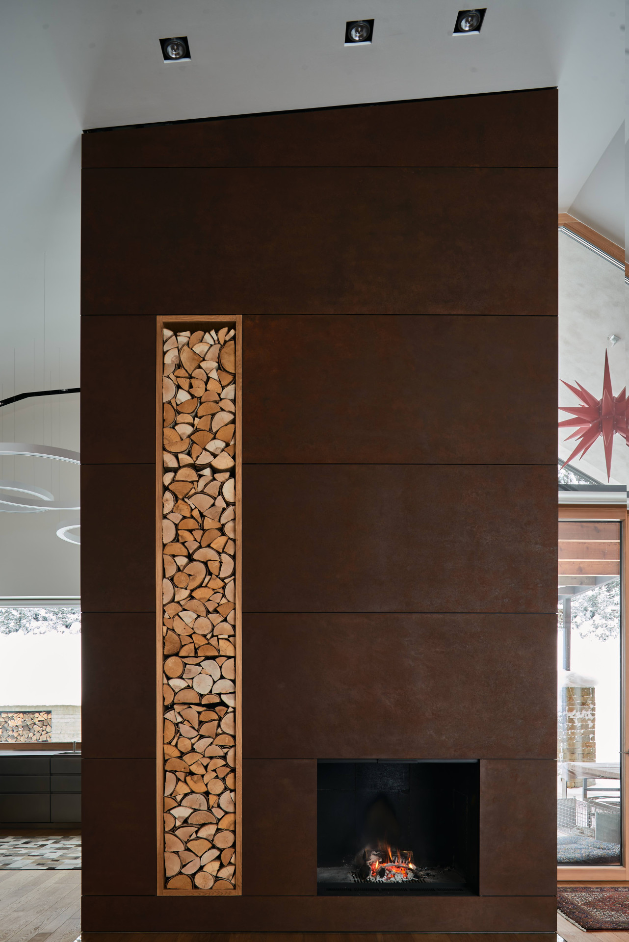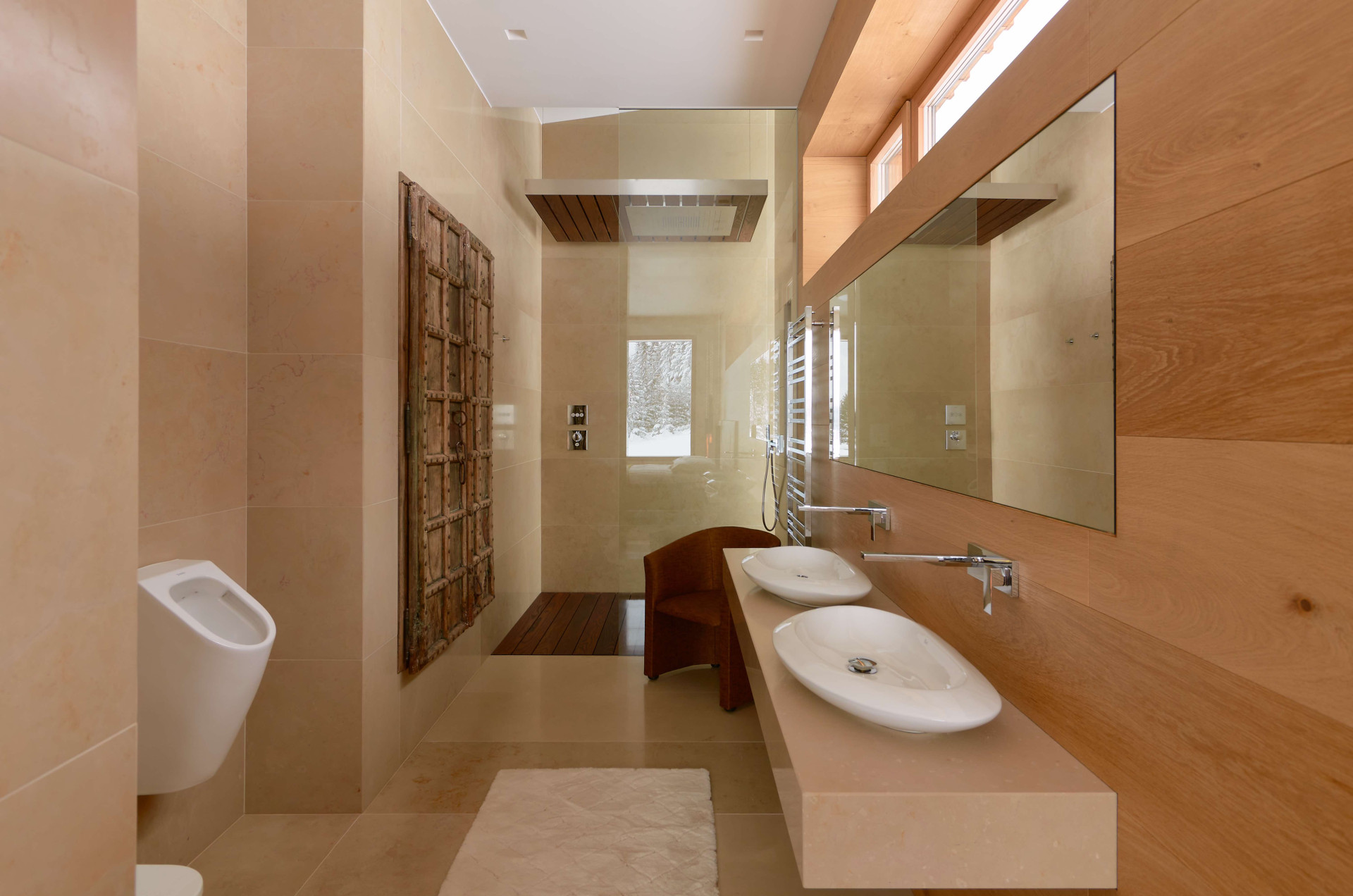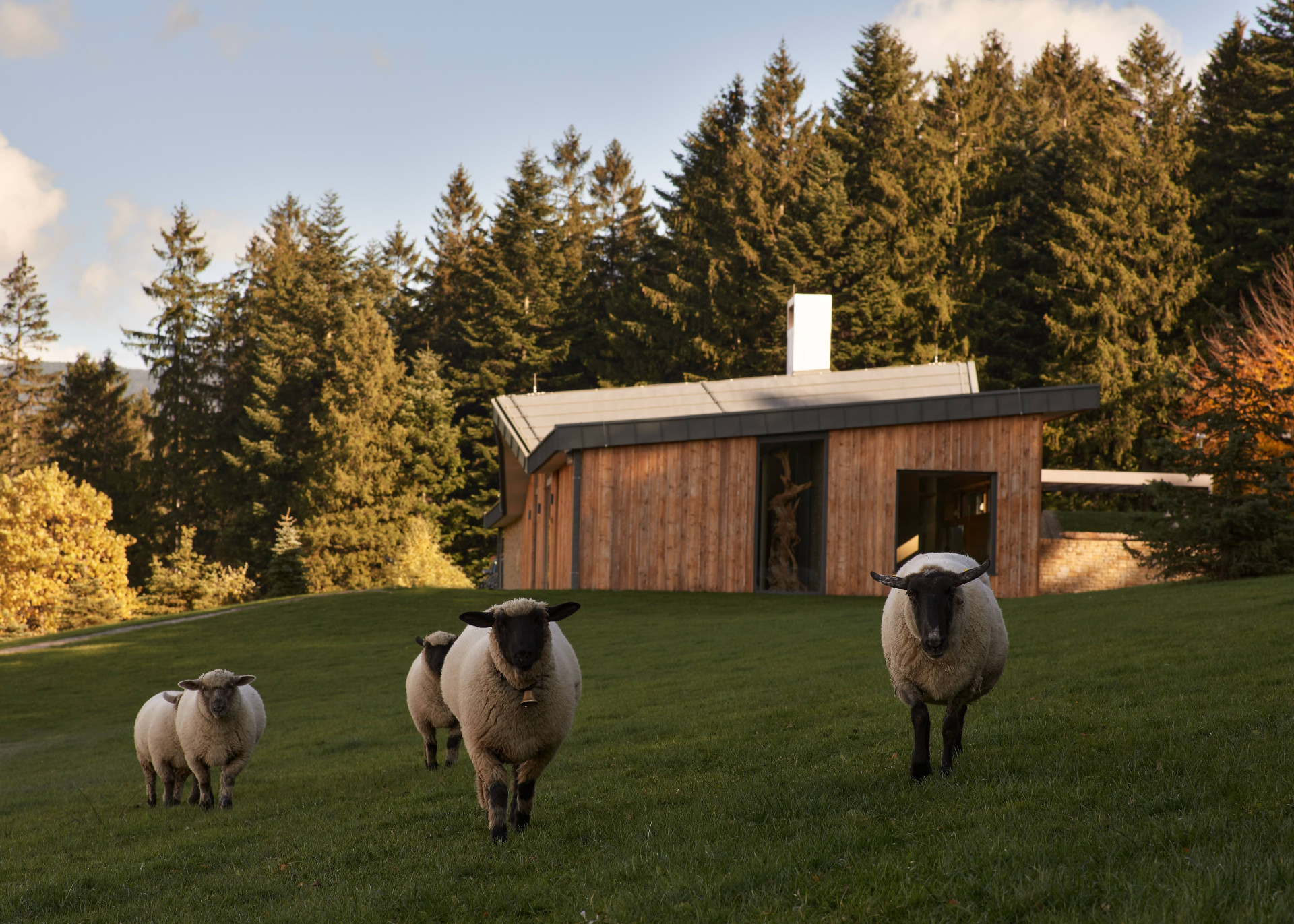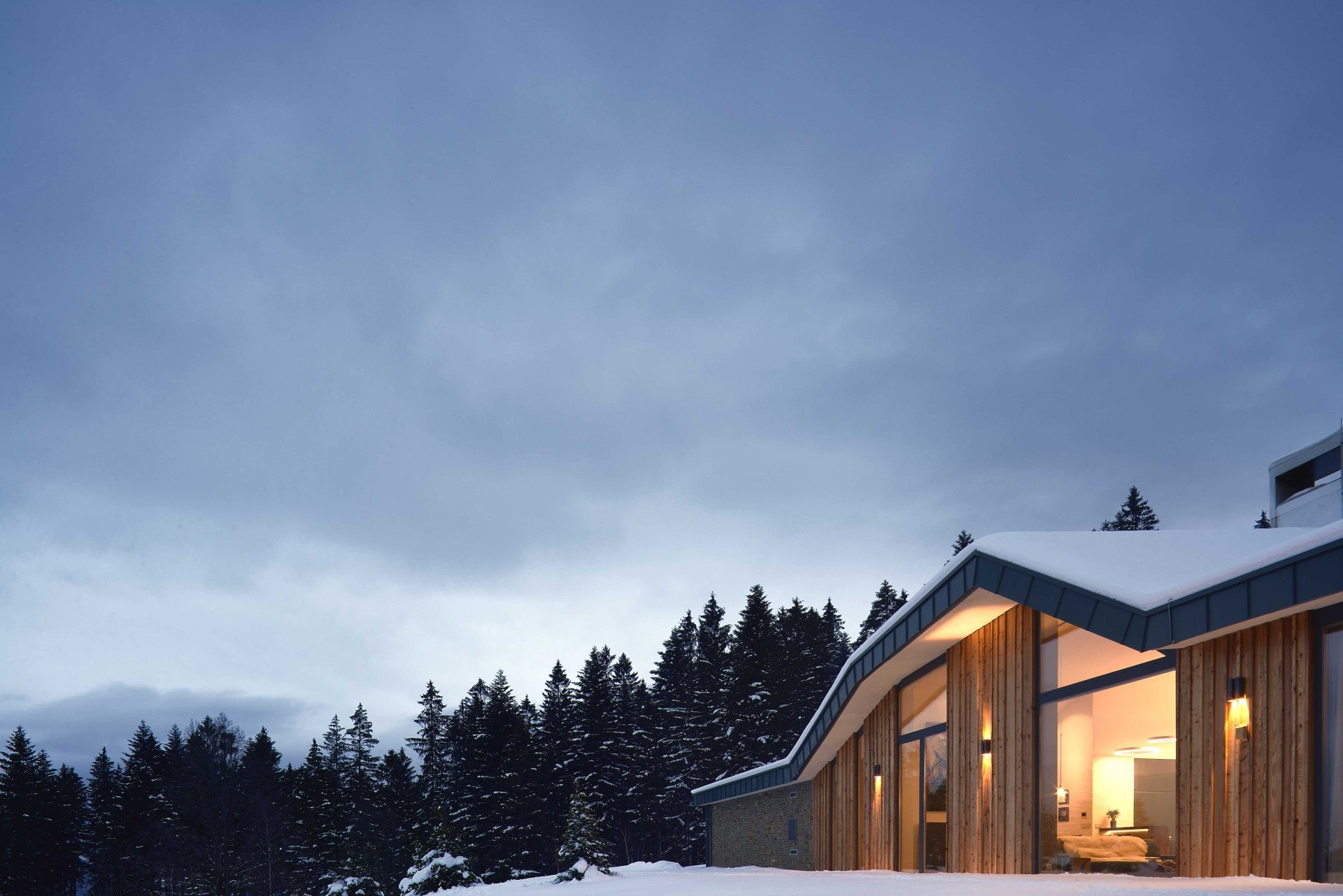 Pro stavbu bylo použito především modřínové dřevo a lokální kámen. „Modřínové kmeny byly vytěženy v lese v průběhu zimy, na několik let uloženy k proschnutí a následně zpracovány na místním stále funkčním katru z 19. století. Stejně tak tomu bylo s kamenem,“ doplňují autoři. Výraznou roli ale v realizaci hraje i sklo, majitelé si totiž přáli, aby se z interiérů otevíraly výhledy do okolní krajiny. Téměř všechny pokoje tak jsou vybaveny velkoformátovými okny, která se rozprostírají od podlahy až po strop, dosahují tak výšky až 5,5 metru. Aby vzhledem ke svým rozměrům a povětrnostním podmínkám dokázala odolat, bylo pro ně třeba najít speciální konstrukční řešení.