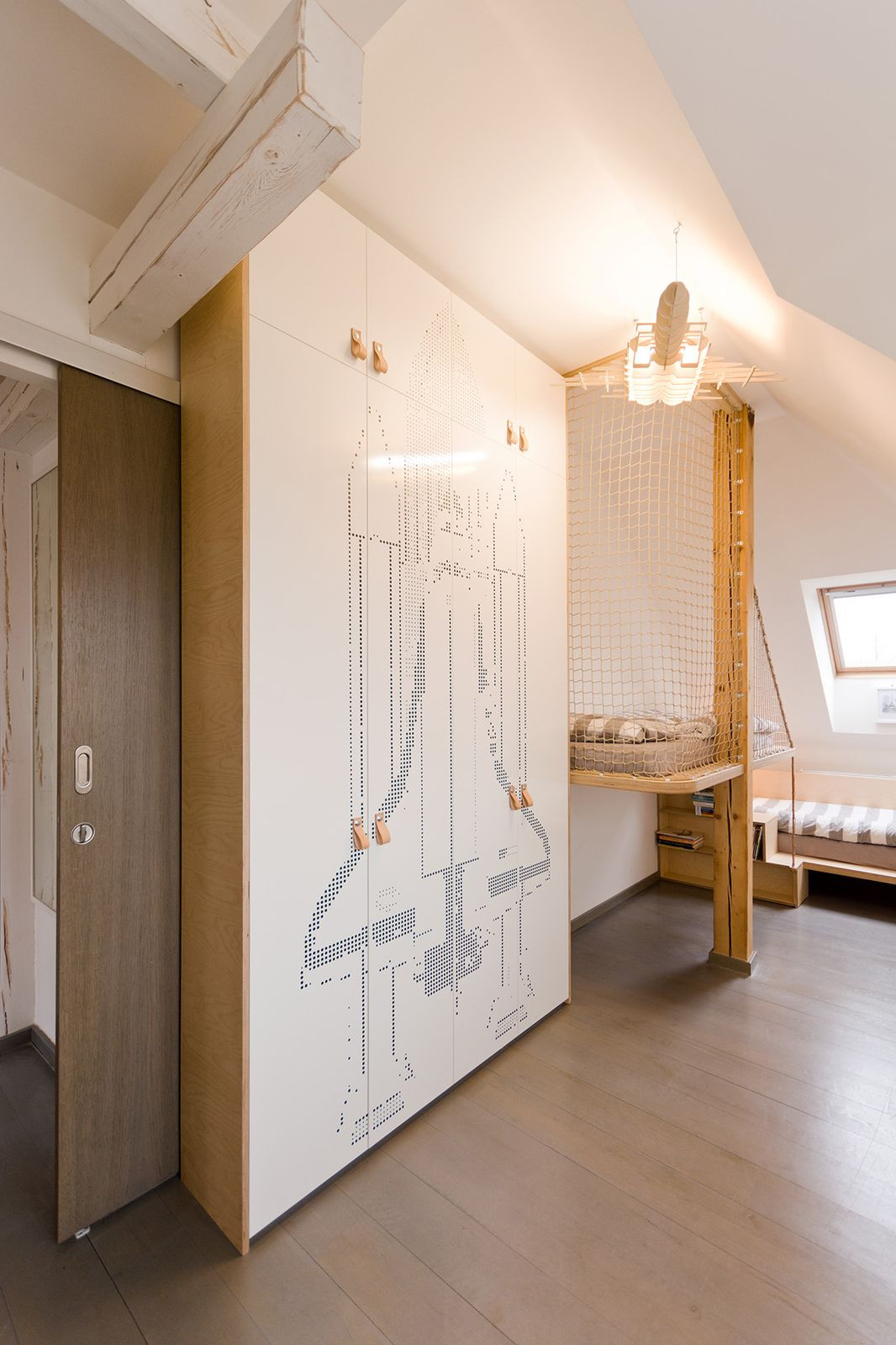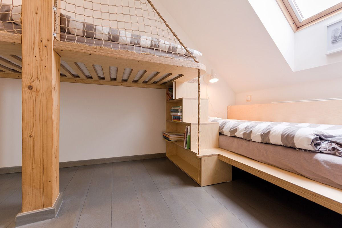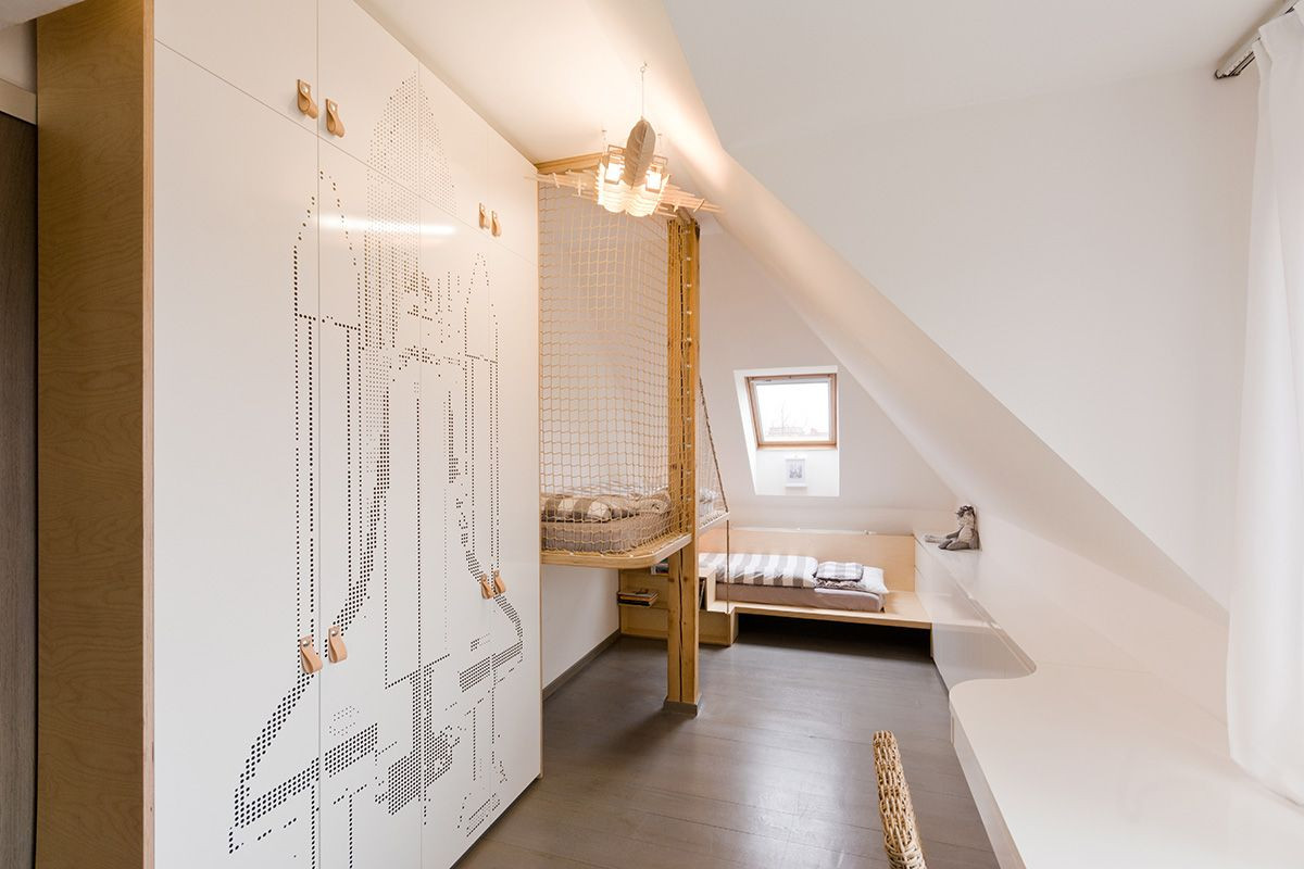 Prostorově limitovaný prostor podkrovního pokojíku si vynutil návrh atypického nábytku. V místnosti se nachází dvě postele, z nichž jedna je vyvýšená. Volný prostor pod ní může být využit jak pro další matraci na jednorázové přespání, tak jako ideální místo pro stavění bunkrů z polštářů, peřin, dek a prostěradel. A v pokročilejším věku, až mladíky takové hry omrzí, se pod postel dají umístit skladovací nábytkové kontejnery.