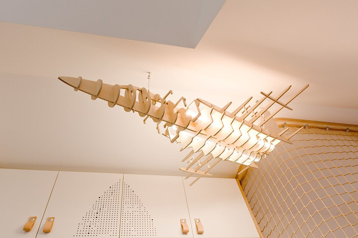 Speciálně pro kluky byl navržen i lustr – ten má designové stínidlo ve tvaru stíhacího letounu z překližky. Pokoj zdobí ještě grafika z řezané černé samolepky, znázorňující startující raketoplán.