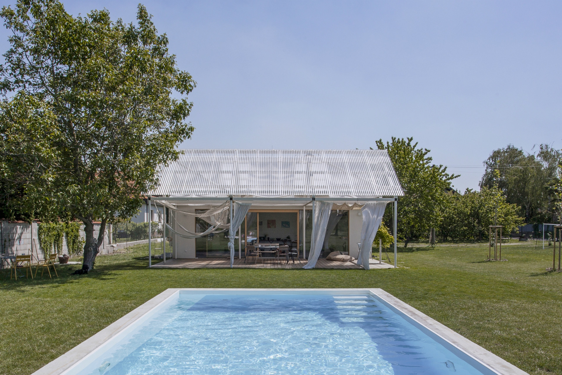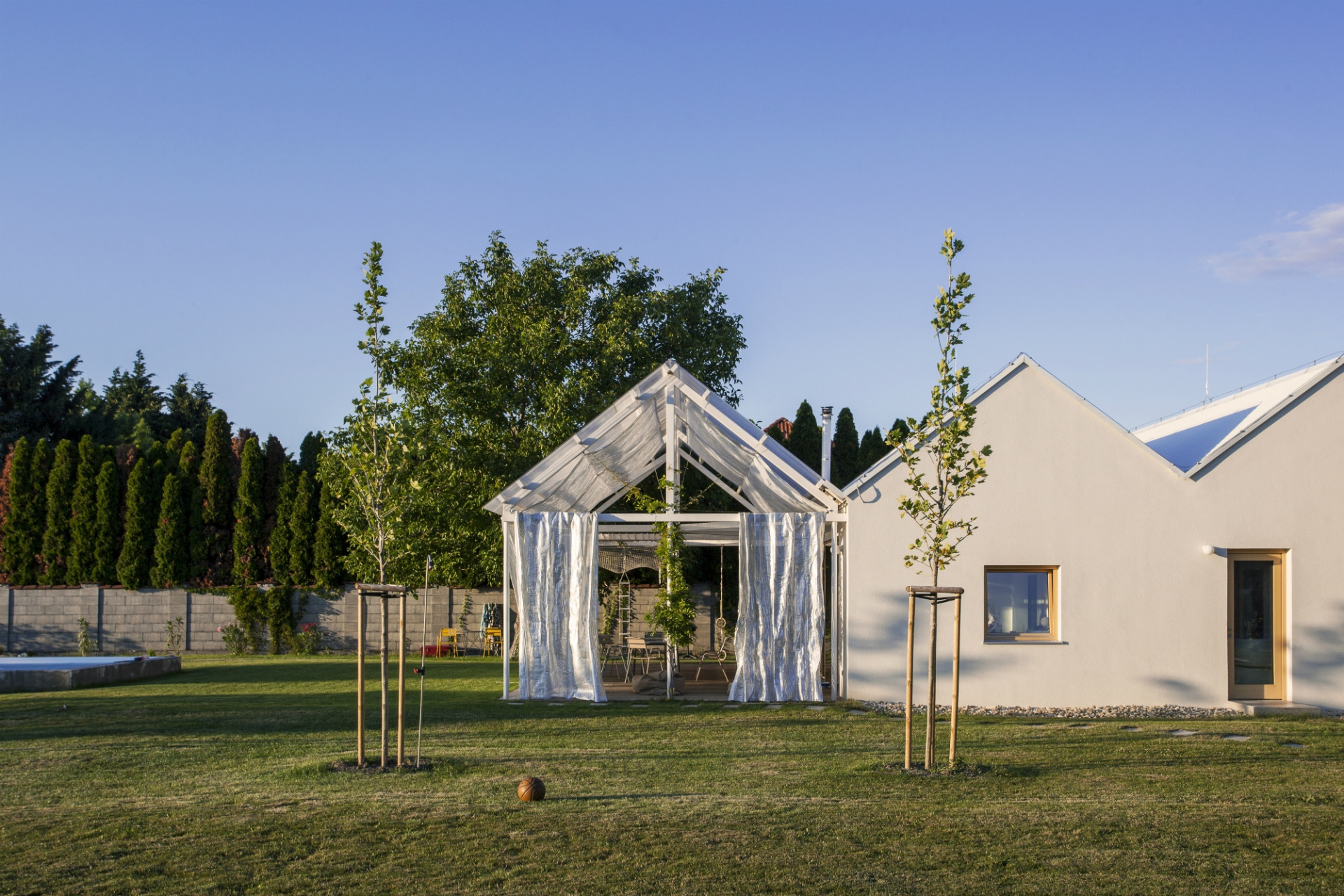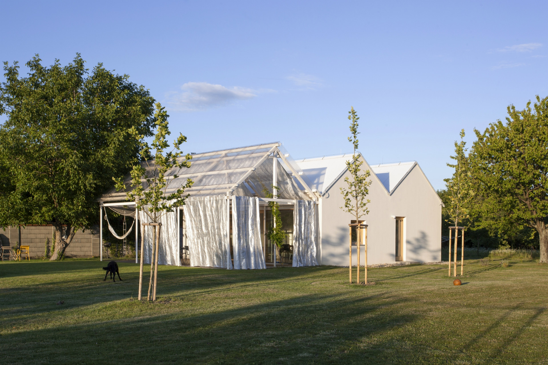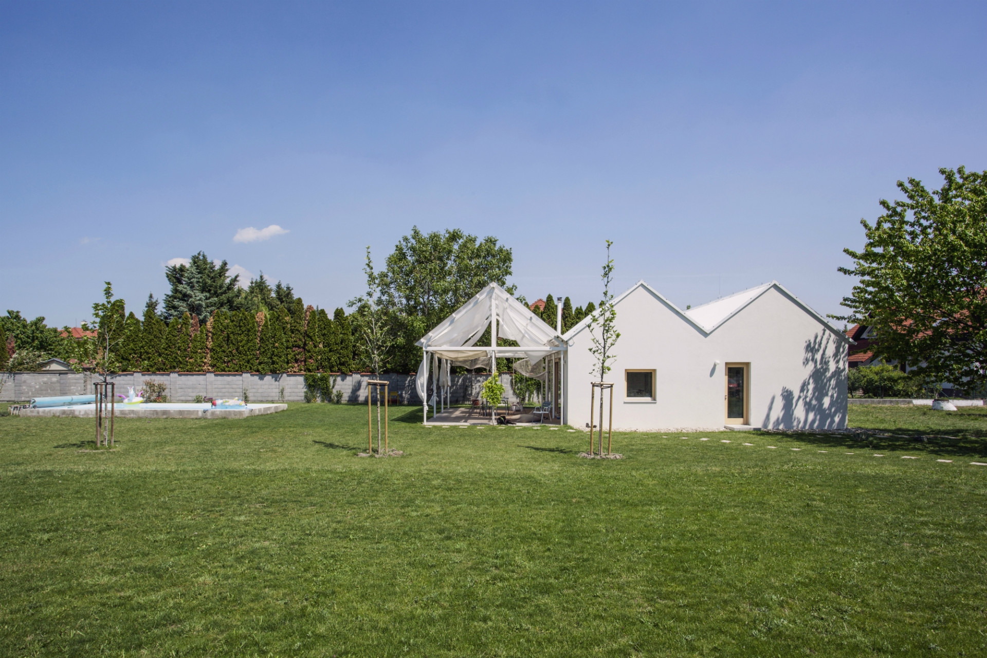 Letní dům v městské části Bratislavy Vajnory na úpatí Malých Karpat pojali slovenští architekti z ateliéru Totalstudio jako kompozici třech propojených staveb stejných proporcí a rozměrů. Zatímco ale dvě z nich představují zděné domy, poslední tvoří lehká otevřená konstrukce se zatahovatelnými reflexními závěsy, která stíní terasu u bazénu. Celý dům postrádá jakékoli chodby, do jednotlivých pokojů se vstupuje z hlavního obytného prostoru umístěného v prostřední hmotě.