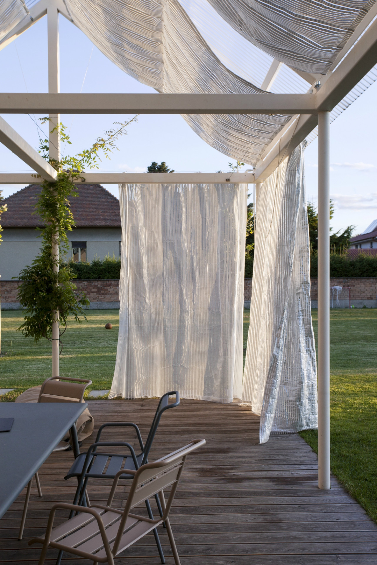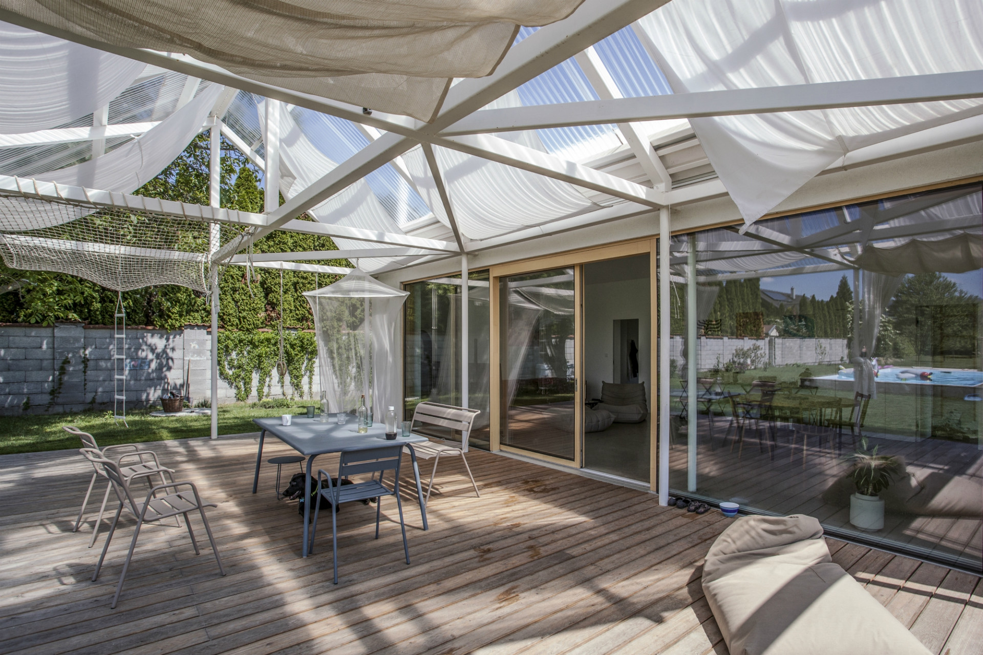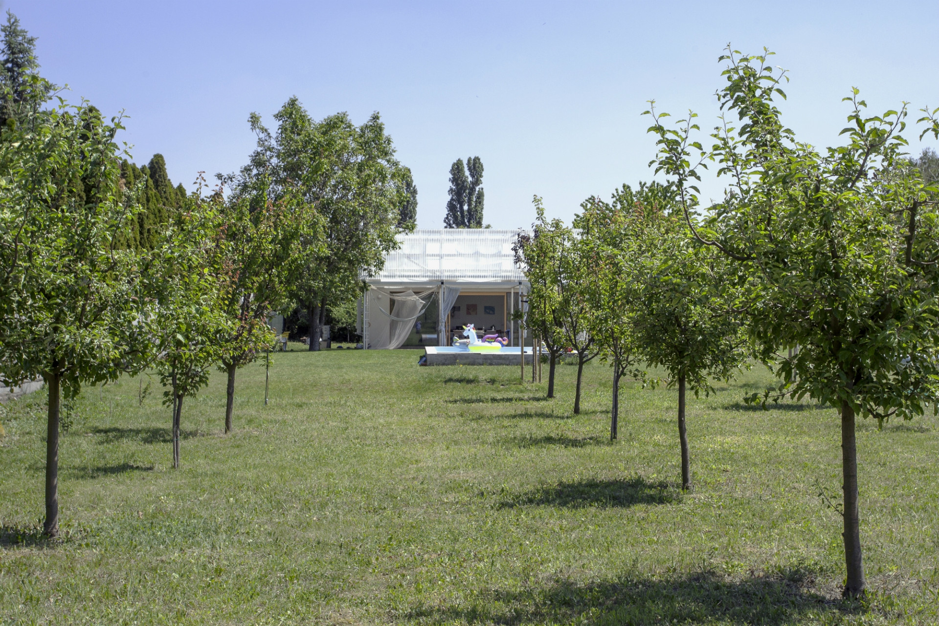 Letní dům v městské části Bratislavy Vajnory na úpatí Malých Karpat pojali slovenští architekti z ateliéru Totalstudio jako kompozici třech propojených staveb stejných proporcí a rozměrů. Zatímco ale dvě z nich představují zděné domy, poslední tvoří lehká otevřená konstrukce se zatahovatelnými reflexními závěsy, která stíní terasu u bazénu. Celý dům postrádá jakékoli chodby, do jednotlivých pokojů se vstupuje z hlavního obytného prostoru umístěného v prostřední hmotě.