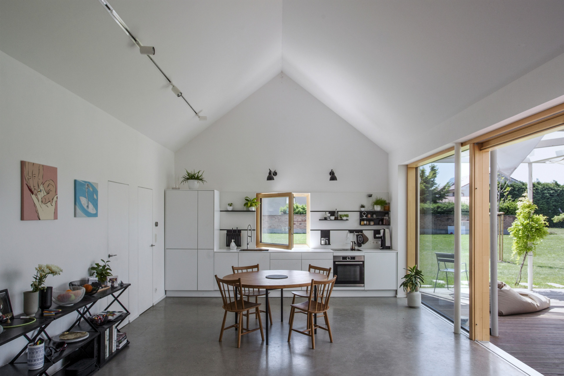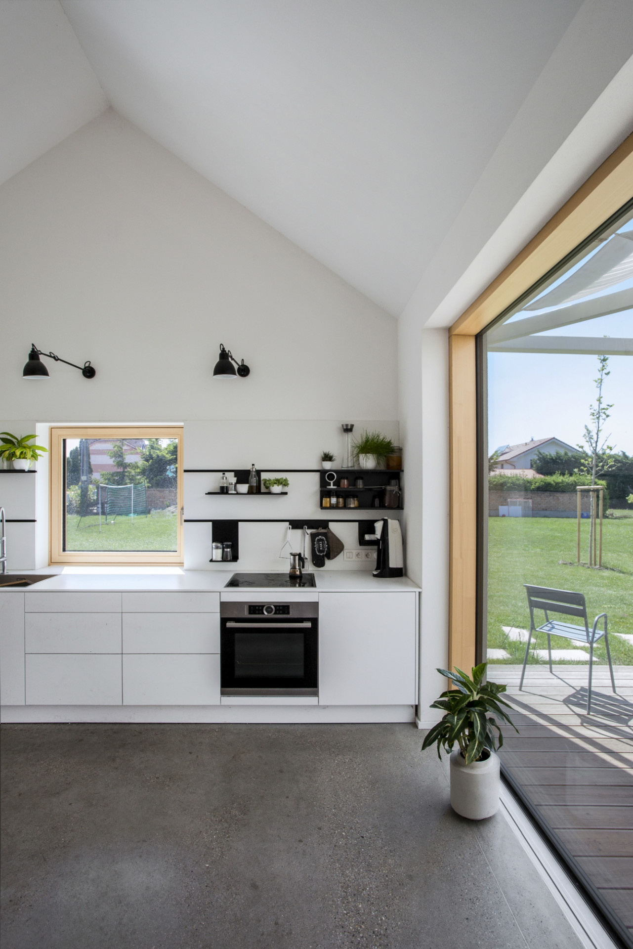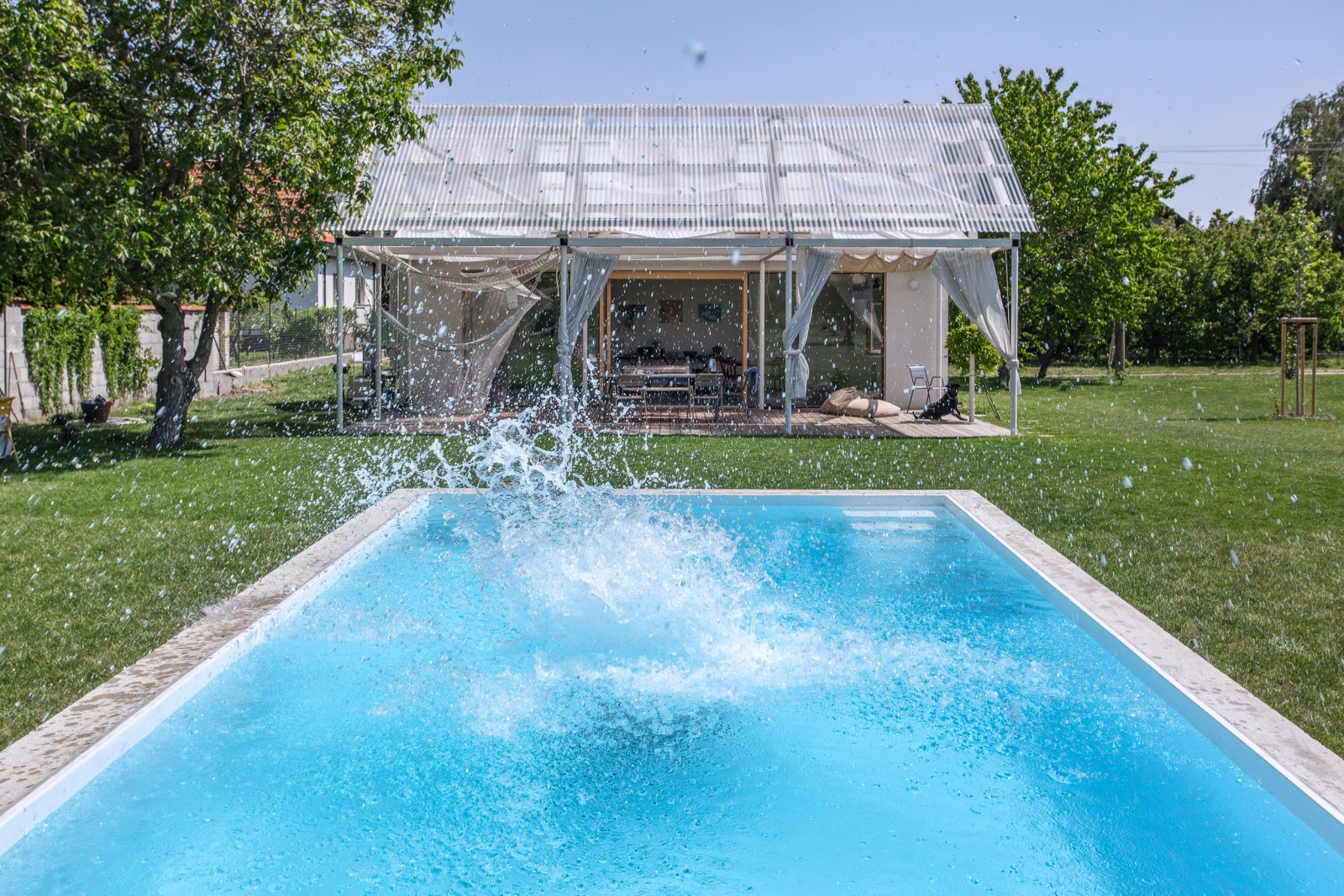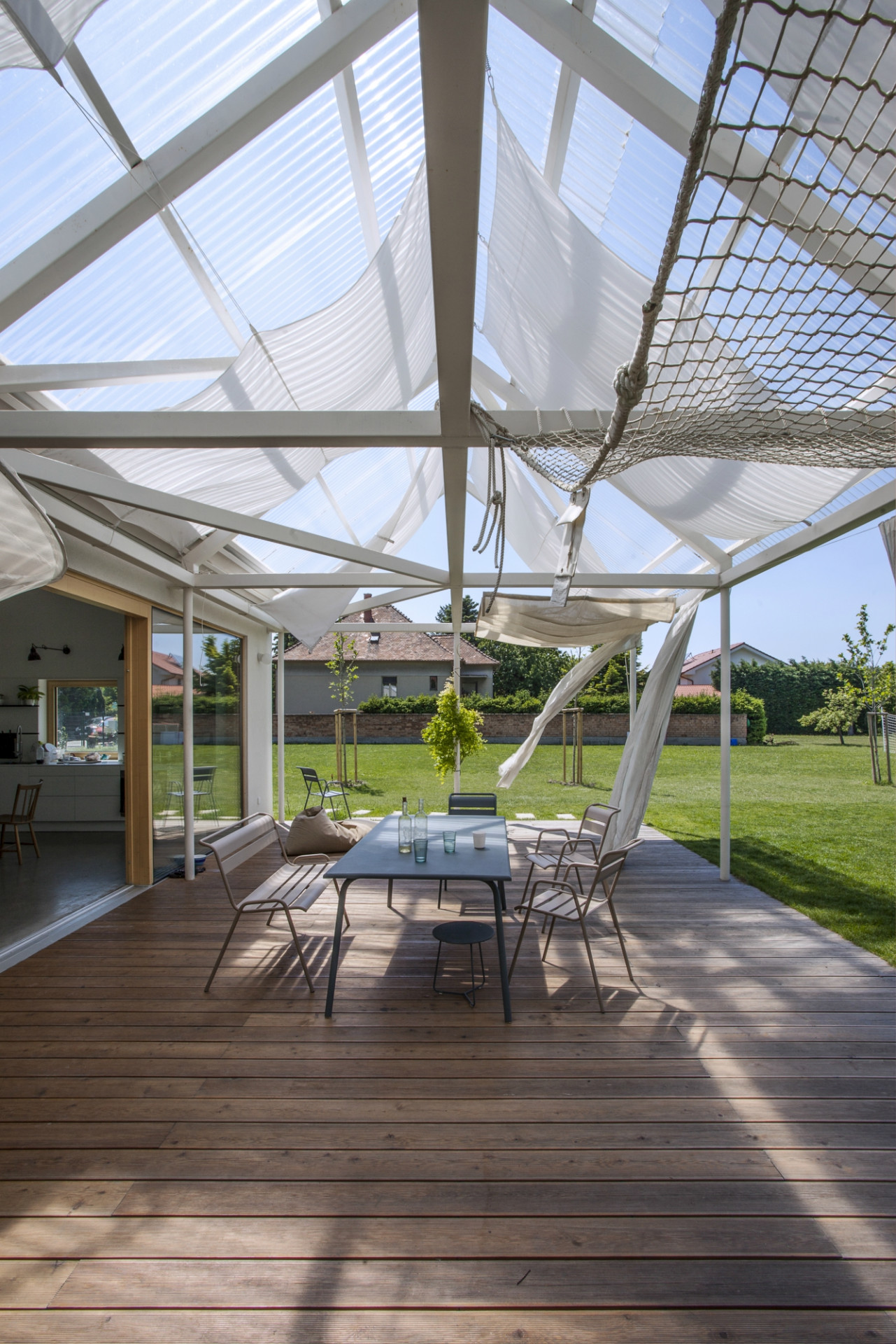 Letní dům v městské části Bratislavy Vajnory na úpatí Malých Karpat pojali slovenští architekti z ateliéru Totalstudio jako kompozici třech propojených staveb stejných proporcí a rozměrů. Zatímco ale dvě z nich představují zděné domy, poslední tvoří lehká otevřená konstrukce se zatahovatelnými reflexními závěsy, která stíní terasu u bazénu. Celý dům postrádá jakékoli chodby, do jednotlivých pokojů se vstupuje z hlavního obytného prostoru umístěného v prostřední hmotě.