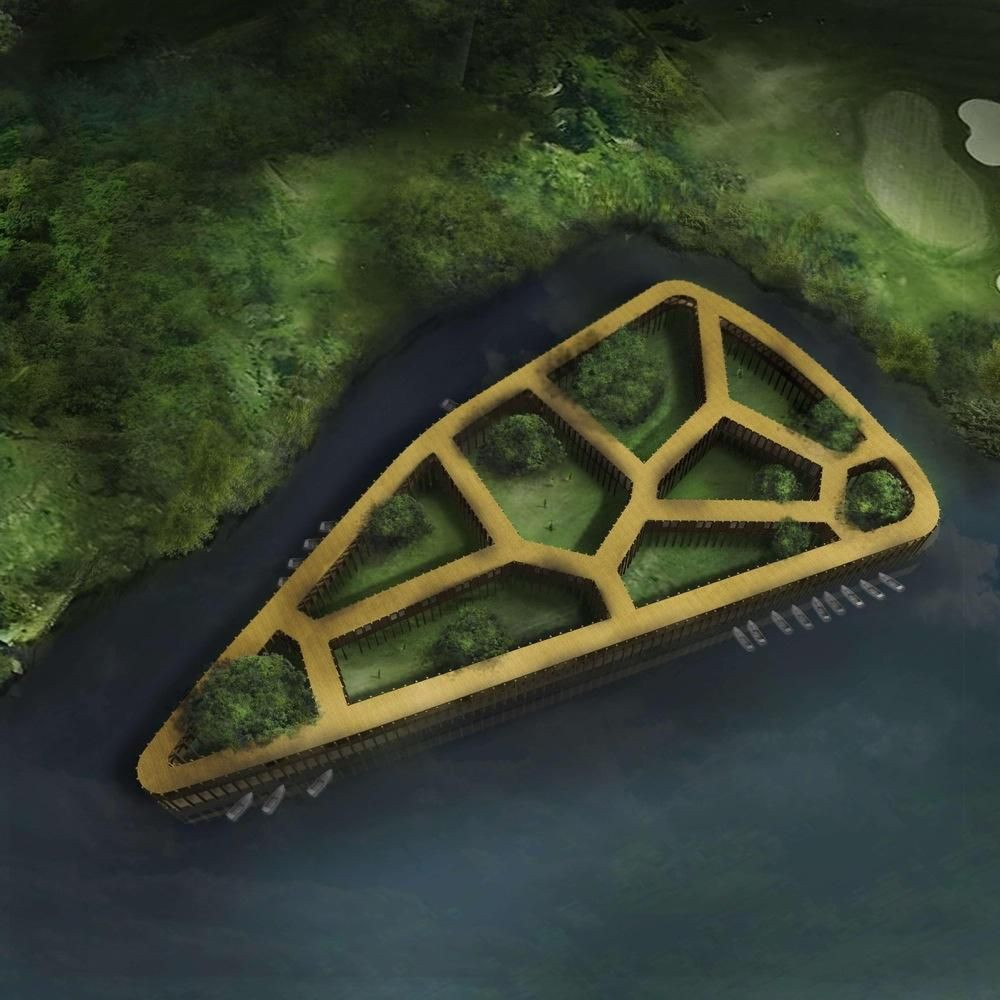 Ostrov terapeutické komunity slouží jako pobytové resocializační zařízení určené lidem, kteří jsou závislí na užívání návykových látek. Tvar je získán pomocí Voroného diagramu, který původně rozvrhoval pouze cesty, které jsou neseny dřevěnými sloupy čtyři metry nad zemí a na nichž posléze vznikla samotná stavba. Konstrukce umožňuje klientům využívat celou plochu ostrova k pracovní terapii či relaxaci, interiéry se nacházejí v úrovni korun stromů.