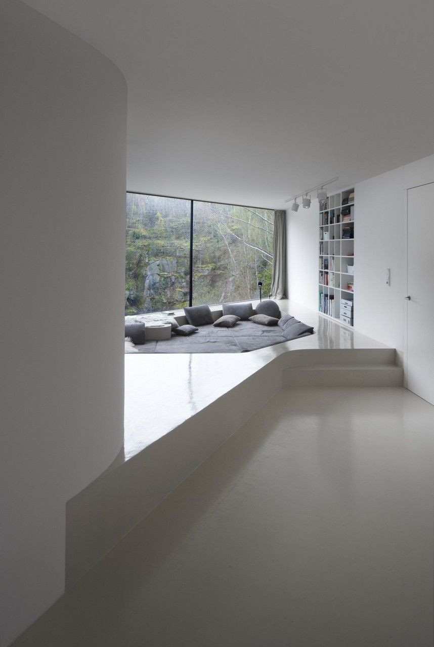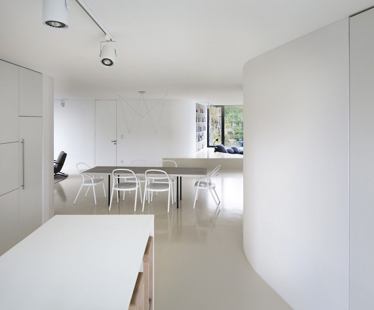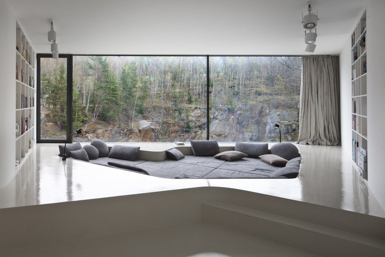 Proměnlivou barevnost výhledů nechává vyniknout monochromaticky bílý interiér, který funguje jako jeden promyšlený celek. Nikde nic nevyčnívá, není tu nic nepodstatného navíc. Nábytek je rozmístěn jako funkční součást obytného prostoru, nestrhává na sebe zbytečnou pozornost. Středobod představuje obývací pokoj s odpočinkovou zónou zasazenou do vyvýšeného pódia, odkud je vidět to nejlepší z okolní krajiny jako na dlani. Důraz je kladen spíše na organicky řešenou kompozici prostoru než na samotné předměty. Právě díky celistvosti a otevřenosti bylo dosaženo krásně prosvětleného interiéru s měkkými oblými křivkami.