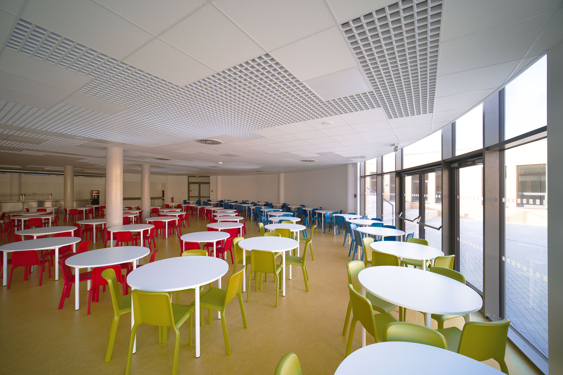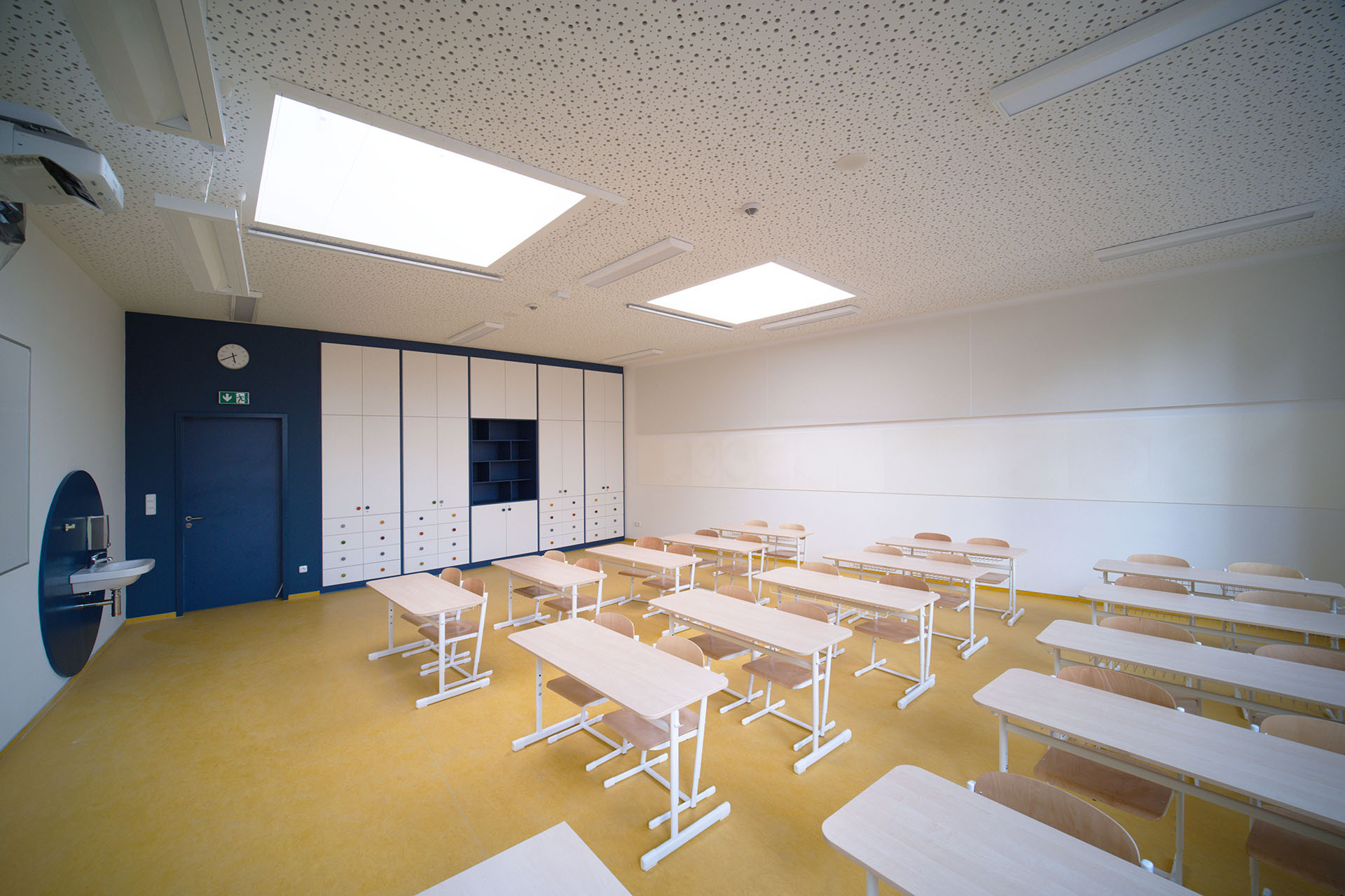 V interiéru budovy byly využity akustické sádrokartonové desky Rigitone, které díky své perforaci zajišťují pohlcování zvuku a zároveň díky technologii Activ‘Air® aktivně čistí vzduch od škodlivého formaldehydu, který může obsahovat některé vybavení. Vizuálně nenápadné, ale technicky velmi účinné panely přispívají k celkové akustické kvalitě prostor – zejména v učebnách a dalších společných místnostech. Estetická kvalita desek s jemnou perforací navíc koresponduje s čistou a střídmou architekturou pavilonu.