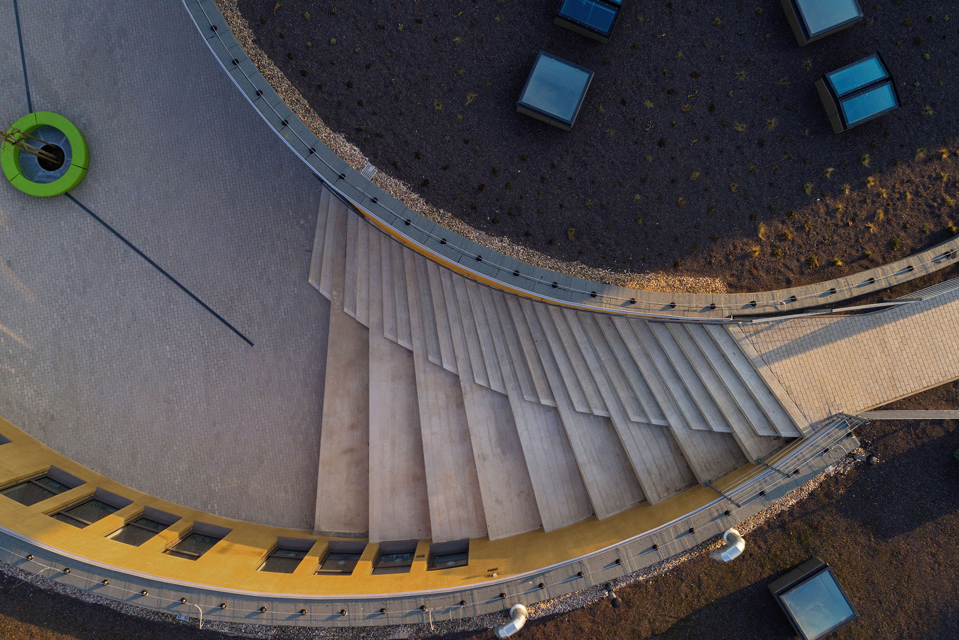 Stavba na první pohled zaujme svým kruhovým půdorysem. „Motiv kruhu se opakovaně objevuje v celém areálu školy – v původním Rondelu (pavilon ZŠ z roku 2015 od studia Projektil), dopravním hřišti, dřevěném podiu nebo parkovém bludišti,“ vysvětluje David Grulich, jehož ateliér budovu navrhl.