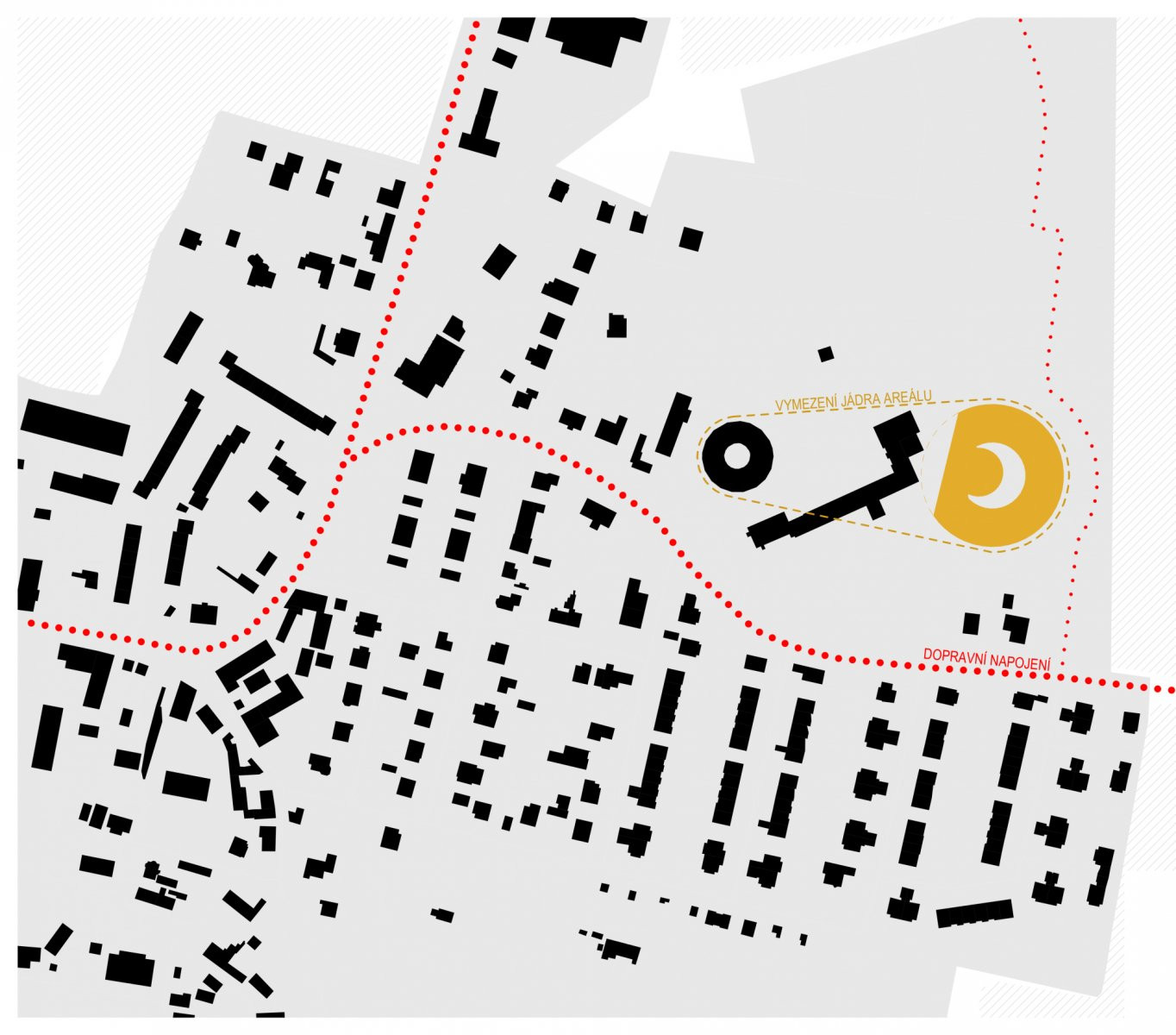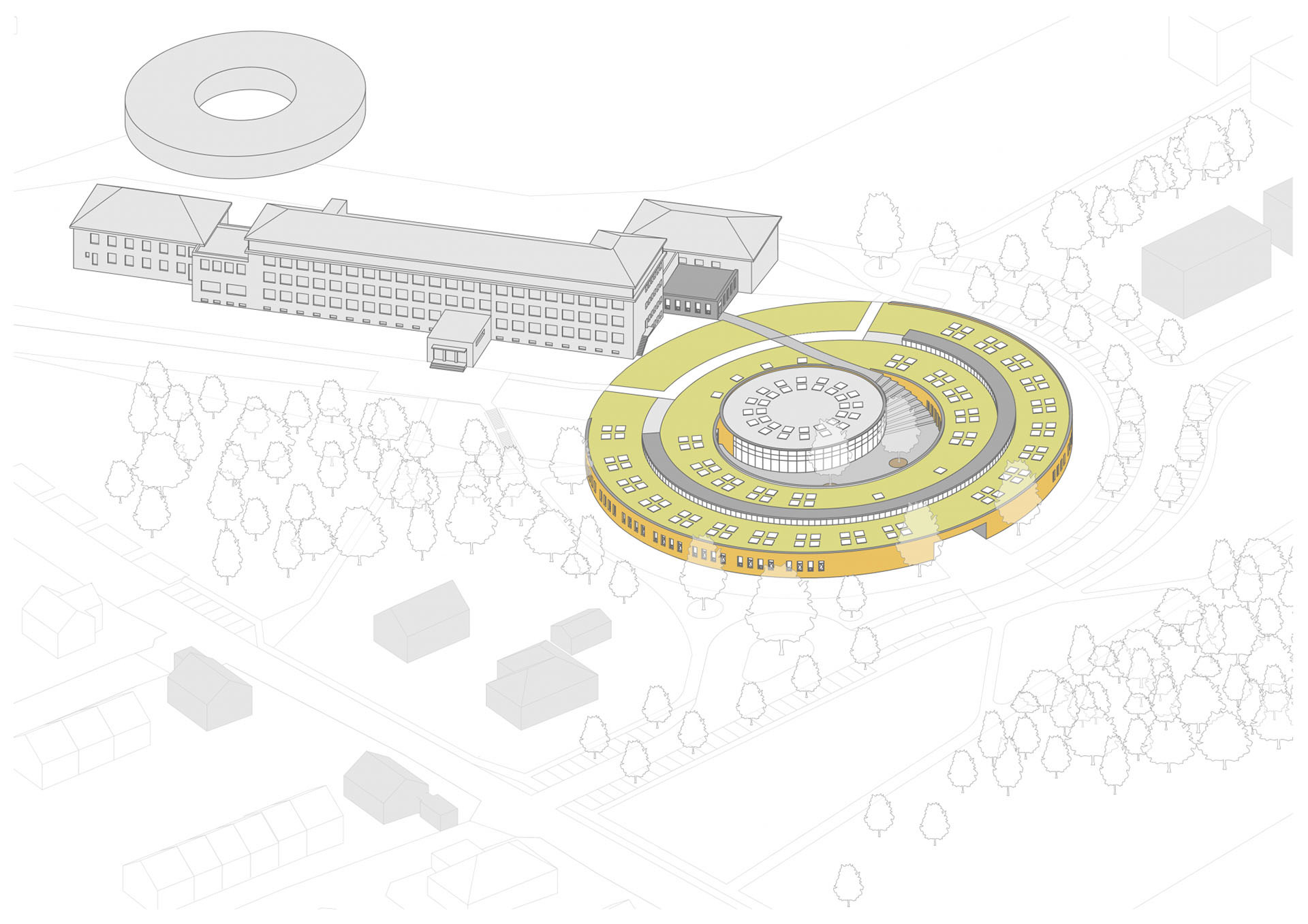 Umístění pavilonu na východním okraji areálu, na dotek plánovaného zeleného prstence kolem obce, uzavírá školní areál do jasně definovaného celku. Architekti sem umístili nový bod, který celou kompozici sceluje a zároveň respektuje historickou budovu školy, jež zůstává díky výškové gradaci dominantou celého areálu.
