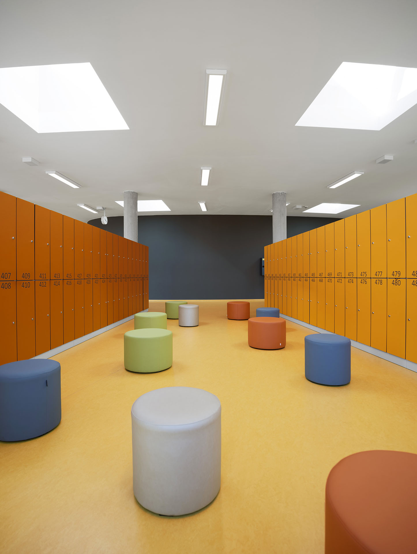 Středobod budovy tvoří venkovní atrium, které slouží dětem jako bezpečný prostor pro volný pohyb i místo odpočinku, a díky víceúčelovému schodišti se propojuje s přilehlou tělocvičnou. Bezbariérový návrh, efektivní provozní logika, nízká energetická náročnost a promyšlené napojení na okolní parkové a dopravní struktury dávají stavbě nadstandardní architektonickou i urbanistickou hodnotu.